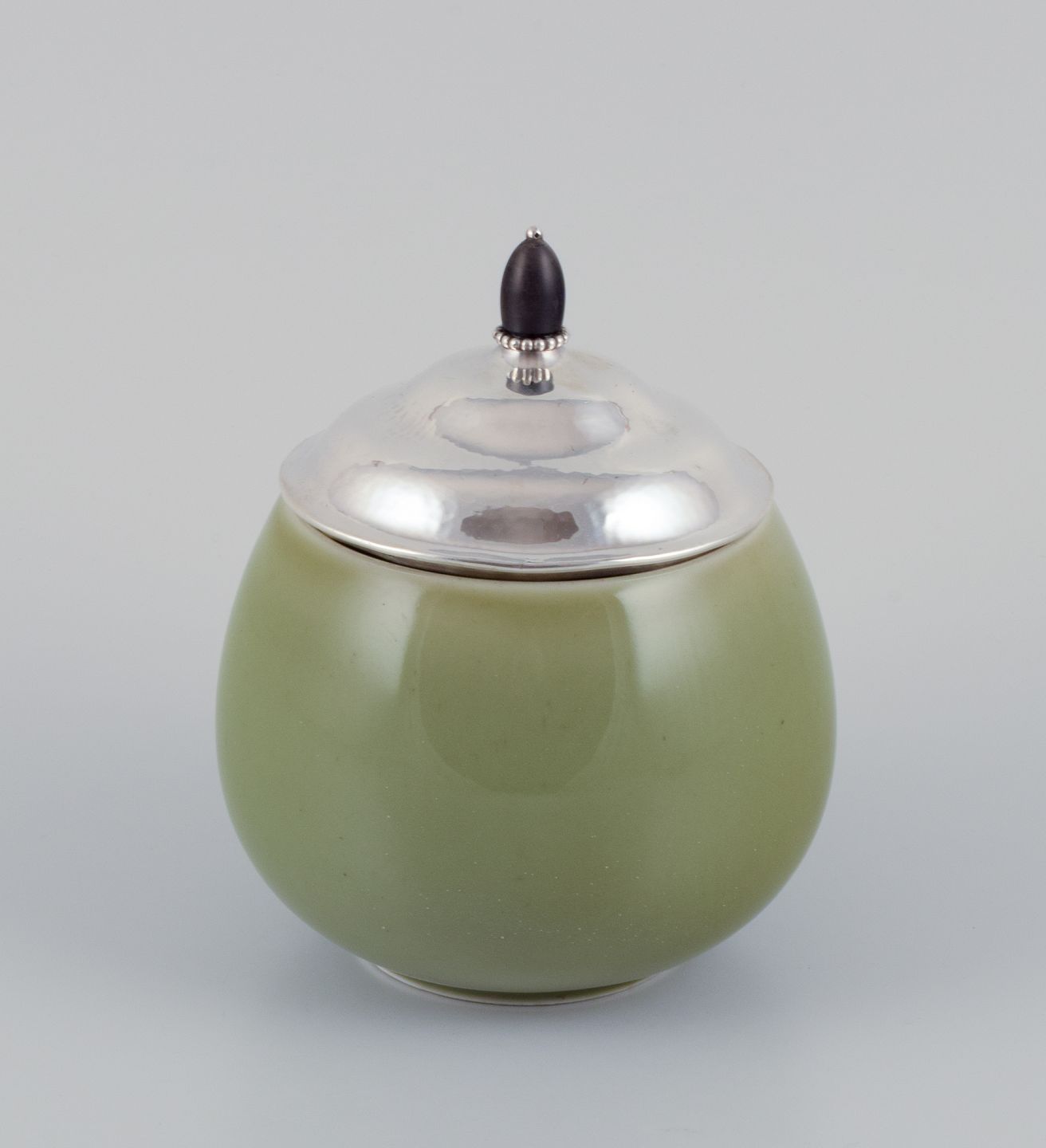 Royal Copenhagen keramik lågkrukke. Sølvlåg med knop i ibenholt.