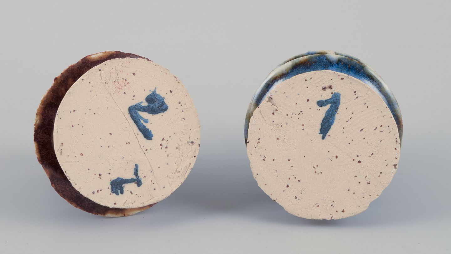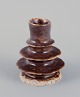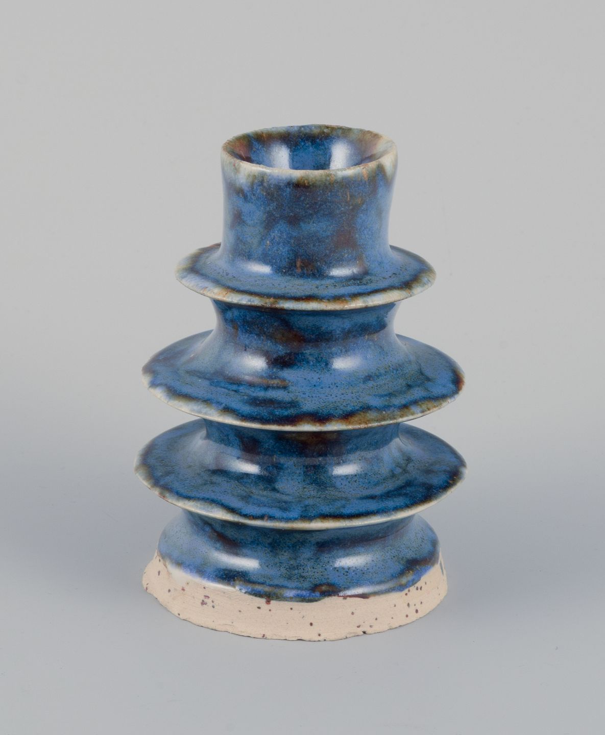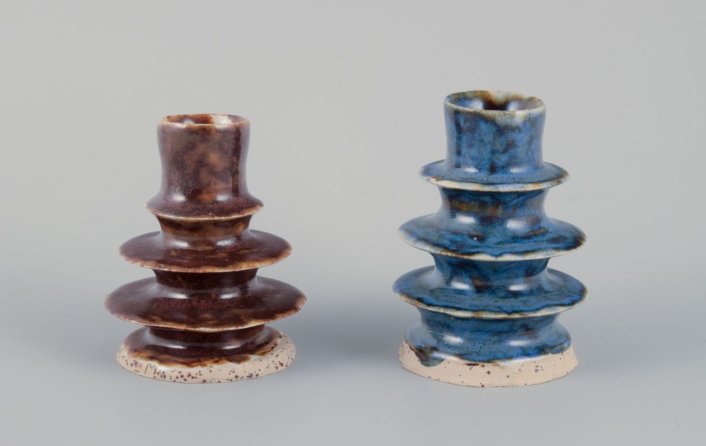 Europæisk studiokeramiker. To unika keramik lysestager. Glasur i blå og brune nuancer. Ca. 1980’erne. Signeret MR. Perfekt stand. Blå: H 9,8 cm. x D 6,8 cm.