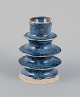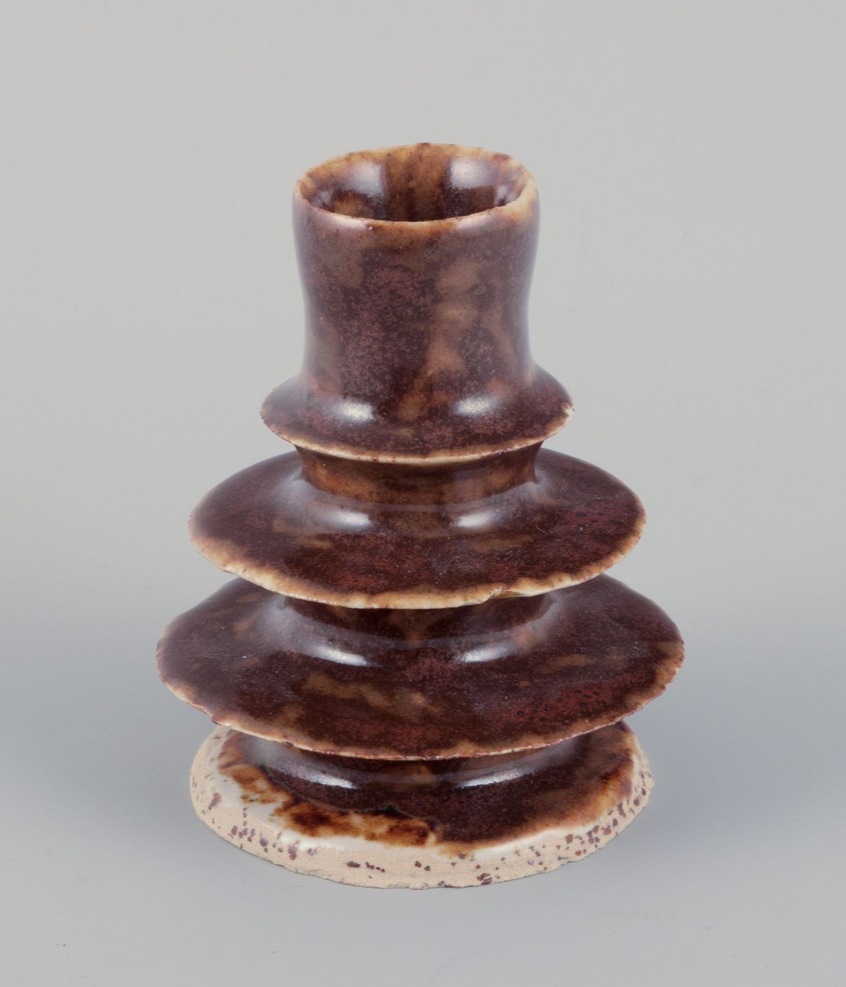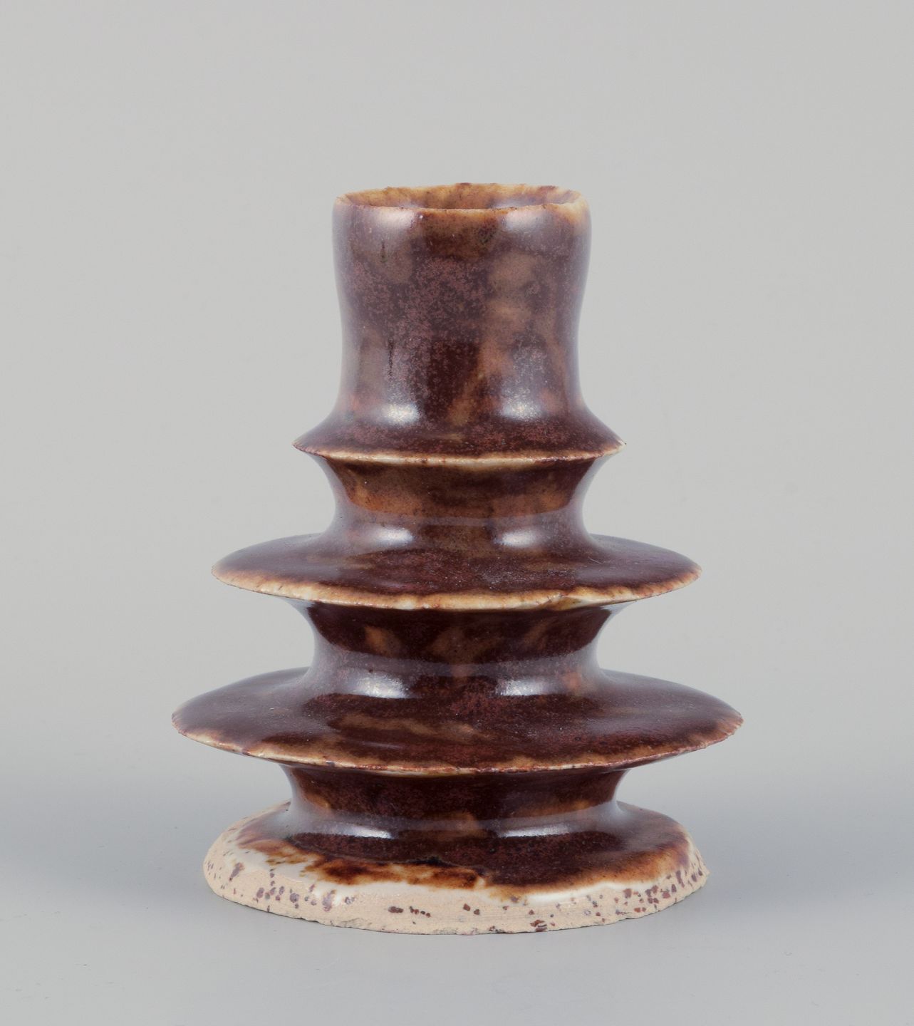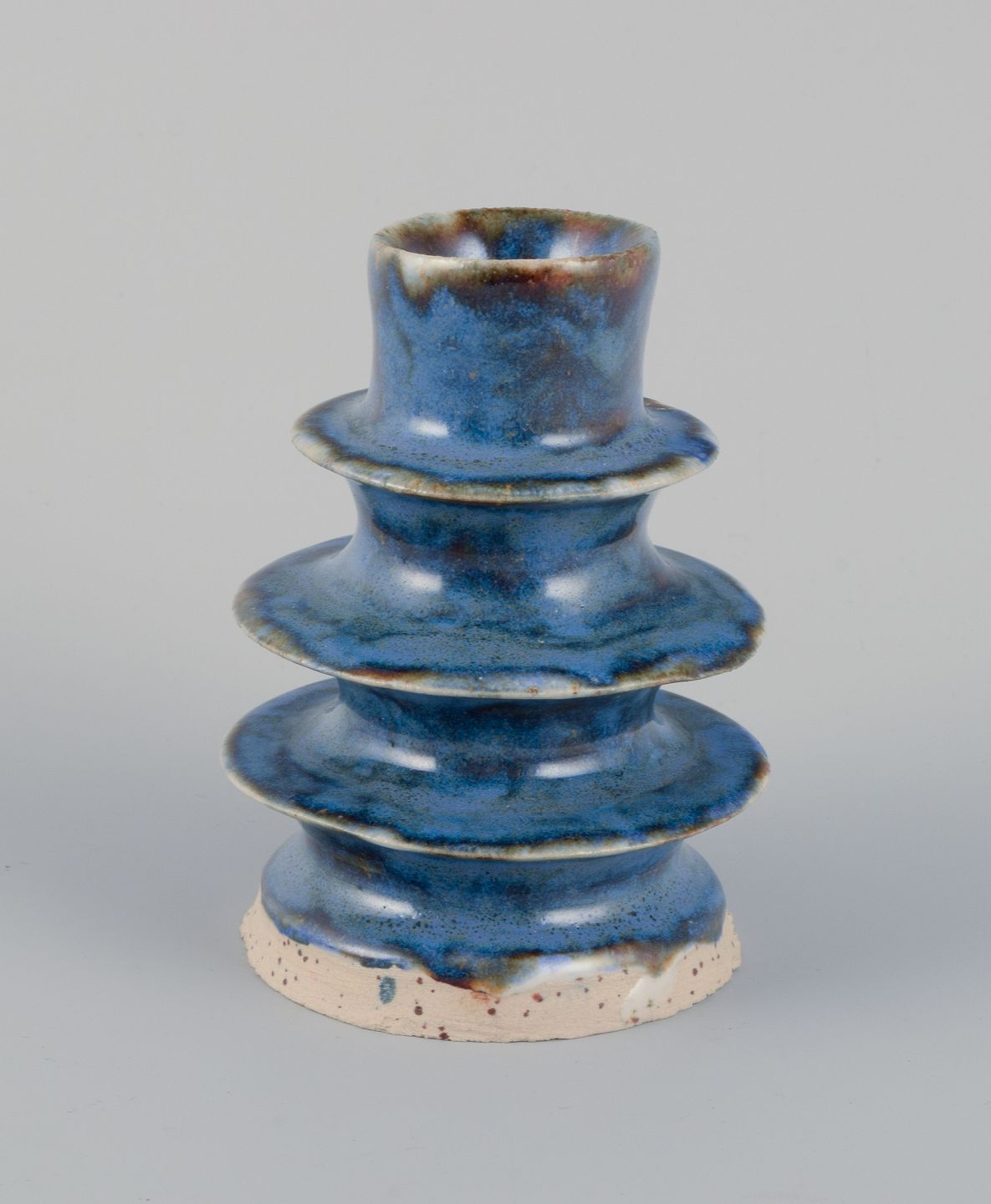 Europæisk studiokeramiker. To unika keramik lysestager. Glasur i blå og brune nuancer. Ca. 1980’erne. Signeret MR. Perfekt stand. Blå: H 9,8 cm. x D 6,8 cm.