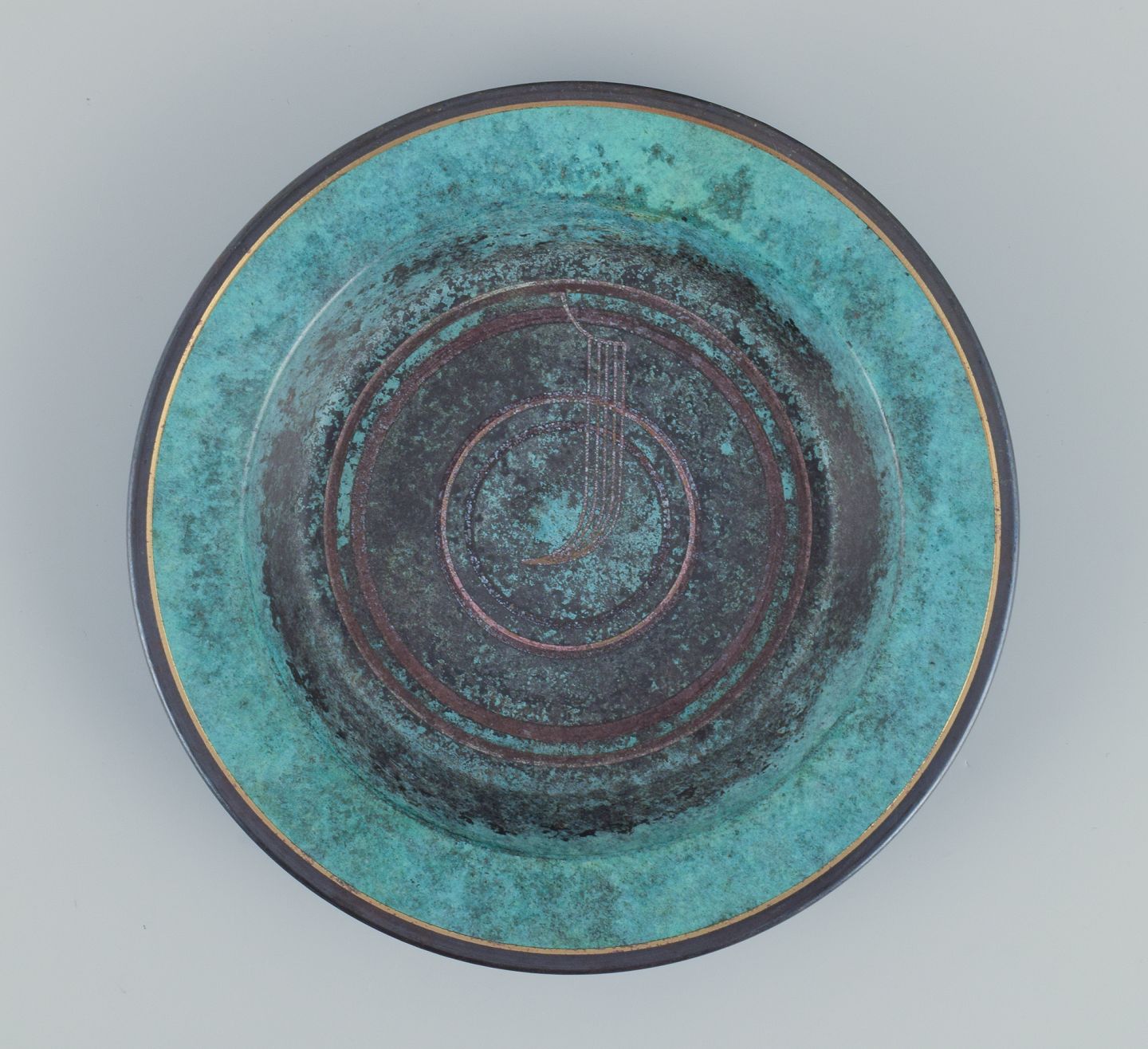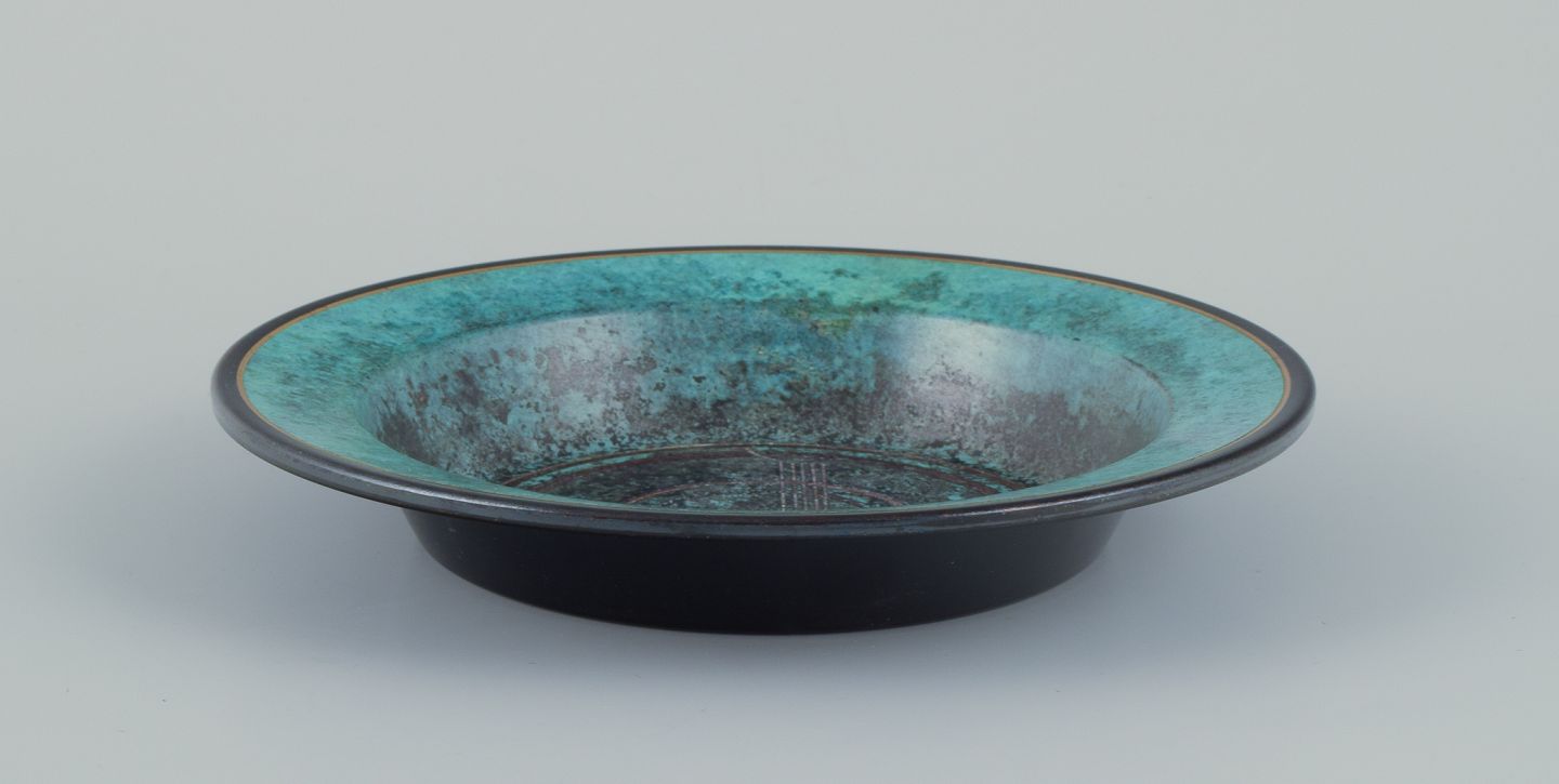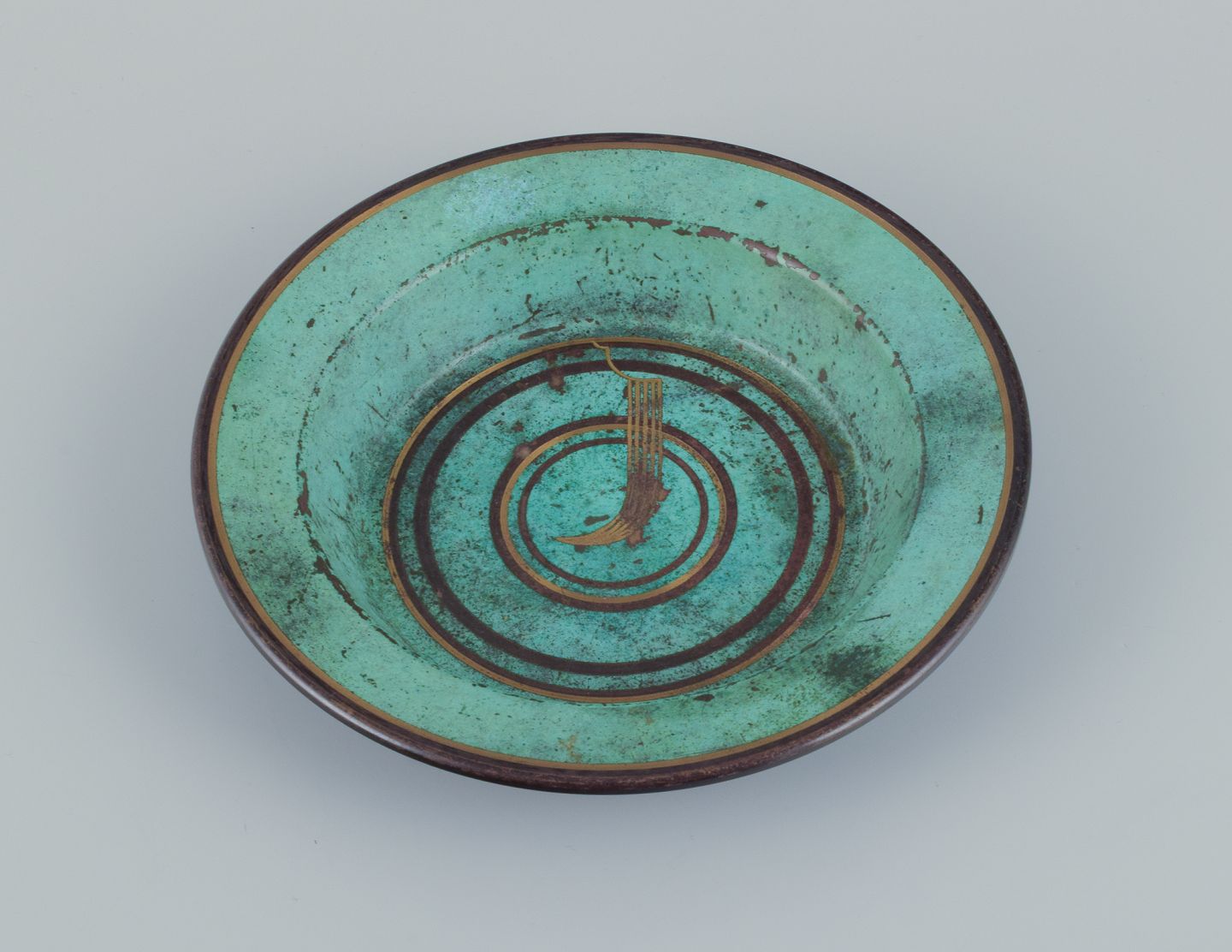 WMF (Württembergische Metallwarenfabrik), Tyskland. To Art Deco ”Ikora” skåle. Smuk grøn patina. Abstrakt motiv. 1940’erne. Stemplet. I flot stand. Mål: D 17,5 cm. x H 3,0 cm.