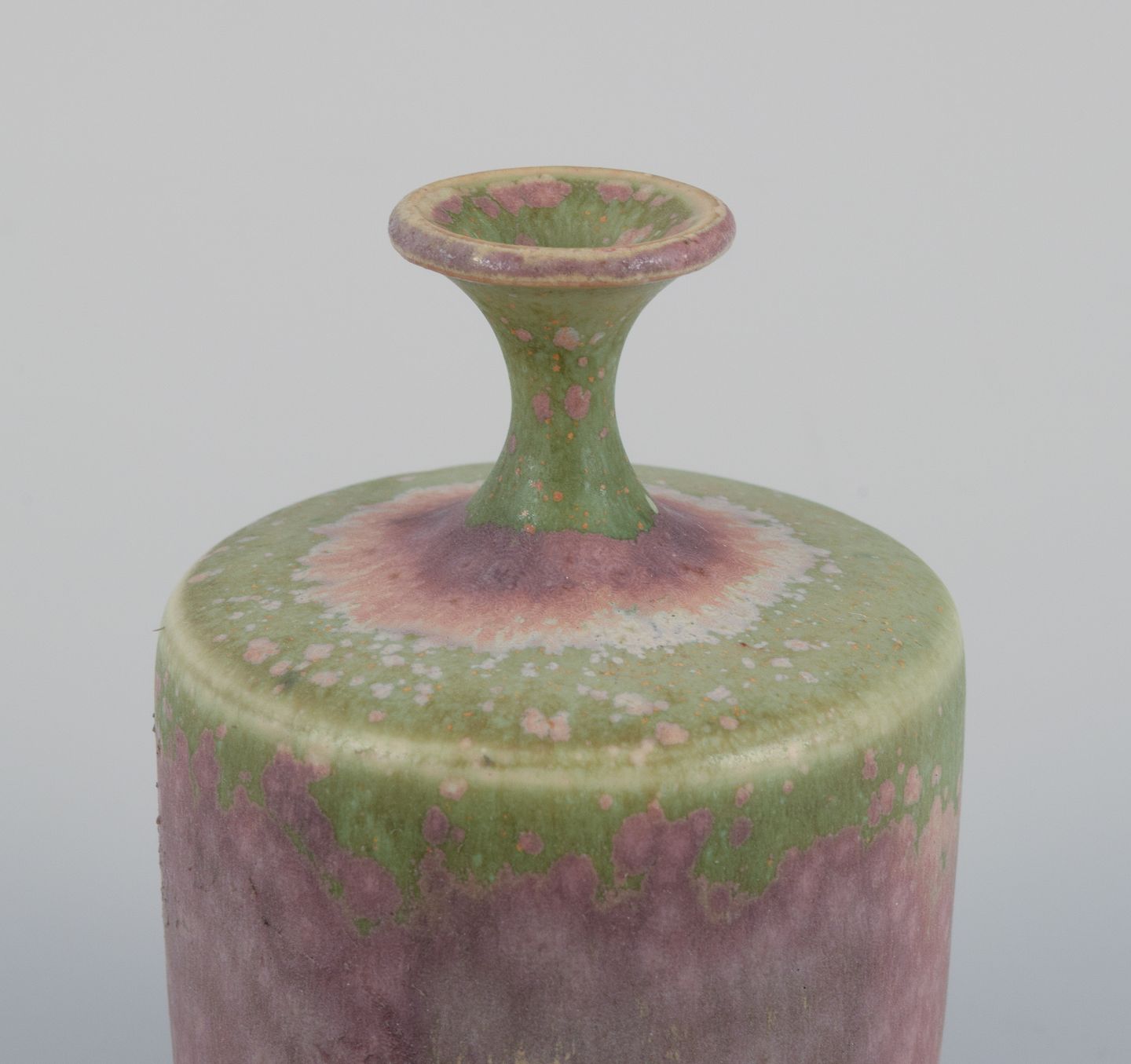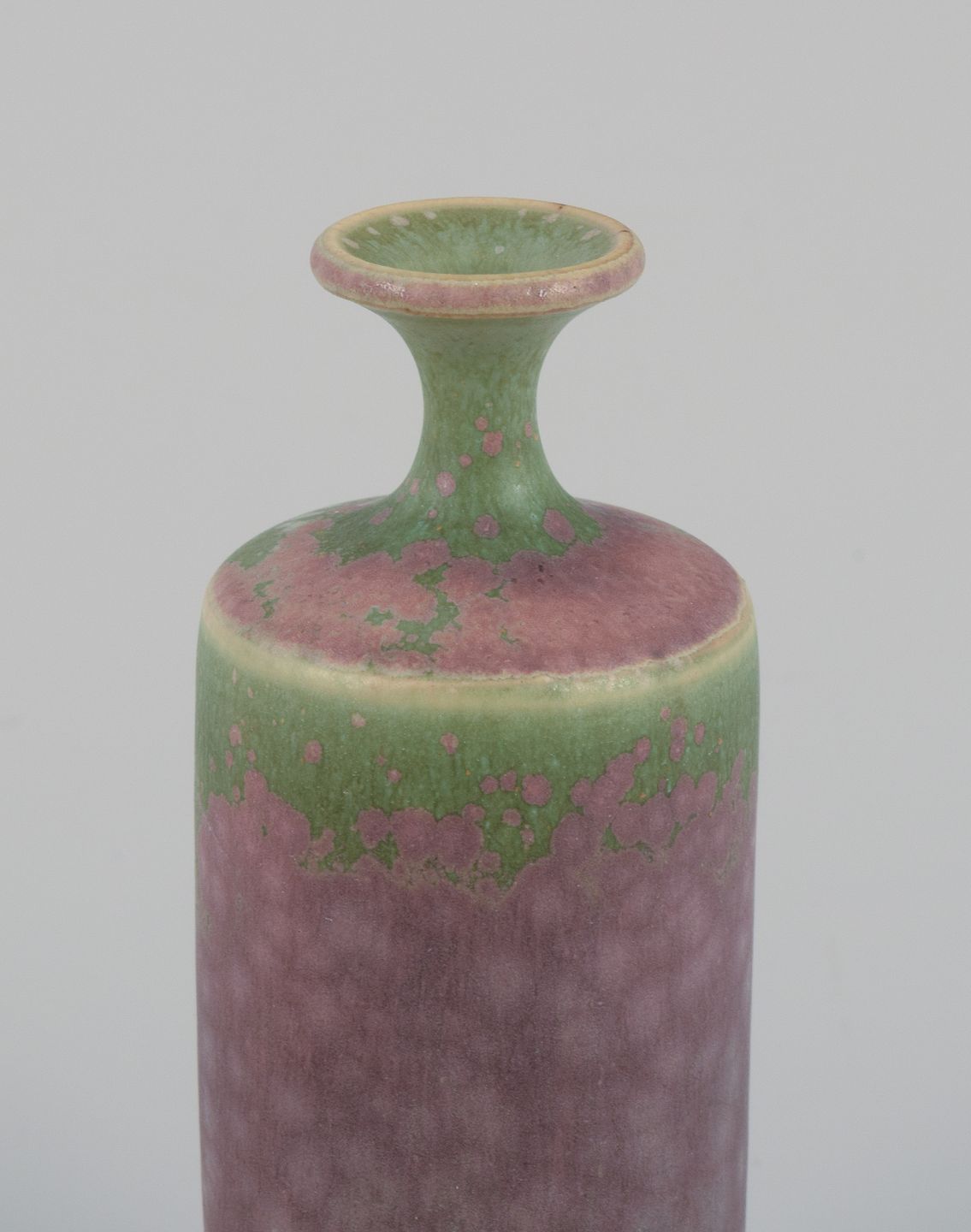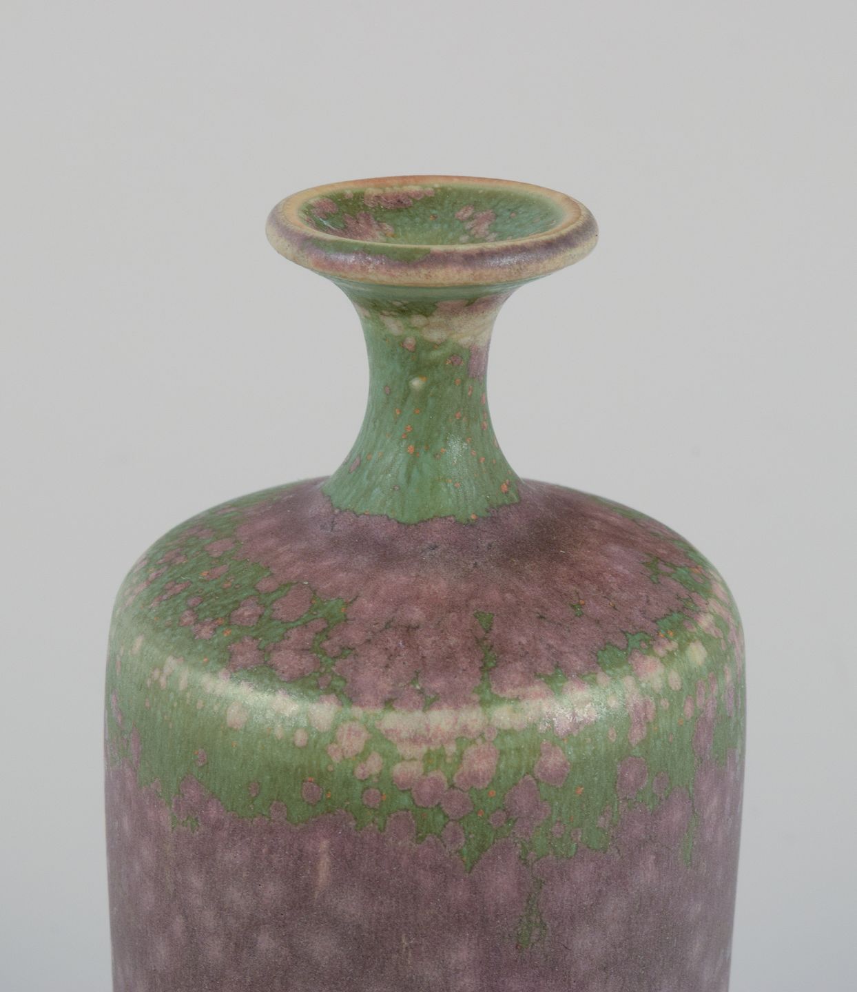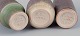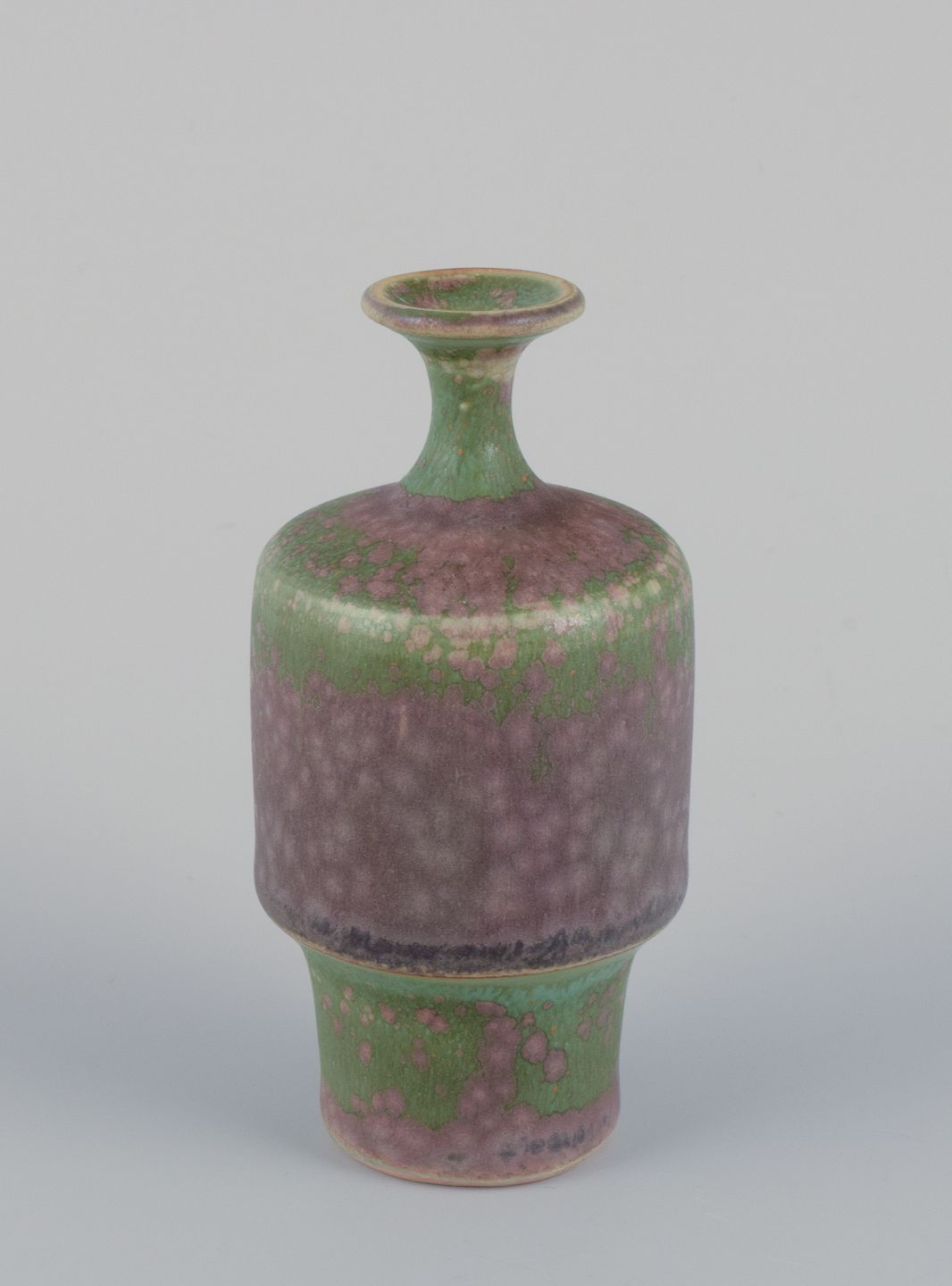 Rolf Palm (1930-2018), svensk keramiker. Tre unika miniaturevaser med glasur i grønne og brune nuancer. 1970’erne. Signeret. Perfekt stand. Højeste: H 10,5 cm. x D 4,0 cm.
