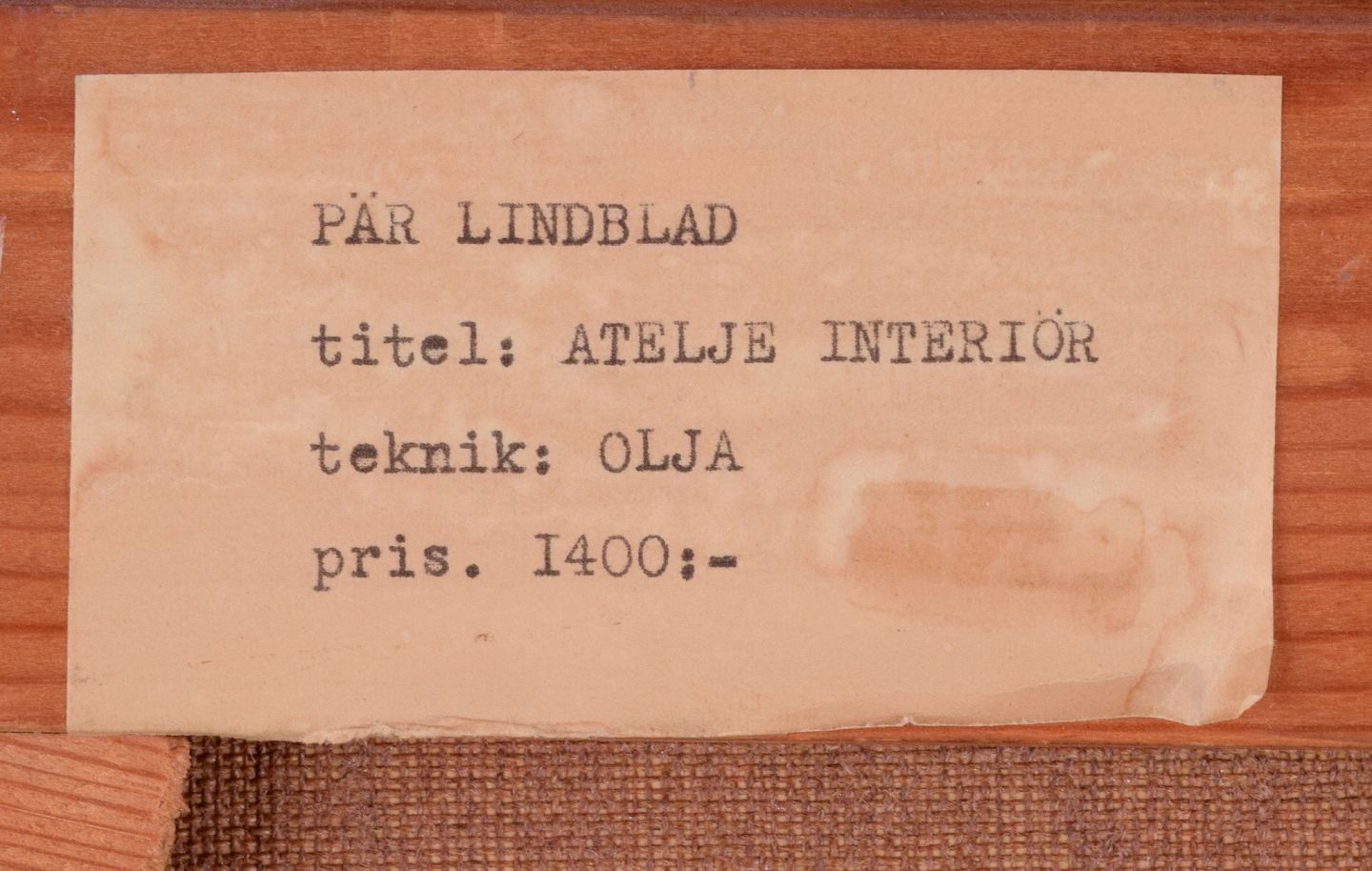 Pär Lindblad (1907-1981), olie på lærred. Modernistisk opstilling. Interiør fra atelier.