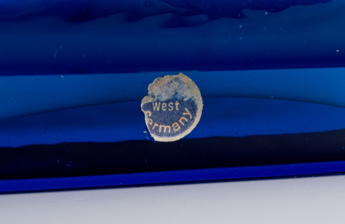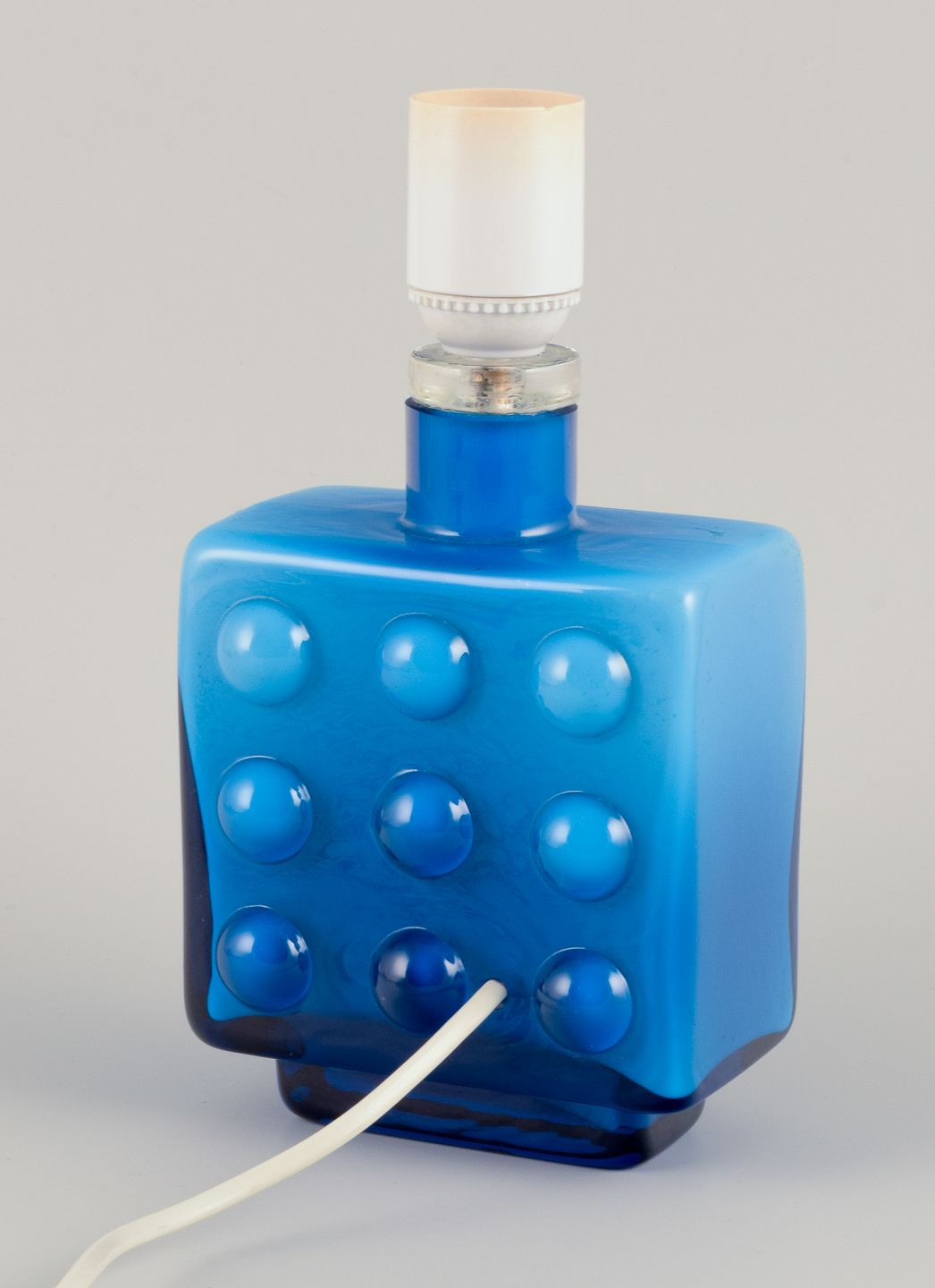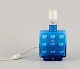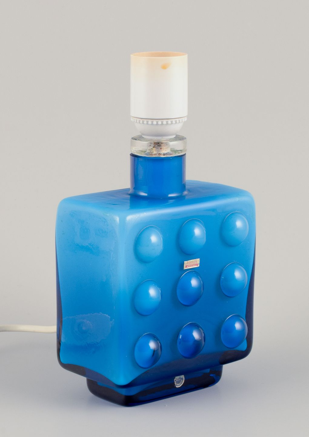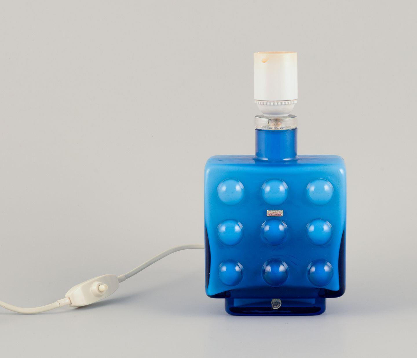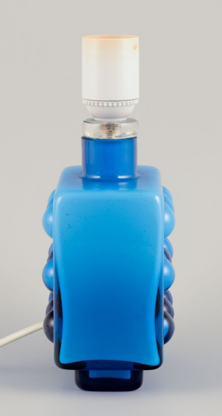 Friedrich Kristall, Tyskland. Bordlampe i turkist kunstglas. Modernistisk design. 1960/70’erne. Mærkat. Perfekt stand. Mål: B 12,0 cm. x D 8,0 cm. x H 22,5 cm. med fatning. Ledning: 175 cm.