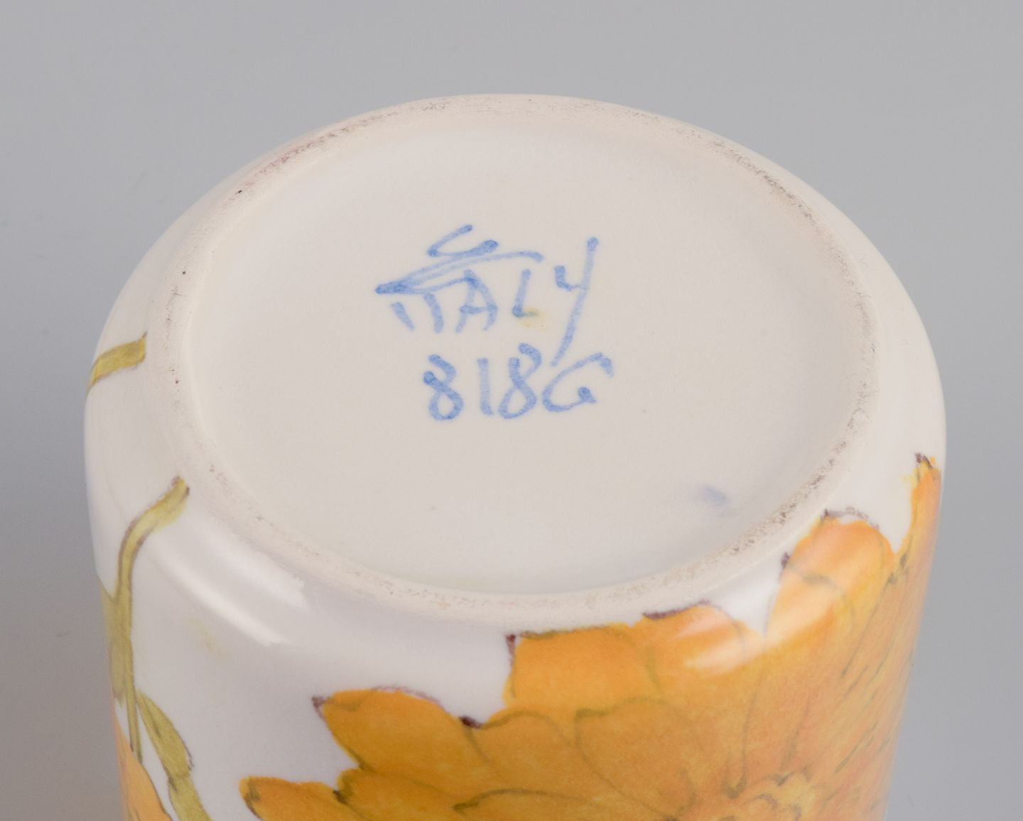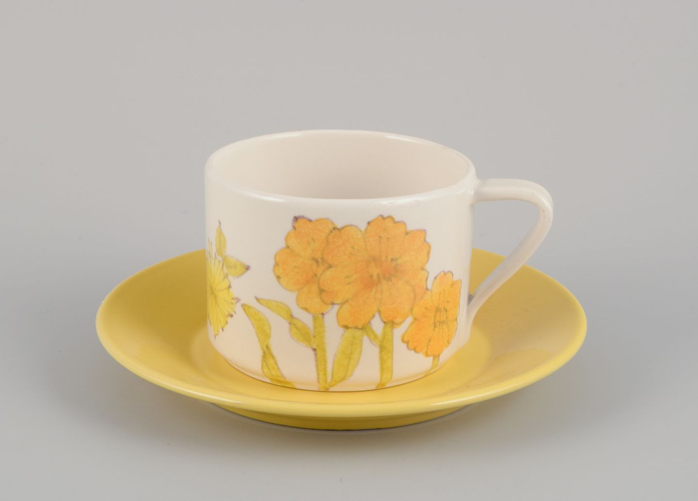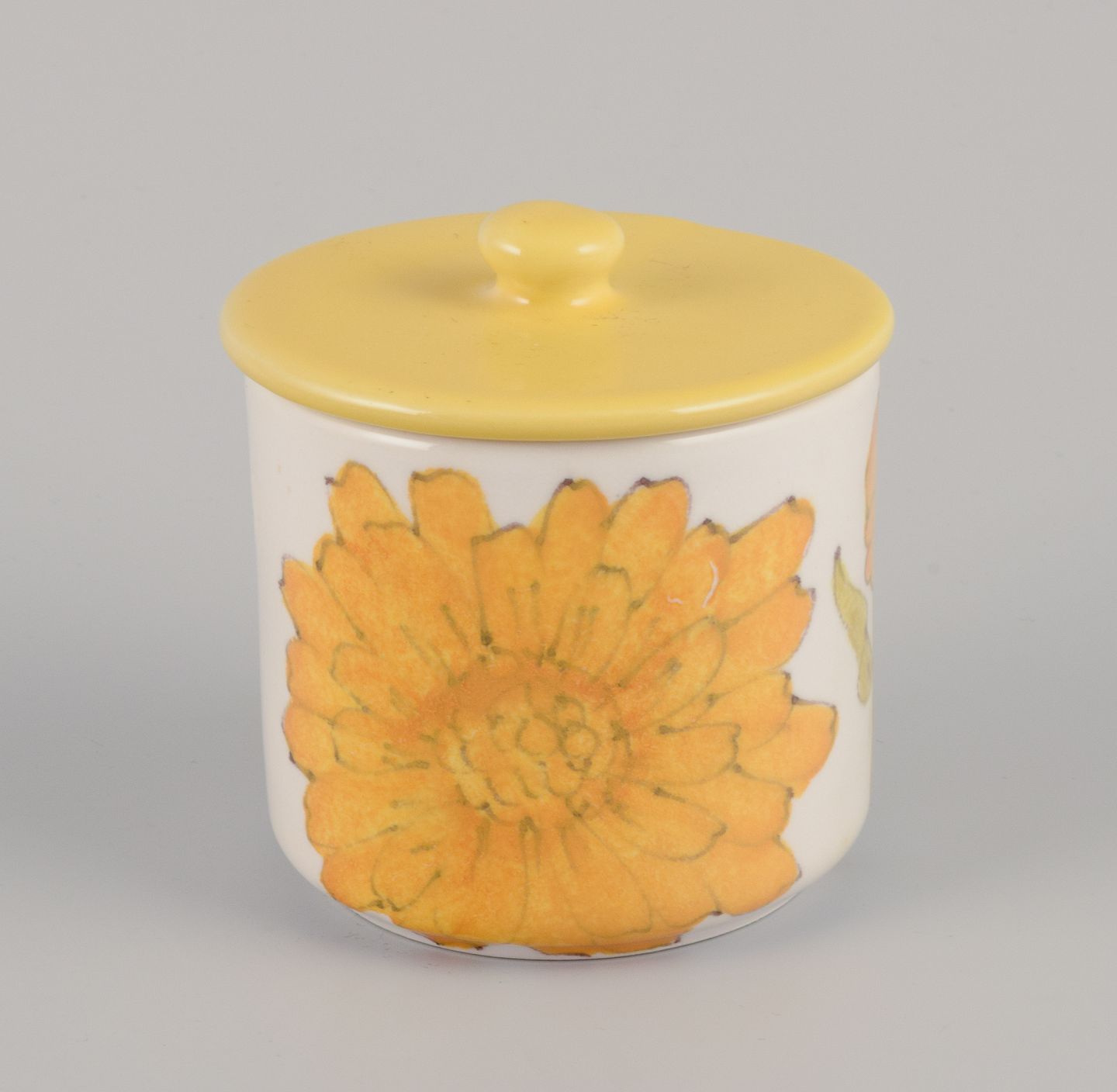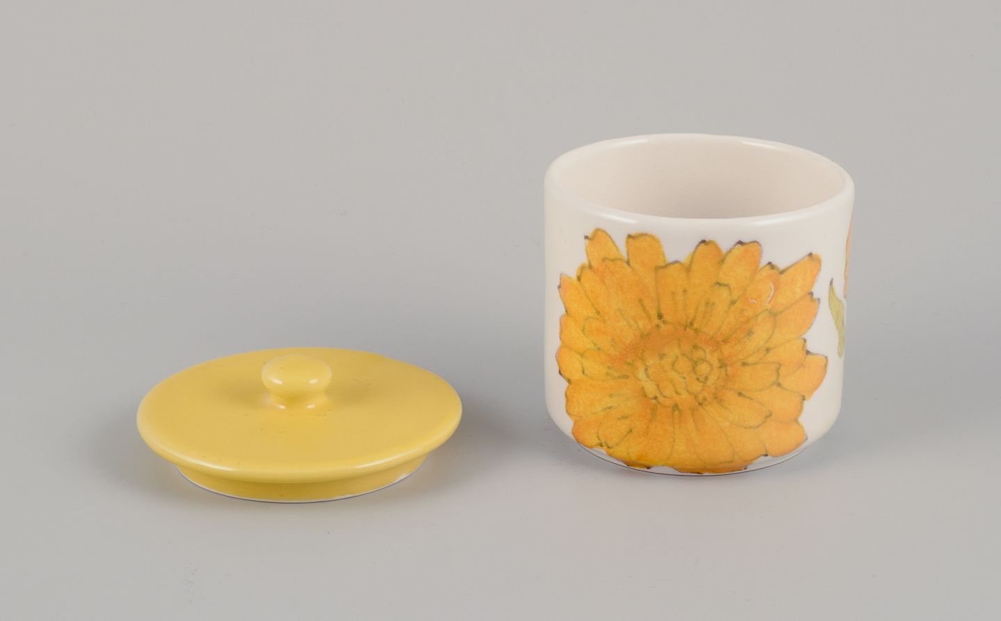Ernestine Salerno, Italien. To store kaffekopper/morgenkopper med undertallerkner samt lågkrukke. Håndmalet med solsikker.
