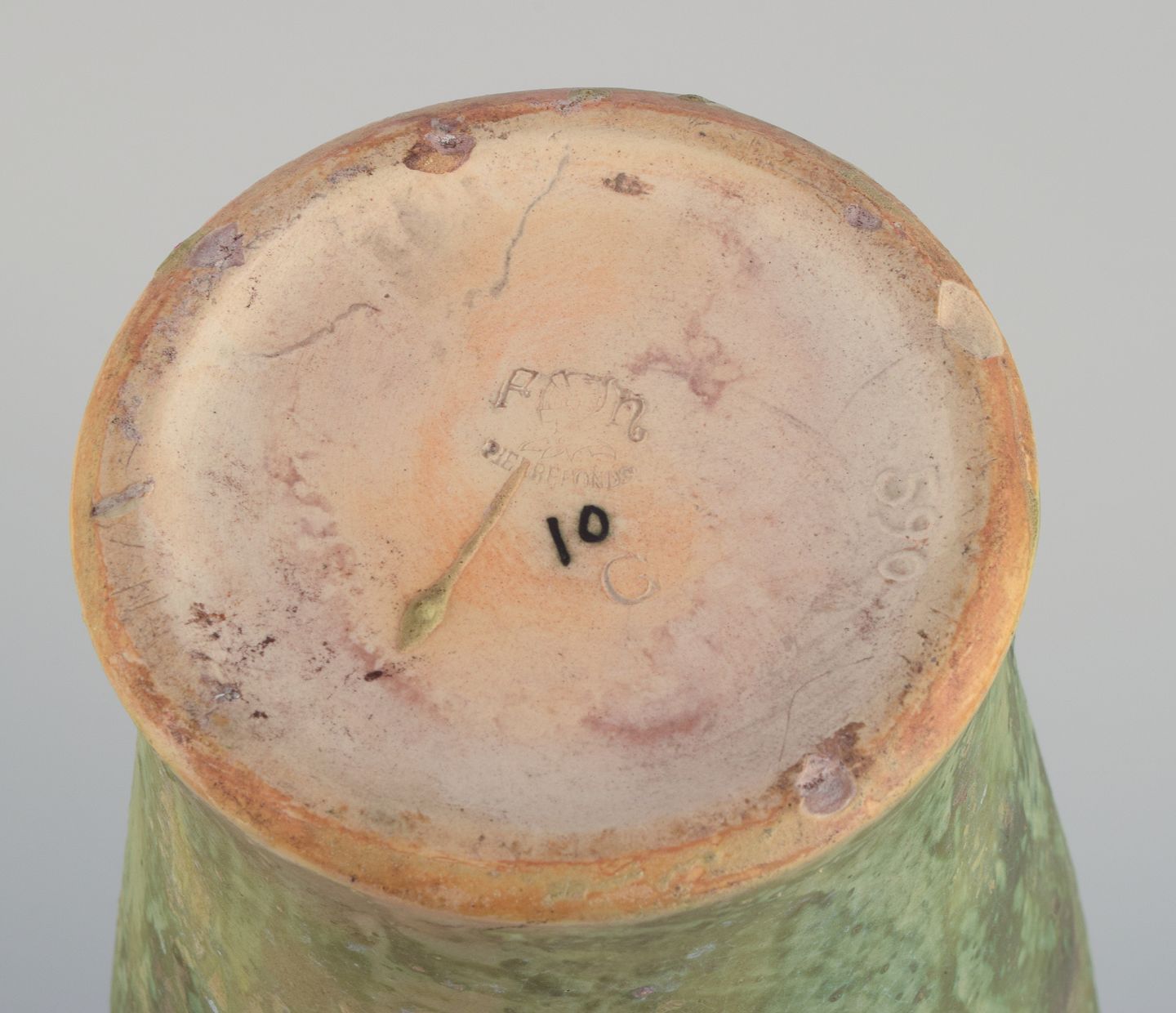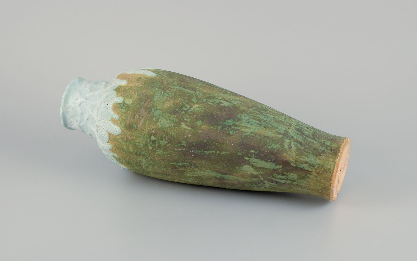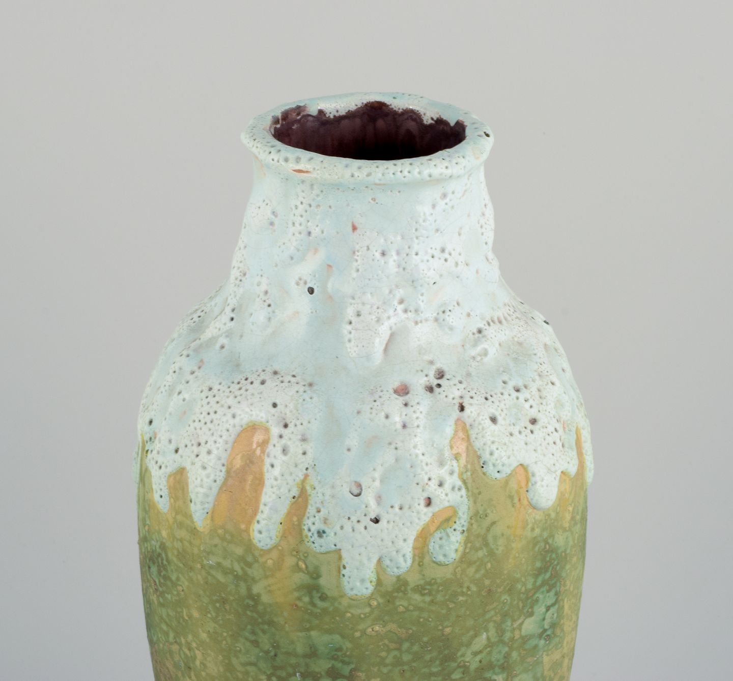 Pierrefonds, fransk keramikværksted. Unika keramik gulvvase. Flydeglasur i lyse toner på mat grønlig bund.
