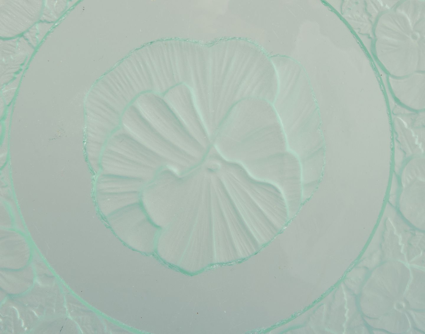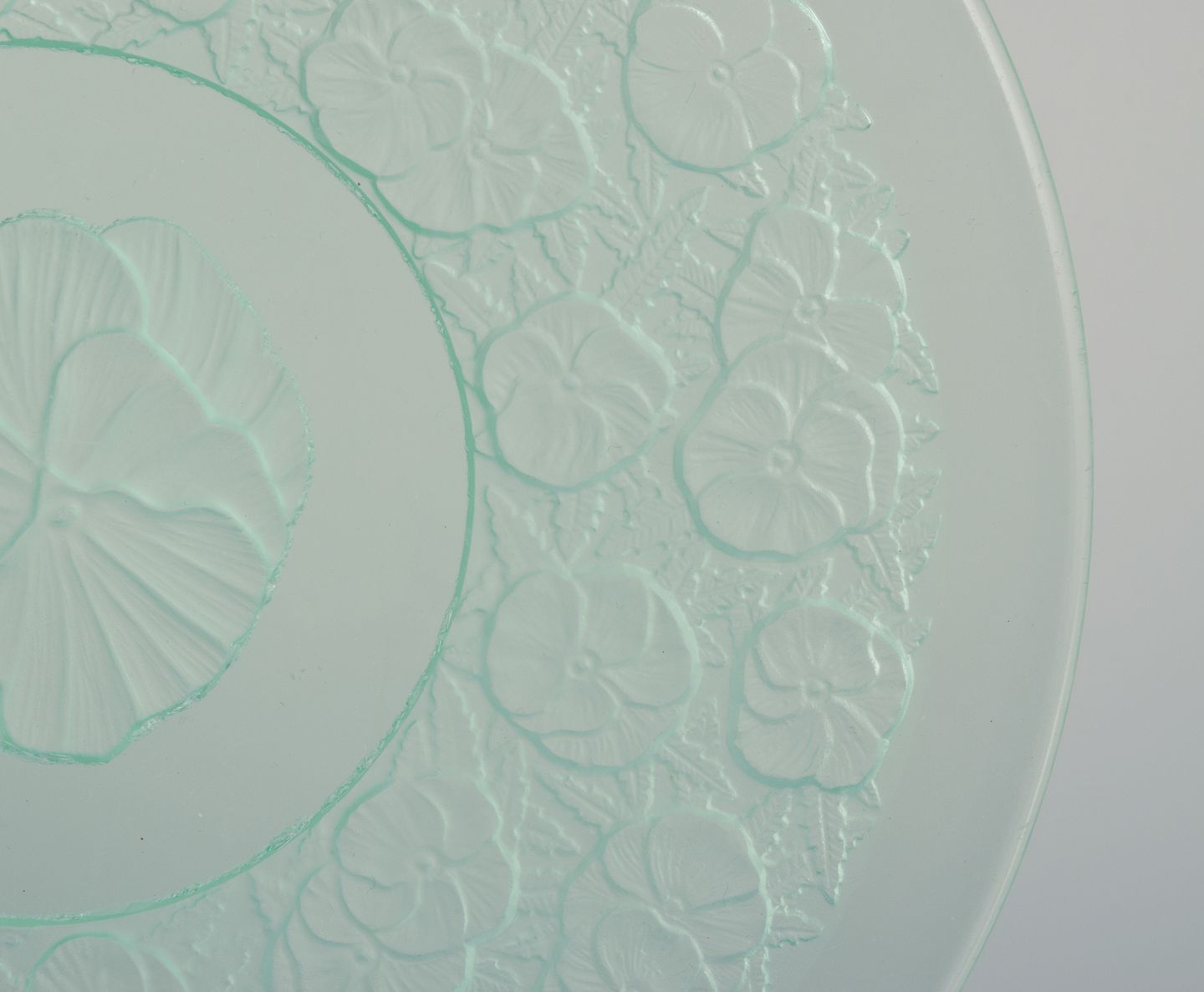 René Lalique stil. Et sæt på ni glastallerkner designet med blomstermotiver i grønt glas. Mundblæst glas. 1930/40’erne. Perfekt stand. Mål: D 18,0 cm.