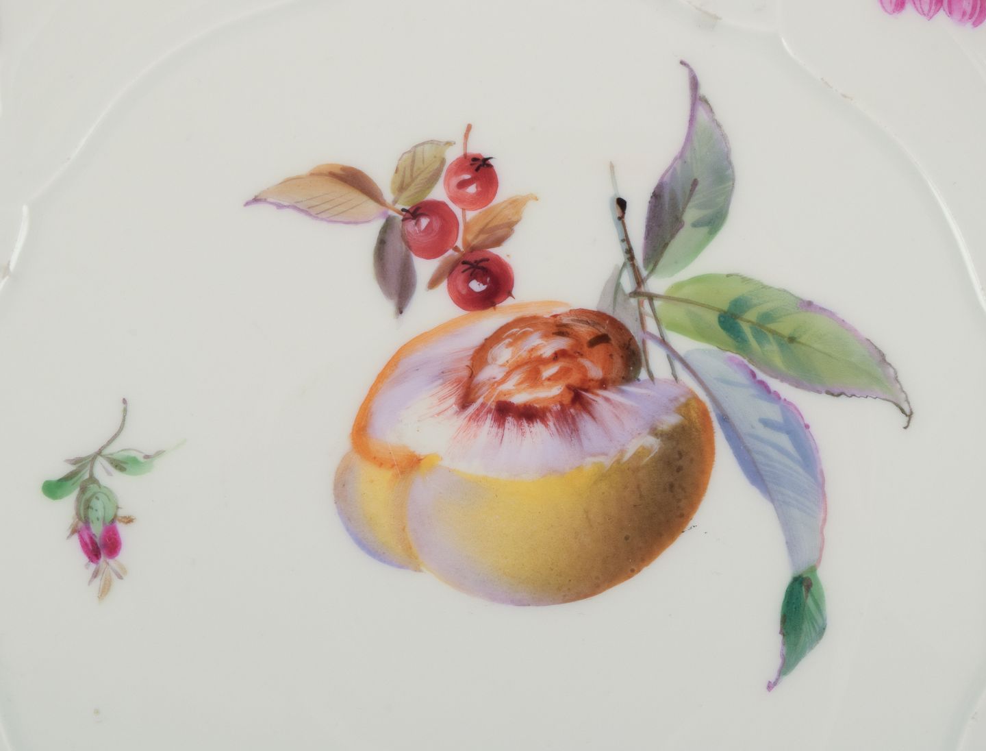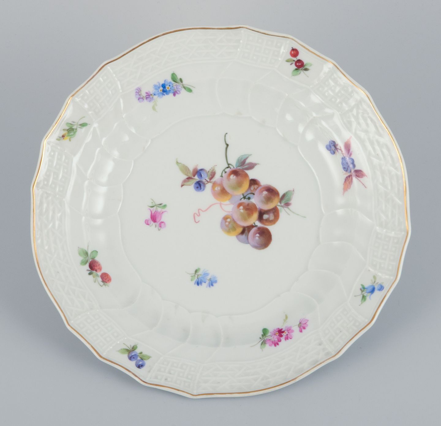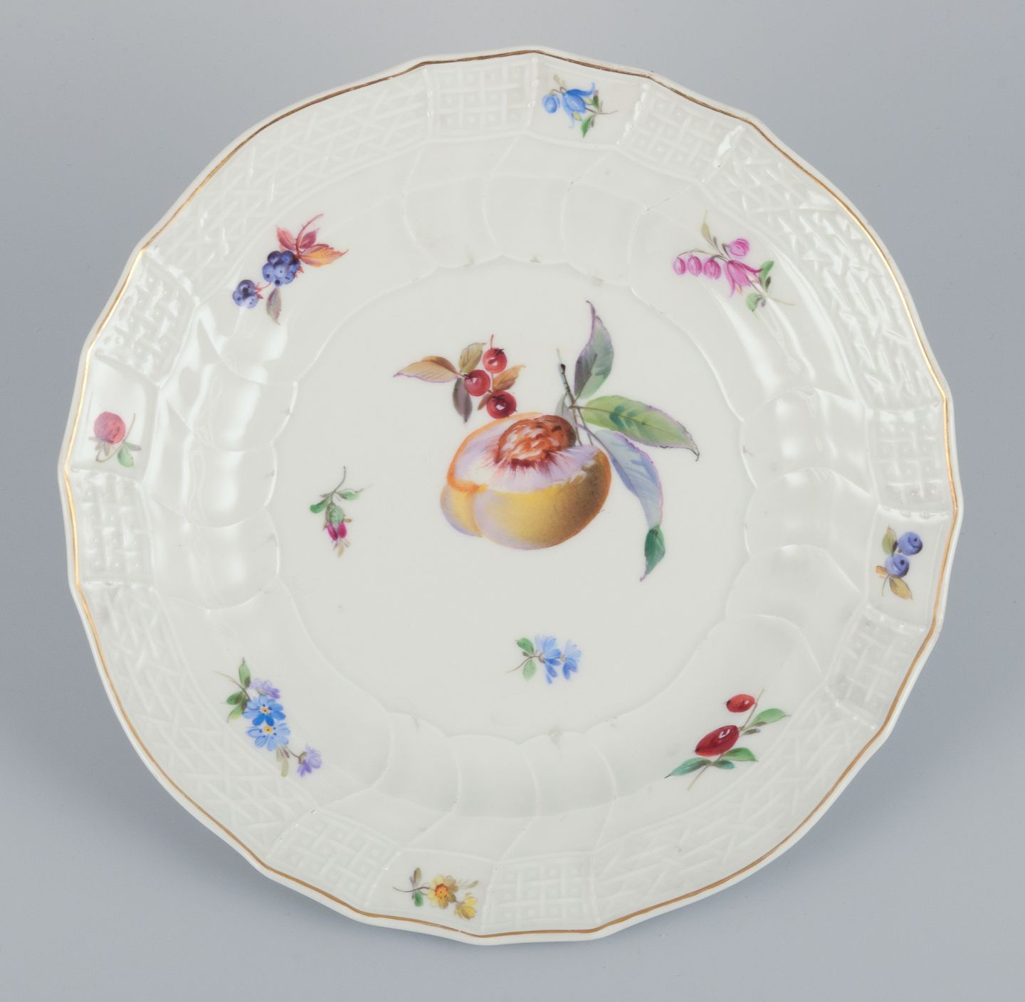 Meissen, Tyskland. Et sæt på seks antikke dybe middagstallerkner i porcelæn. Håndmalet med polykrome frugtmotiver.
