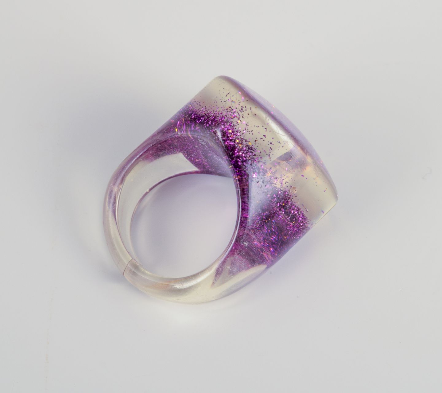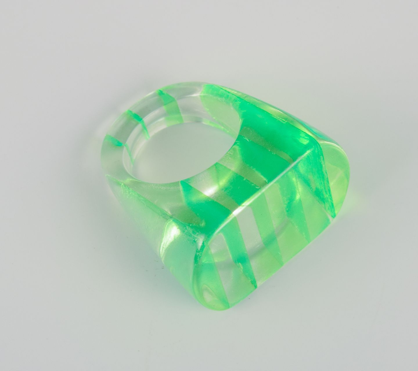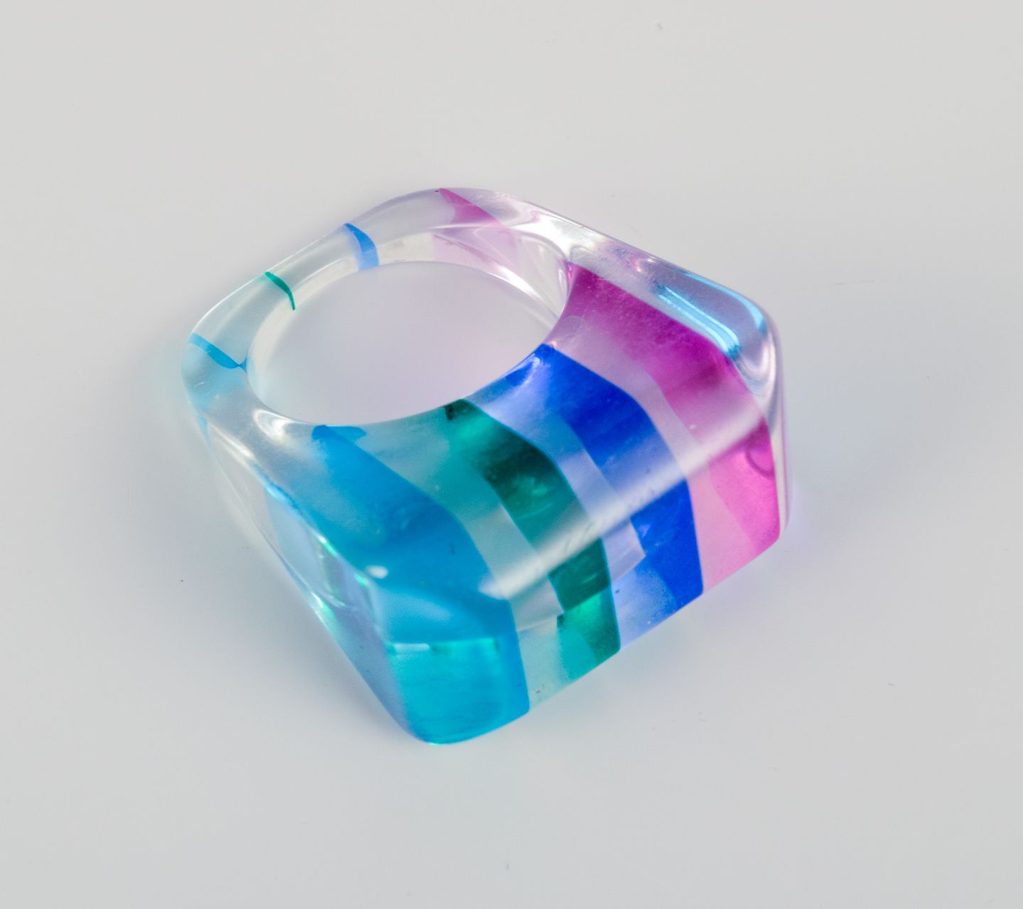 Fransk smykkekunstner. Fem designerringe i plast. Stribet design med forskellige farver. 1960/70’erne. I flot stand. Mål: 16 mm. – 18 mm.