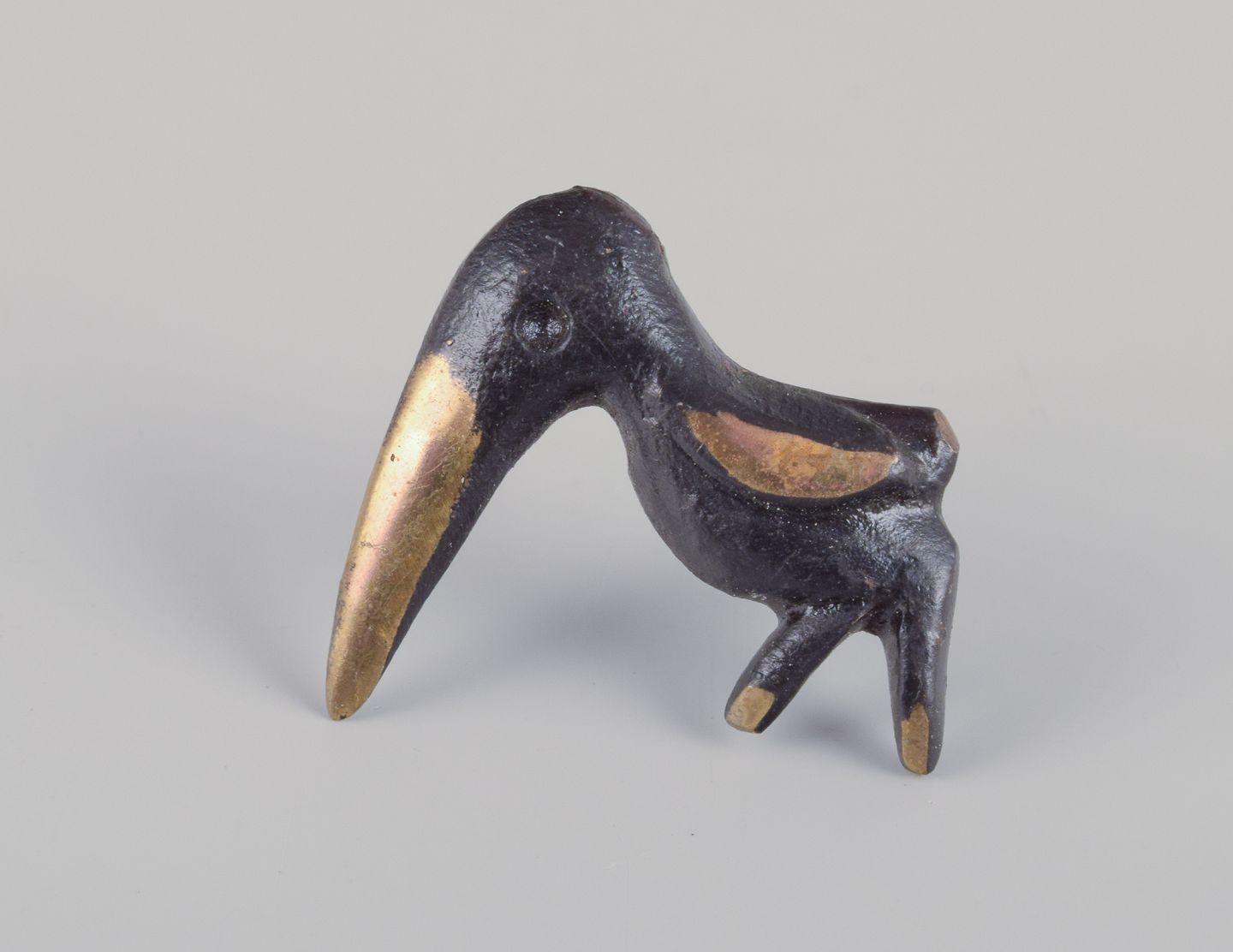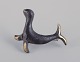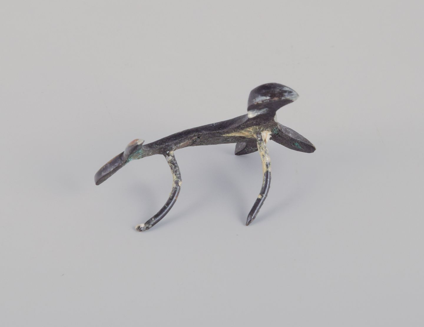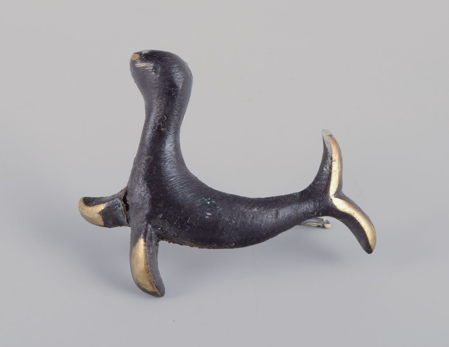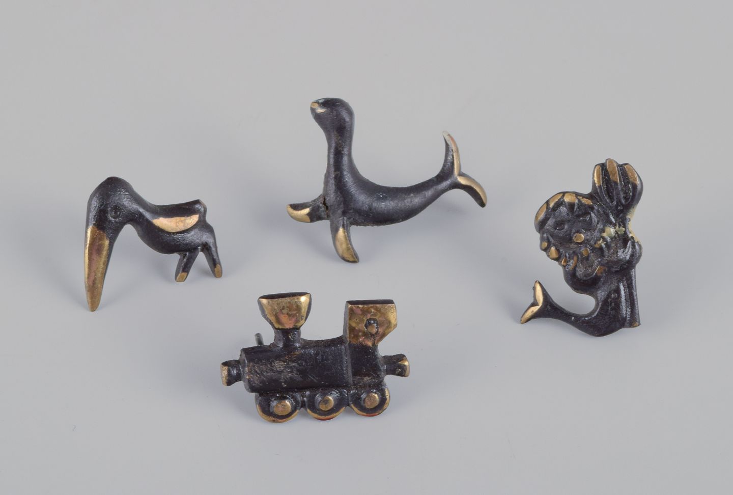 Four miniature bronze figurines. Train, mermaid, toucan, and seal.