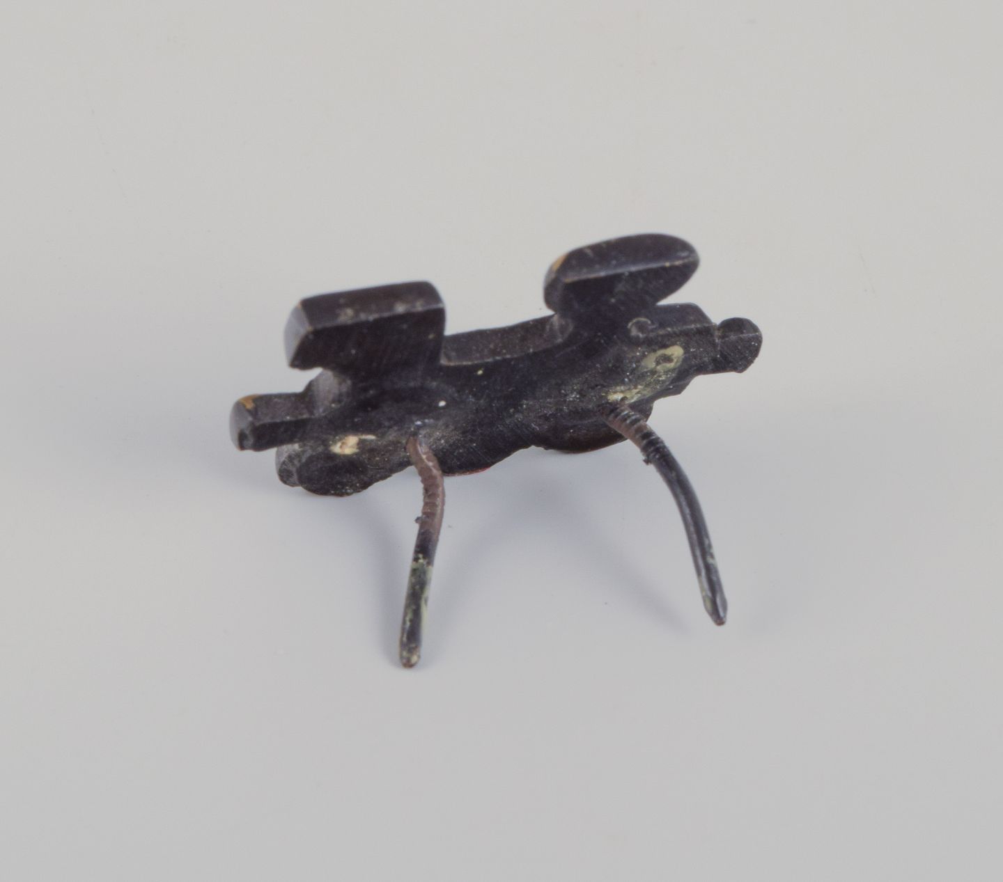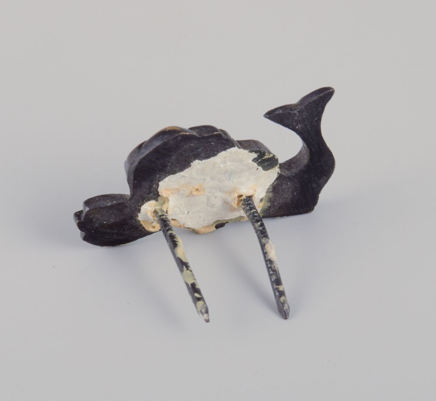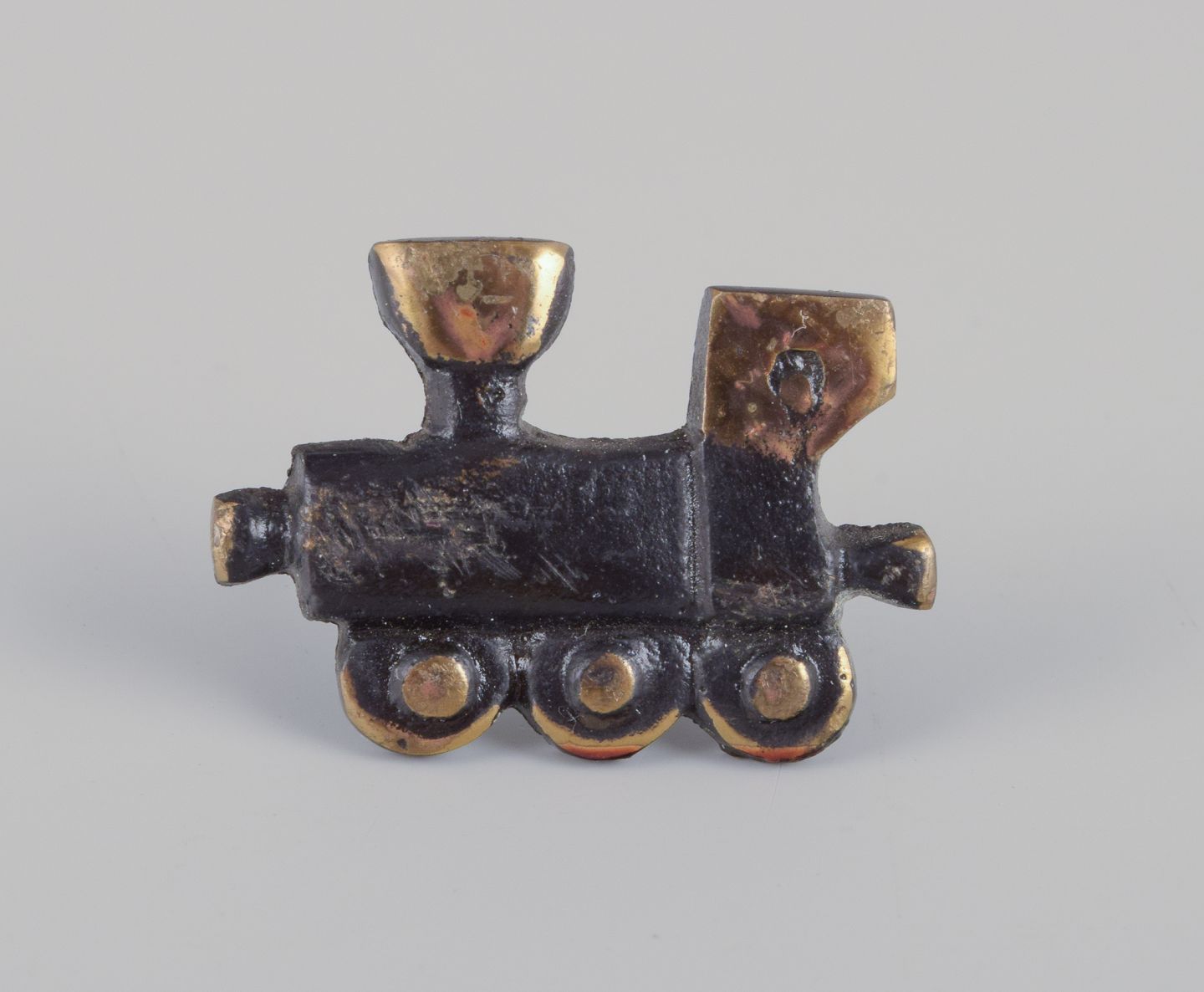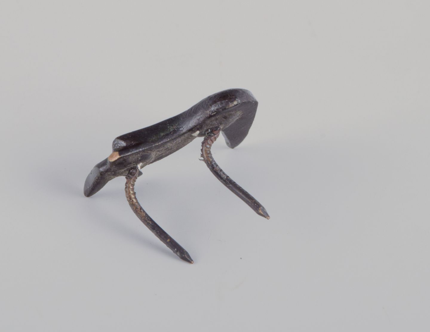 Four miniature bronze figurines. Train, mermaid, toucan, and seal.