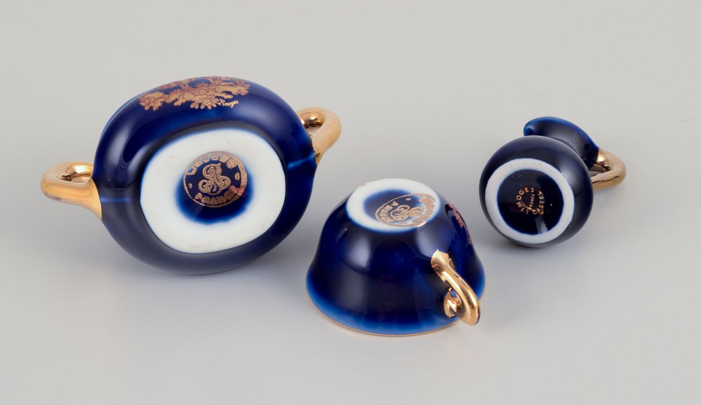 Limoges, Frankrig. Syv dele miniatureporcelæn. Dekoreret i 22-karat bladguld. Smuk kongeblå glasur. Scène galante.