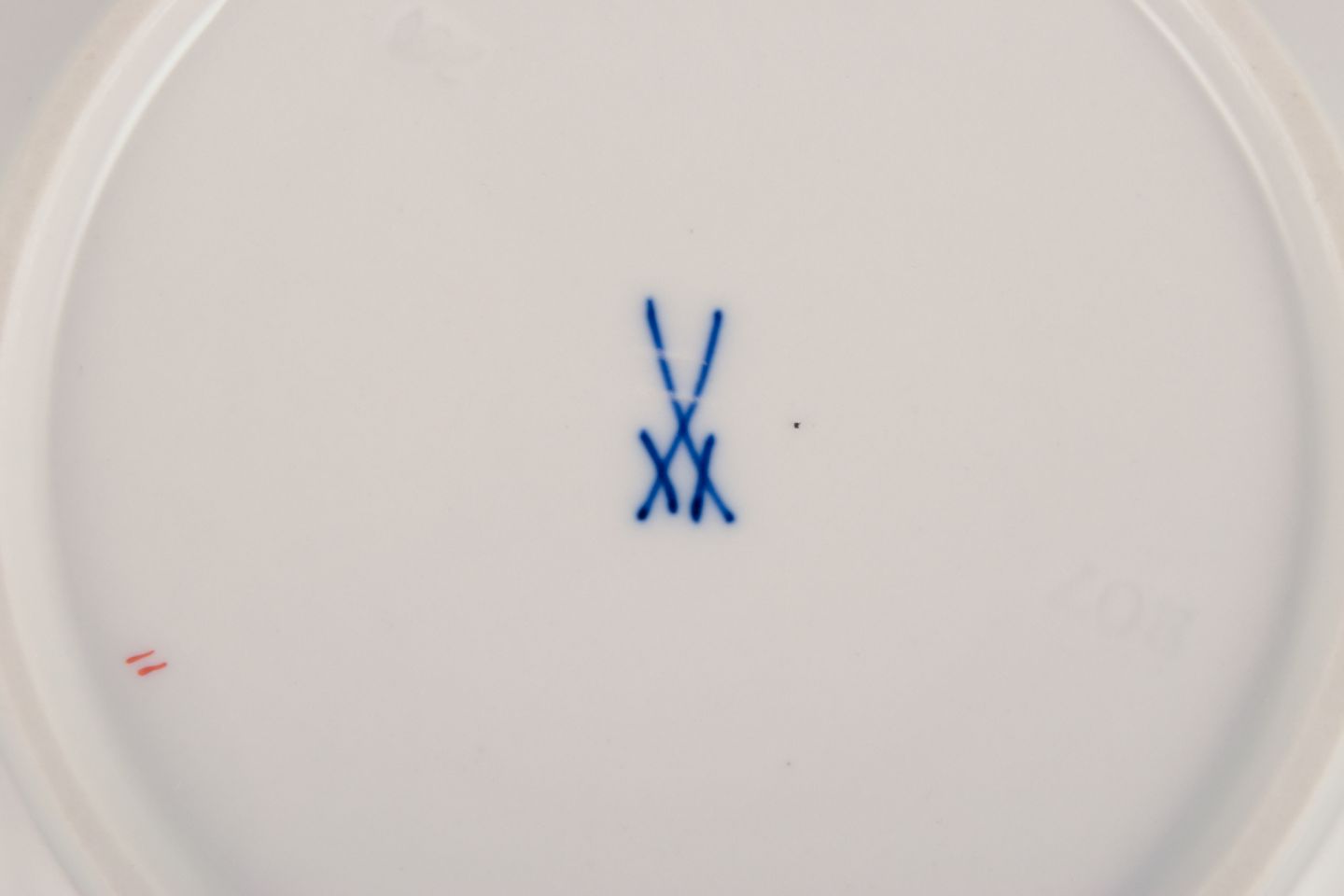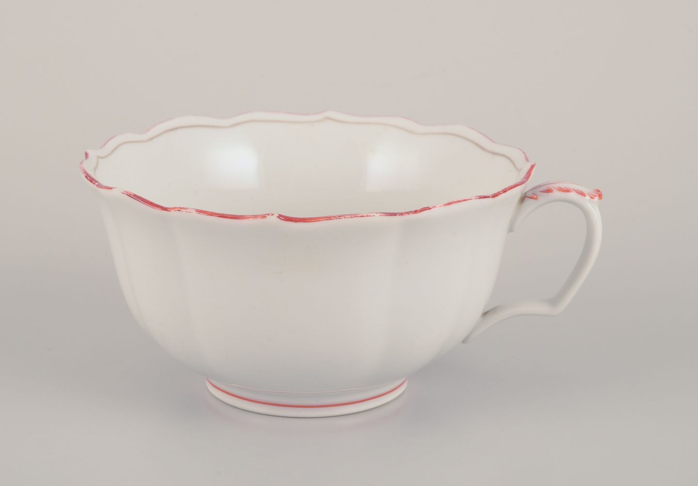 Meissen, Tyskland. Tekop og bouillonkop med underkopper. Dekoreret med koralrød og guld farvet kant. Art Deco.
