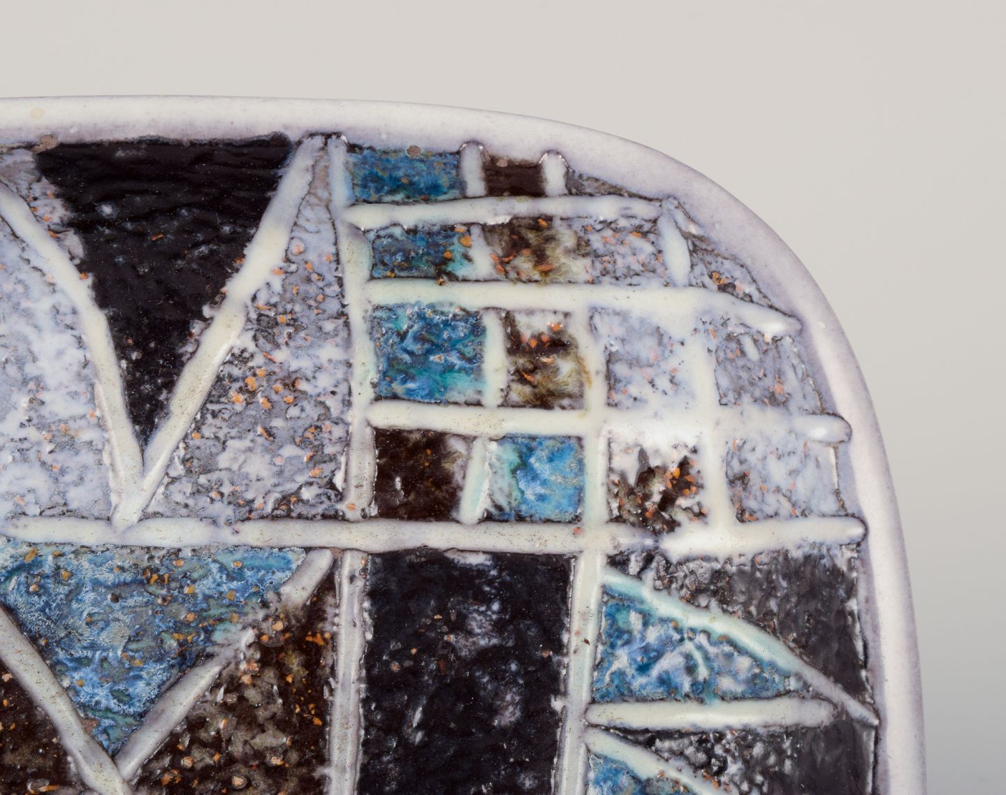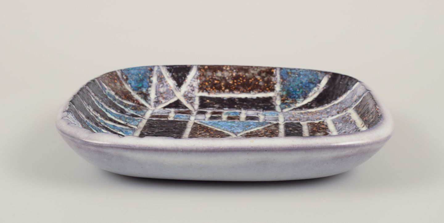 Ingrid Atterberg for Upsala Ekeby, Sverige. ”Tri” keramikfad. Geometrisk mønster med polykrom glasur. Model: 2669. Stemplet. Perfekt stand. Mål: D 18,0 cm. x H 3,0 cm.