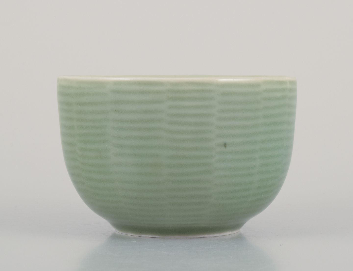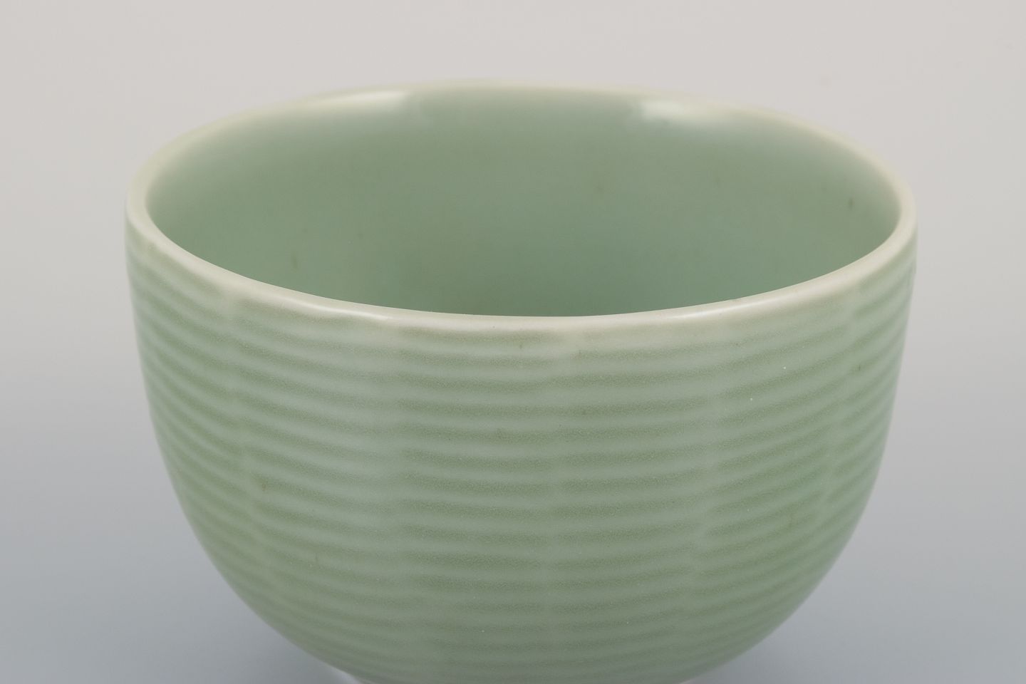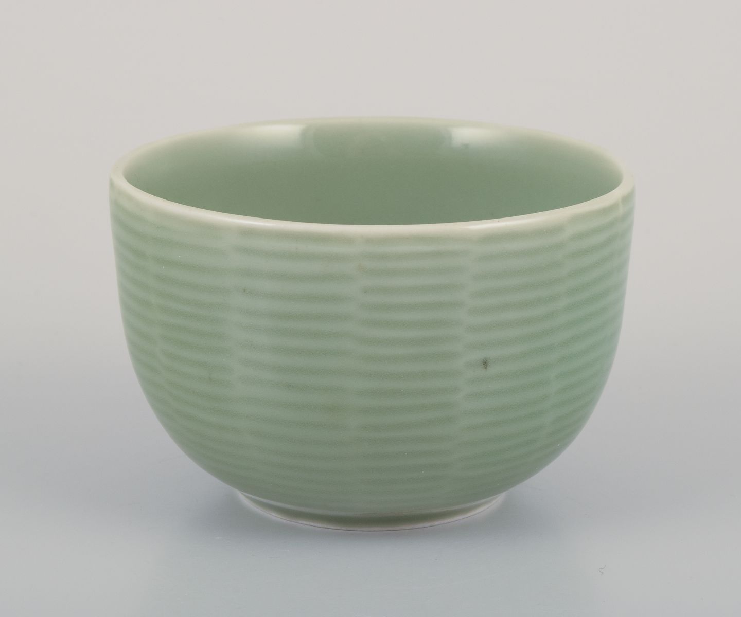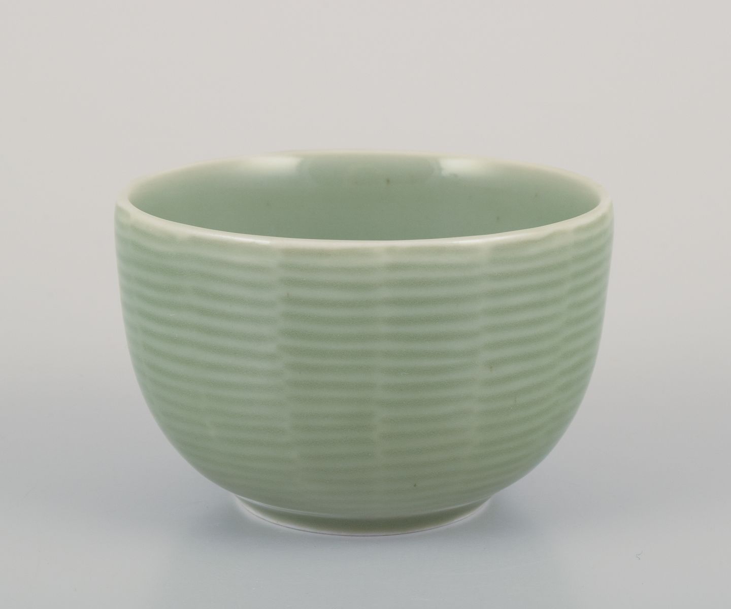 Axel Salto (1889-1961) for Royal Copenhagen. Keramikskål med riflet dekoration. Celadon glasur. Model: 20688. 1940’erne. Stemplet. Perfekt stand. Første sortering. Mål: D 8,4 cm. x 5,5 cm.