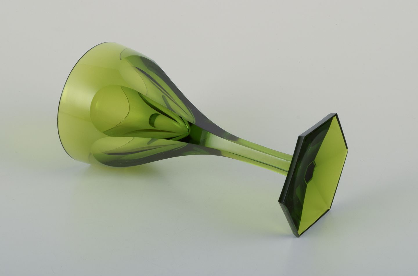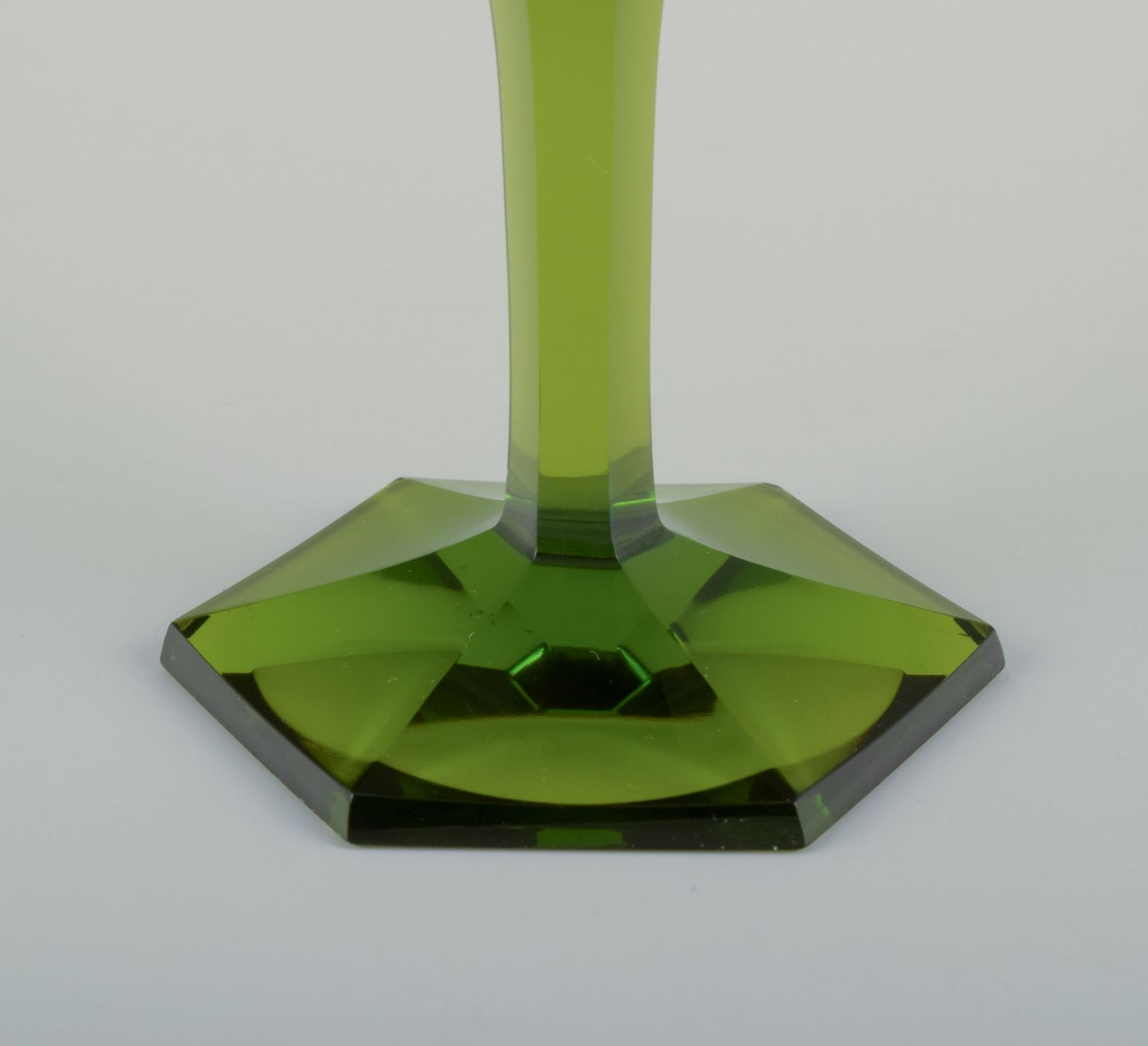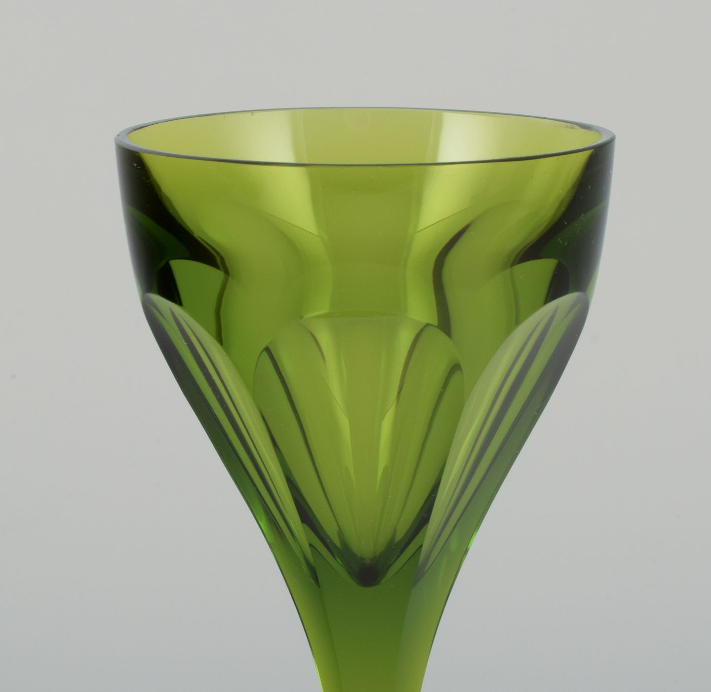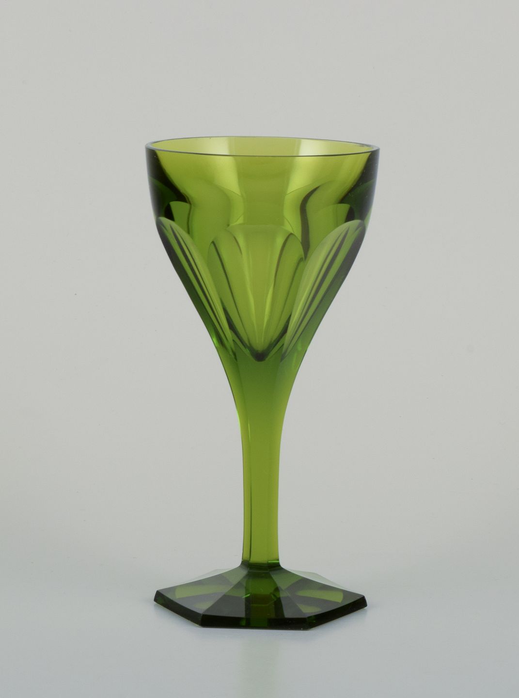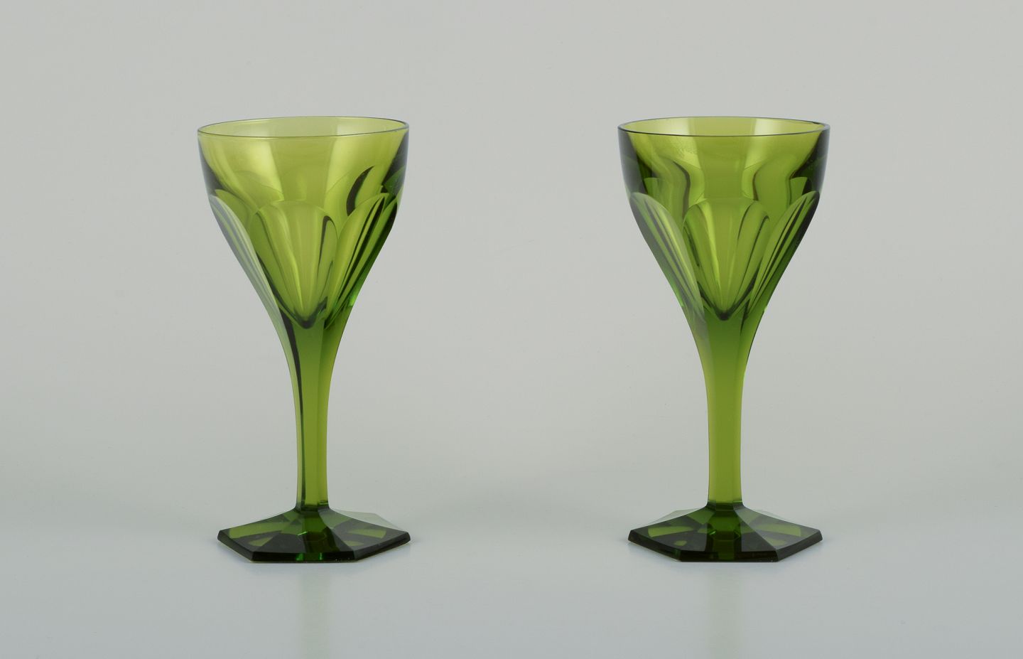 Baccarat, Frankrig. To Tallyrand grønne hvidvinsglas i facetslebet krystalglas. Håndlavet. 1930/40’erne. I flot stand, det ene glas med minimalt afslag under foden. Se foto. Mål: D 7,5 cm. x H 15,0 cm