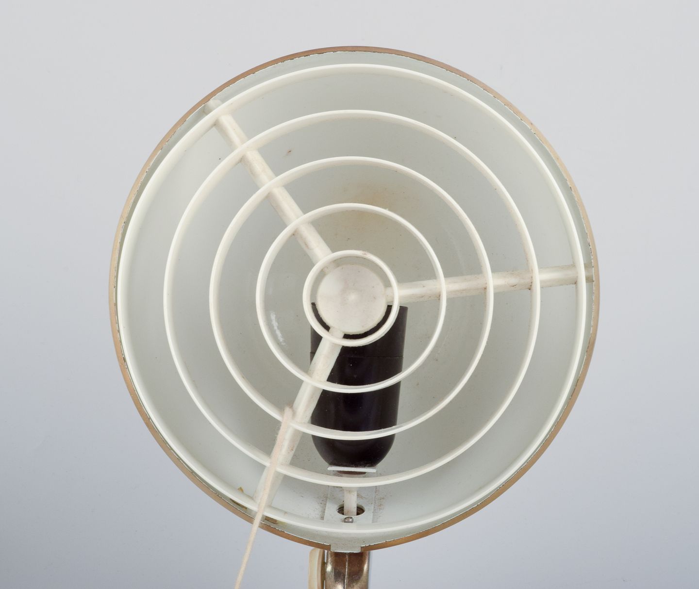 Et par modernistiske væglamper i messing med plastskærm. Trækafbryder.