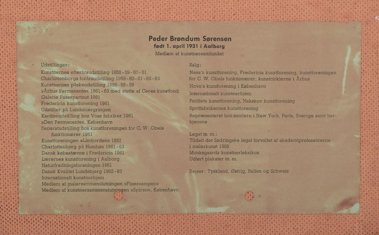 Peder Brøndum Sørensen (1931-2003), dansk maler, olie på lærred. Modernistisk landskab med hus og marker. 1970’erne Signeret. I perfekt stand. Mål: 51,0 cm. x 41,0 cm. Total: 69,5 cm. x 59,5 cm.