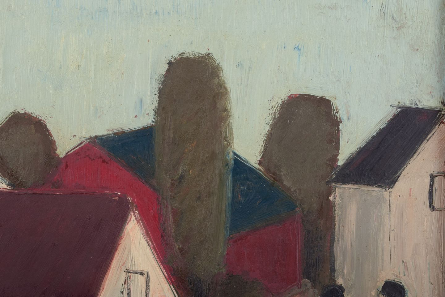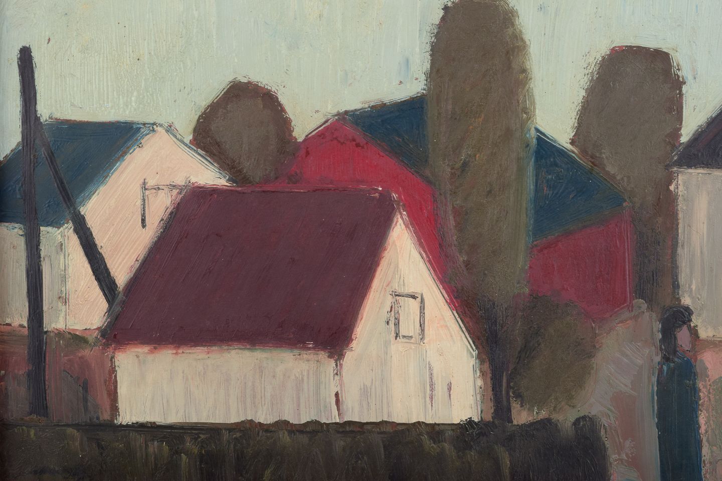 Peder Brøndum Sørensen (1931-2003), dansk maler, olie på lærred. Modernistisk bymotiv. 1970’erne Signeret PBS. I perfekt stand. Mål: 50 cm. x 40 cm. Total: 54,5 cm. x 44,5 cm.
