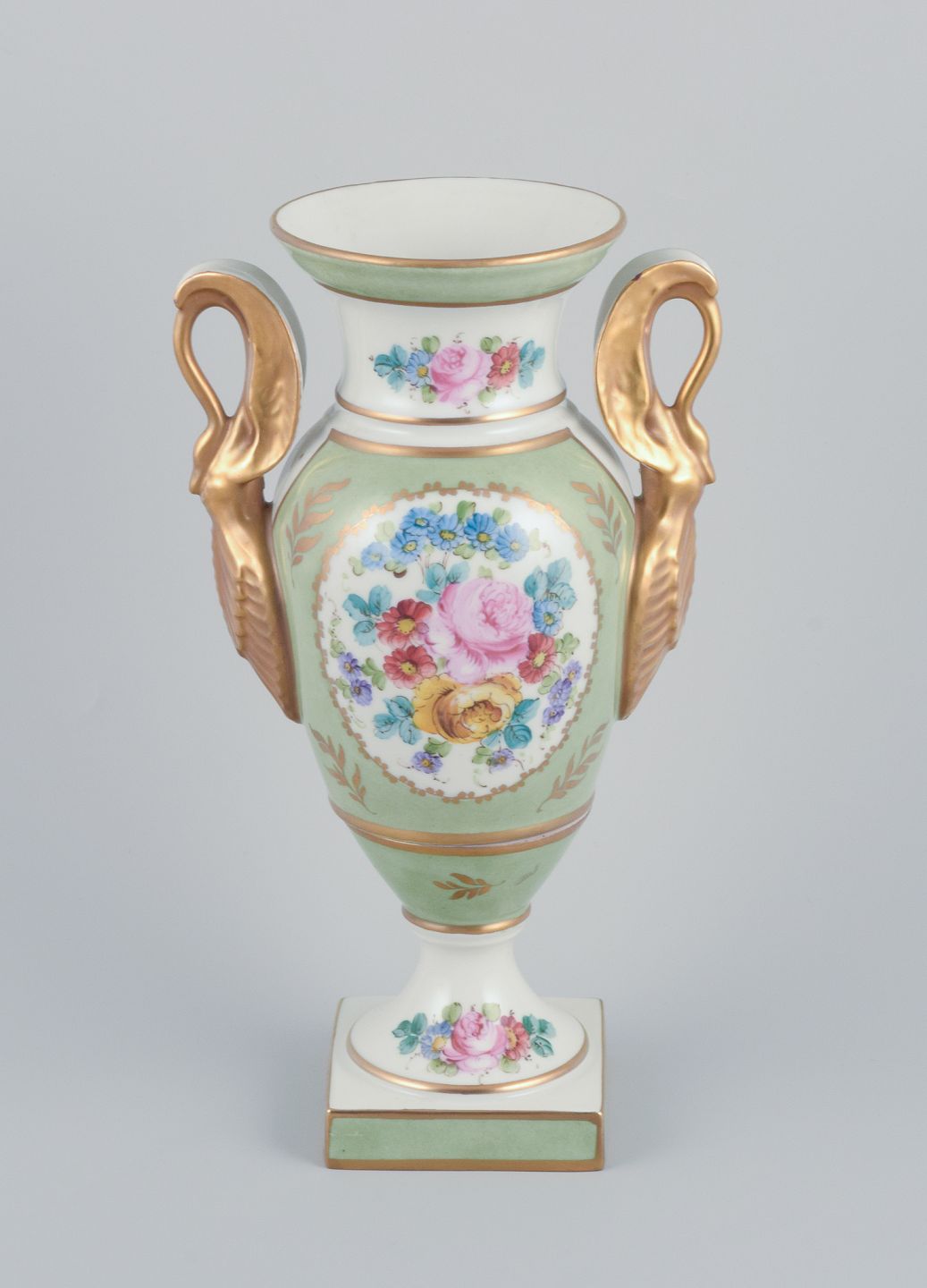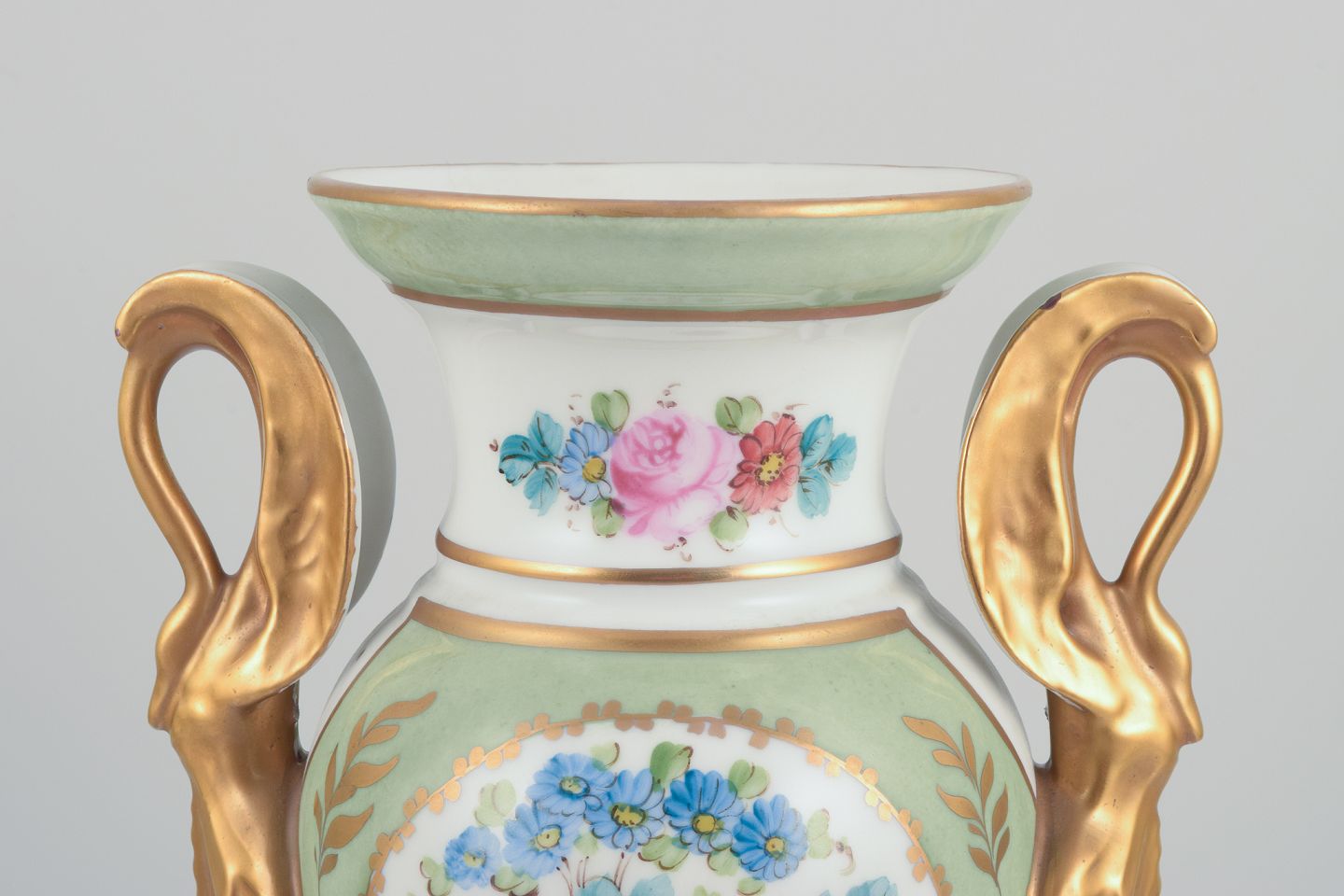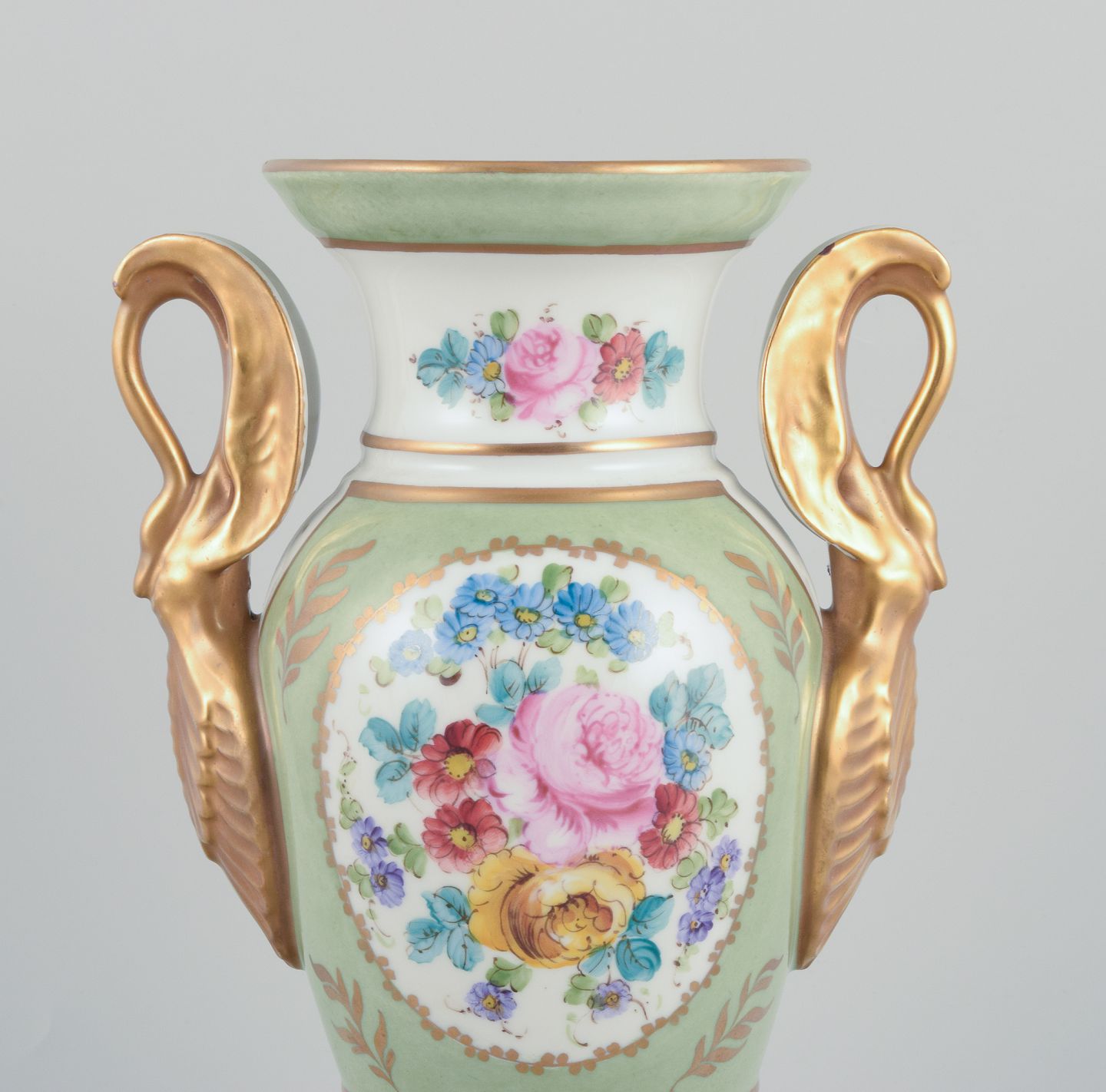 Limoges/Sevres, Frankrig, porcelænsvase på sokkel, hanke i form af svaner. Hånddekoreret med polykrome blomstermotiver. Dekoreret af Mansard, Paris.
