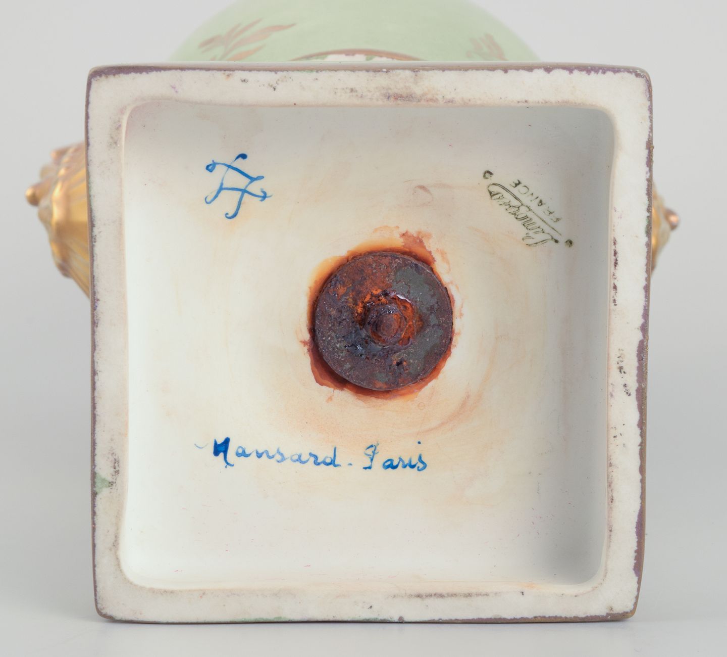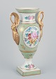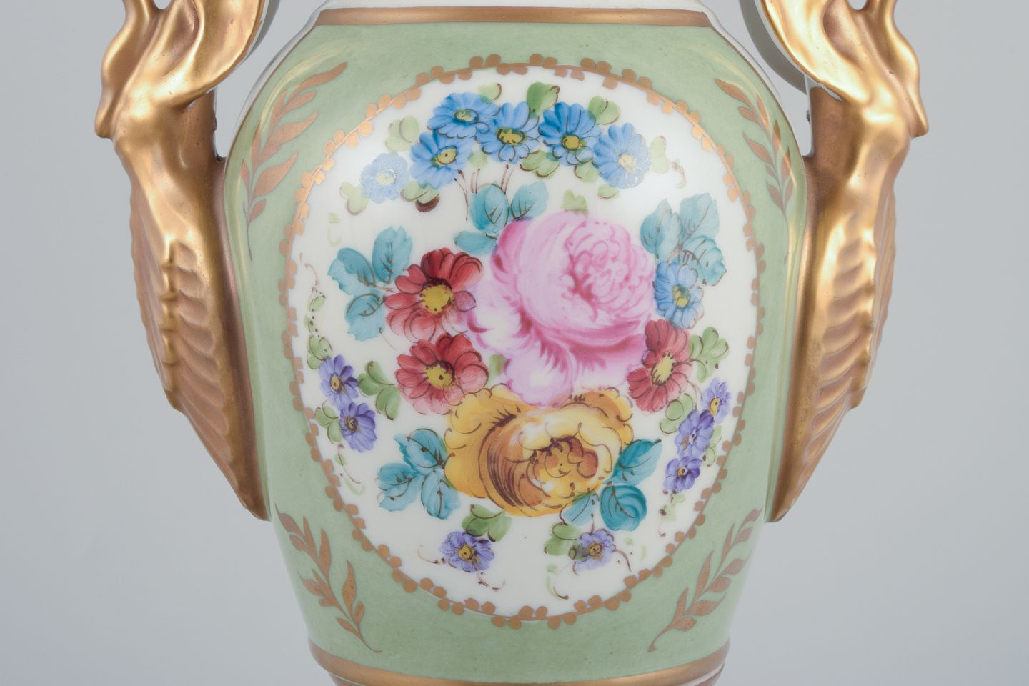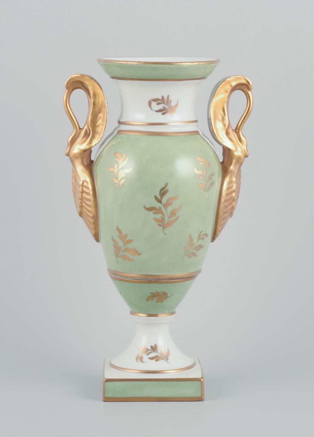 Limoges/Sevres, Frankrig, porcelænsvase på sokkel, hanke i form af svaner. Hånddekoreret med polykrome blomstermotiver. Dekoreret af Mansard, Paris.