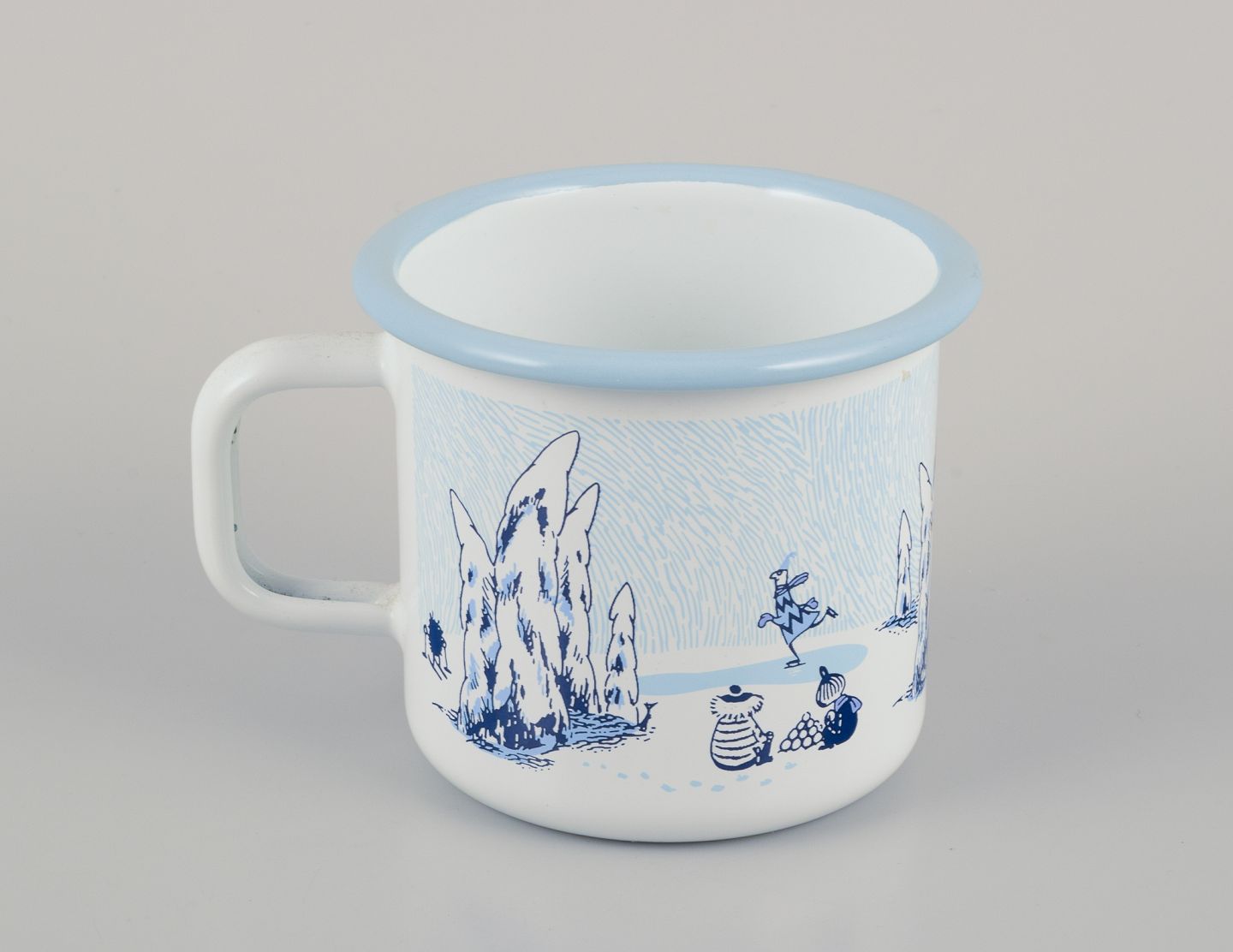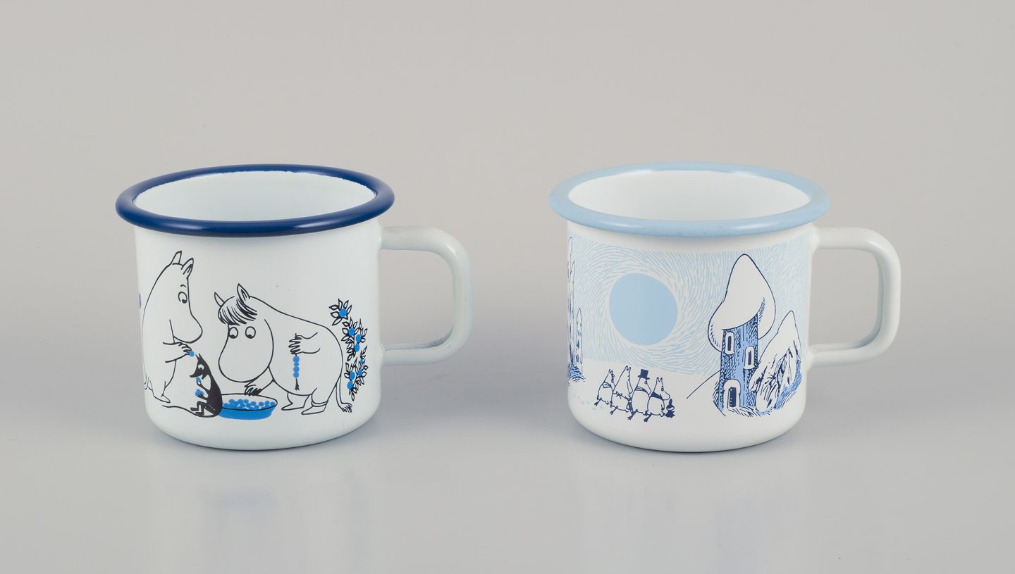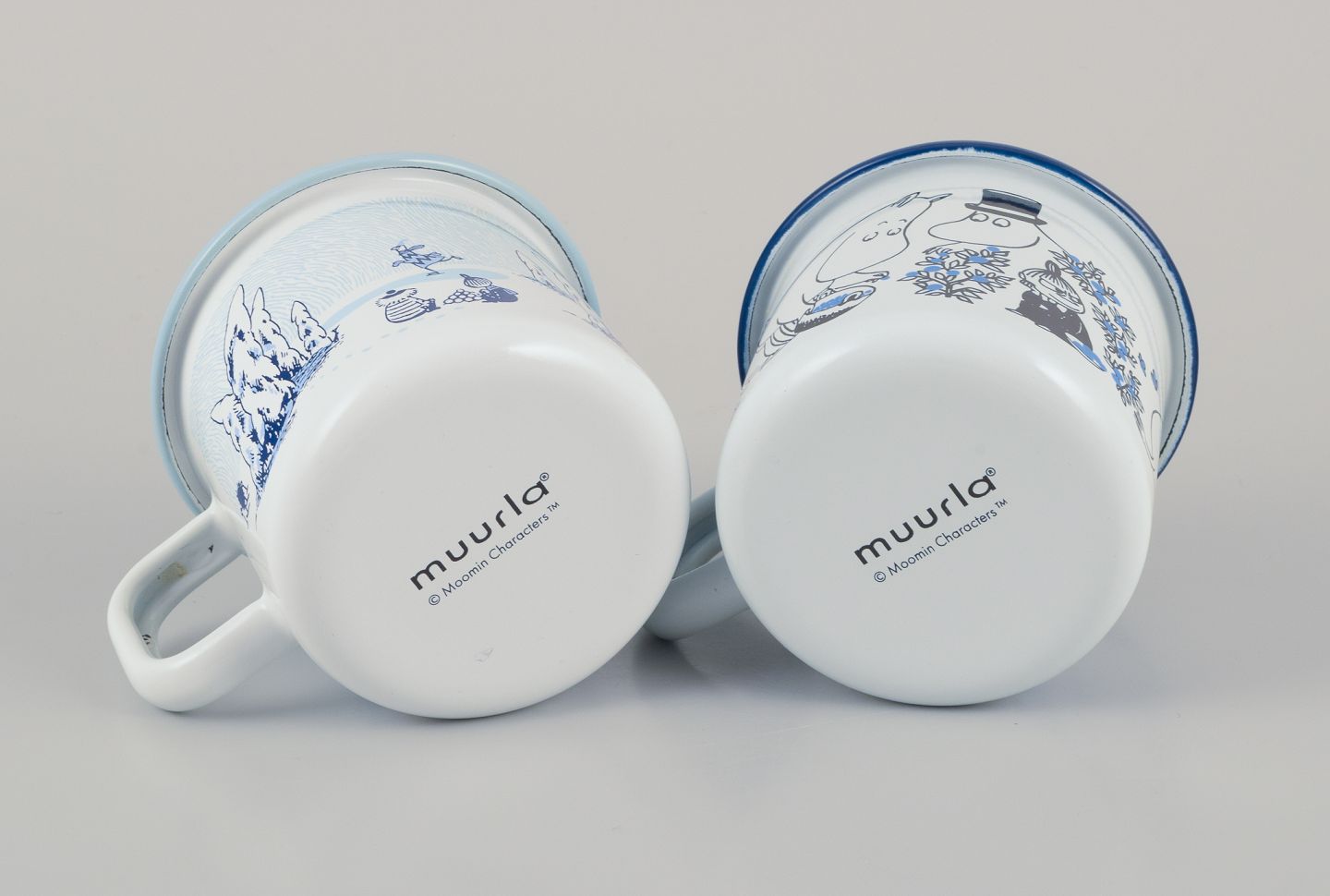 Muurla, Finland. To krus i emalje med hank. Motiv af Mumitrolde. 2000-tallet. Perfekt stand. Stemplet. Mål: D 9,5 cm. uden hank x H 8,0 cm.