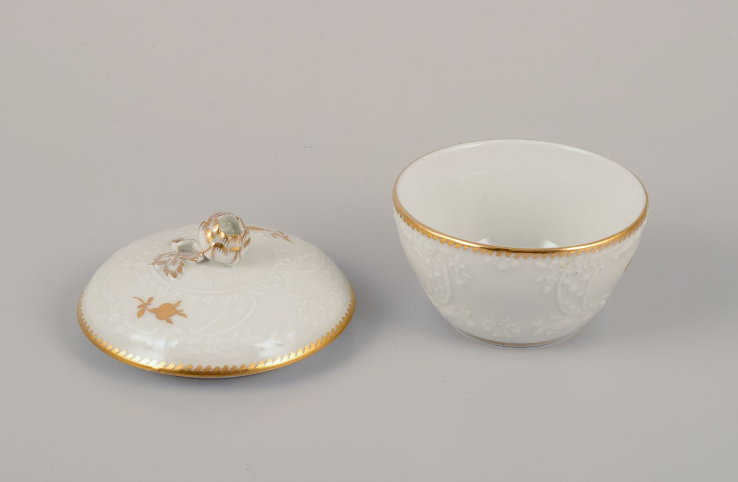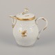Kaffesæt i porcelæn bestående af kaffekande, flødekande og sukkerskål. Hånddekoreret i guld med blomster i klassisk stil.