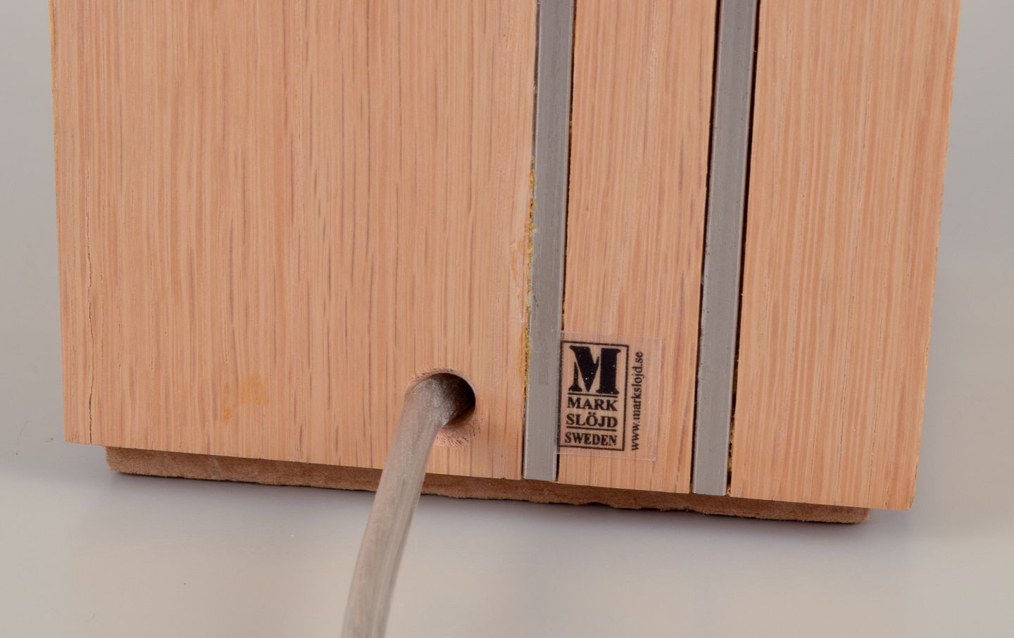 Markslöjd, Sverige. Et par bordlamper i lyst træ indlagt med stål, tekstilskærm. Sent 1900-tallet. I flot stand med minimalt brugspræg. Mål: H 29 cm. x B 12 cm.