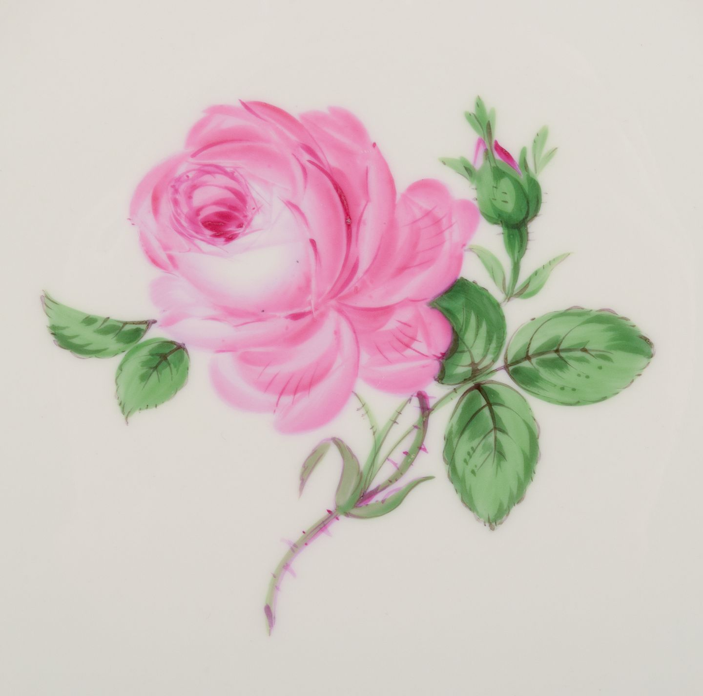 Meissen, Tyskland. Fire frokosttallerkner med motiv af lyserød rose. Guldkant. Ca. 1920/30’erne. I perfekt stand. Fremstår som nye. Stemplet. Tredje sortering. Mål: D 22,5 cm. x H 2,5 cm.