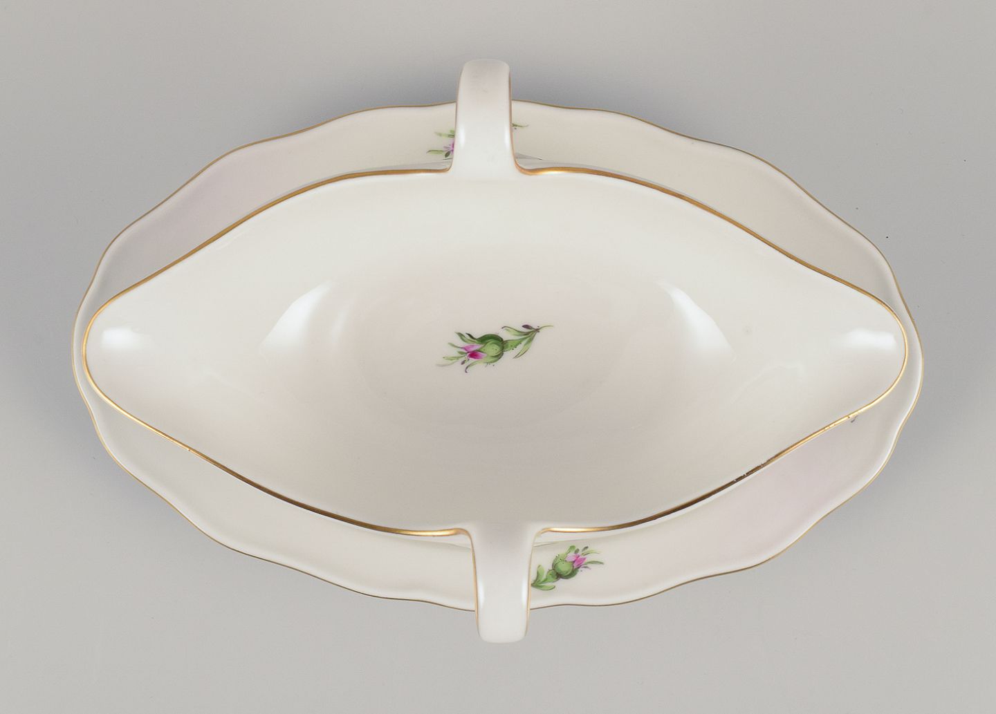 Meissen, Tyskland. Saucekande på fod med motiv af lyserød rose. Guldkant. Ca. 1920/30’erne. I perfekt stand. Fremstår som ny. Stemplet. Femte sortering. Mål: L 24,0 cm. x B 15,0 cm. x H 10,0 cm.