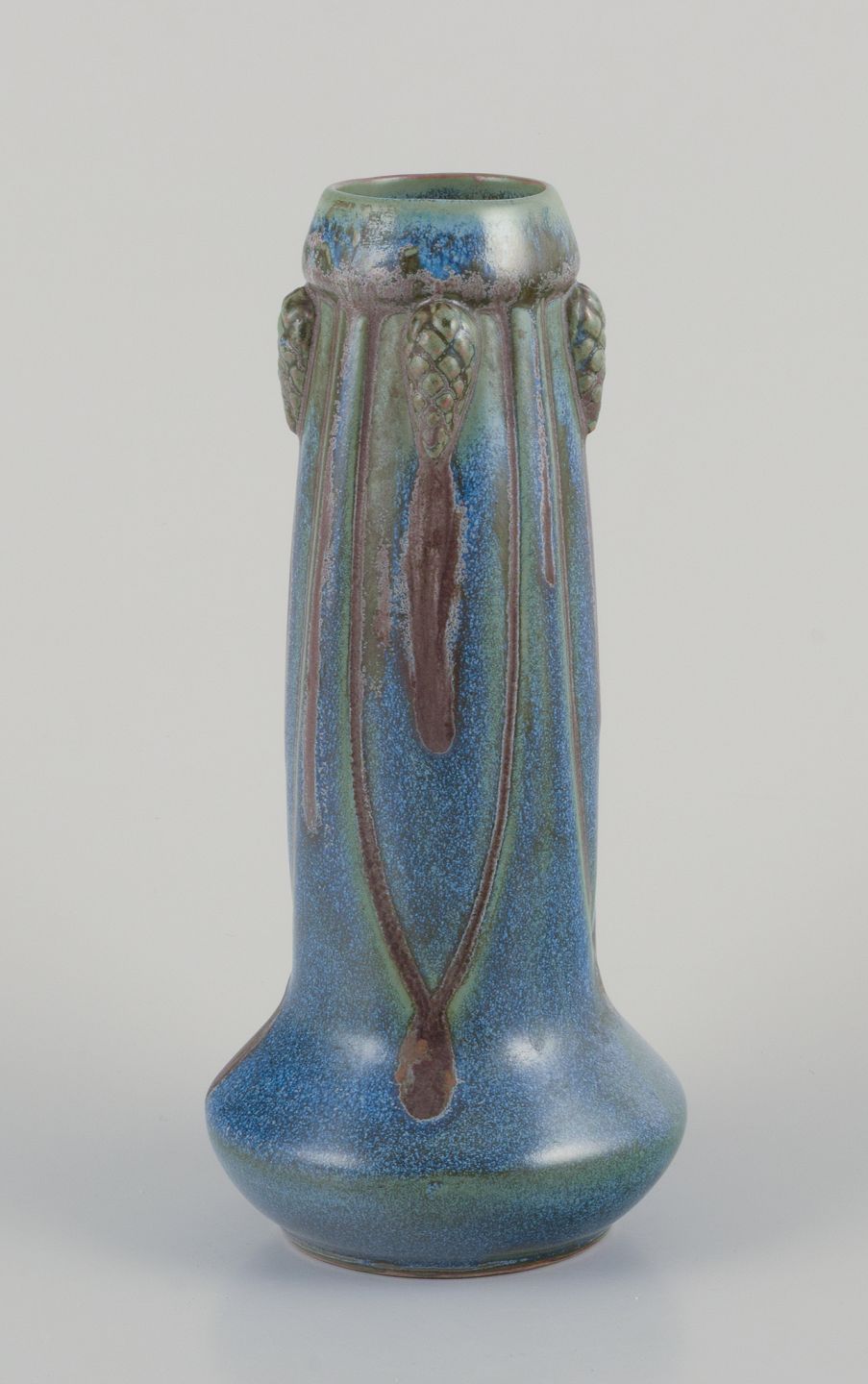 Fransk keramikvase med glasur i blå, grønne og brune nuancer.