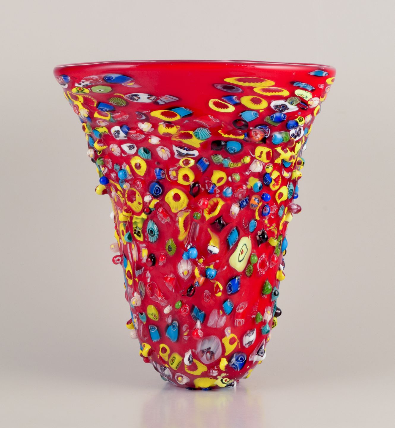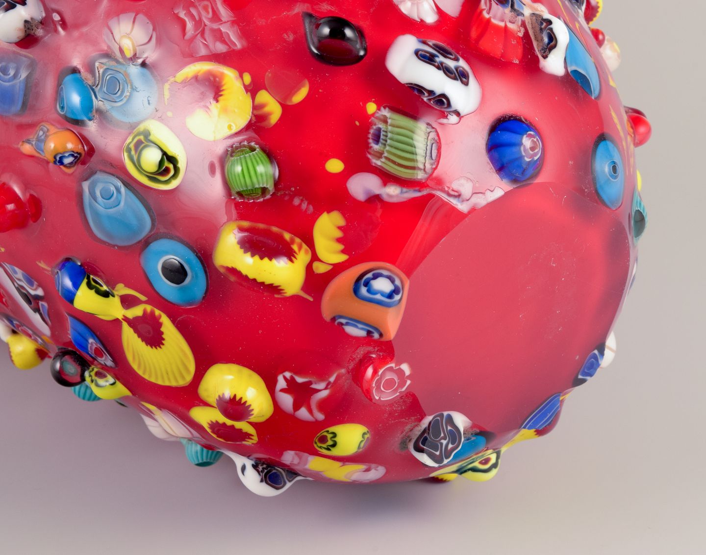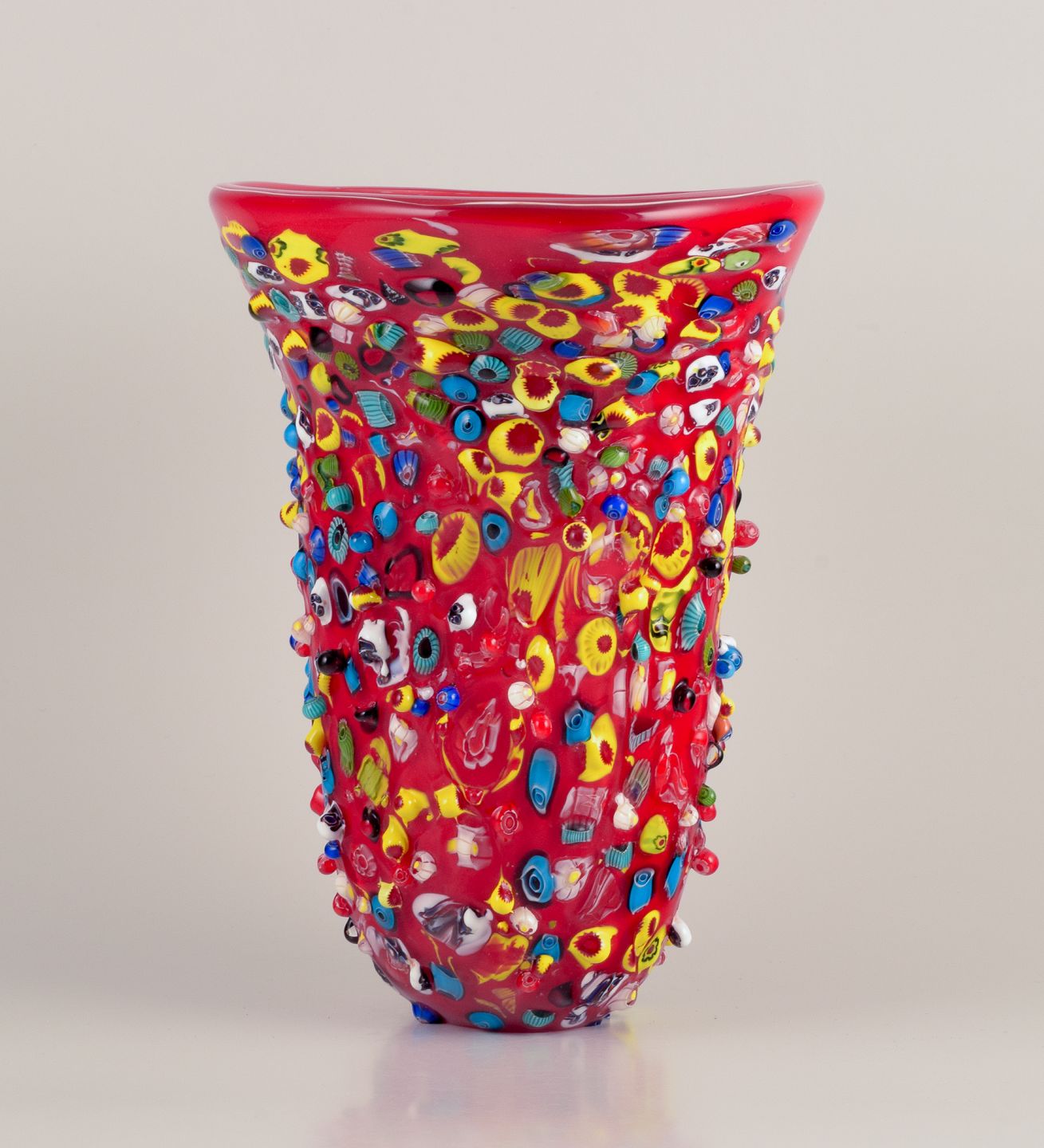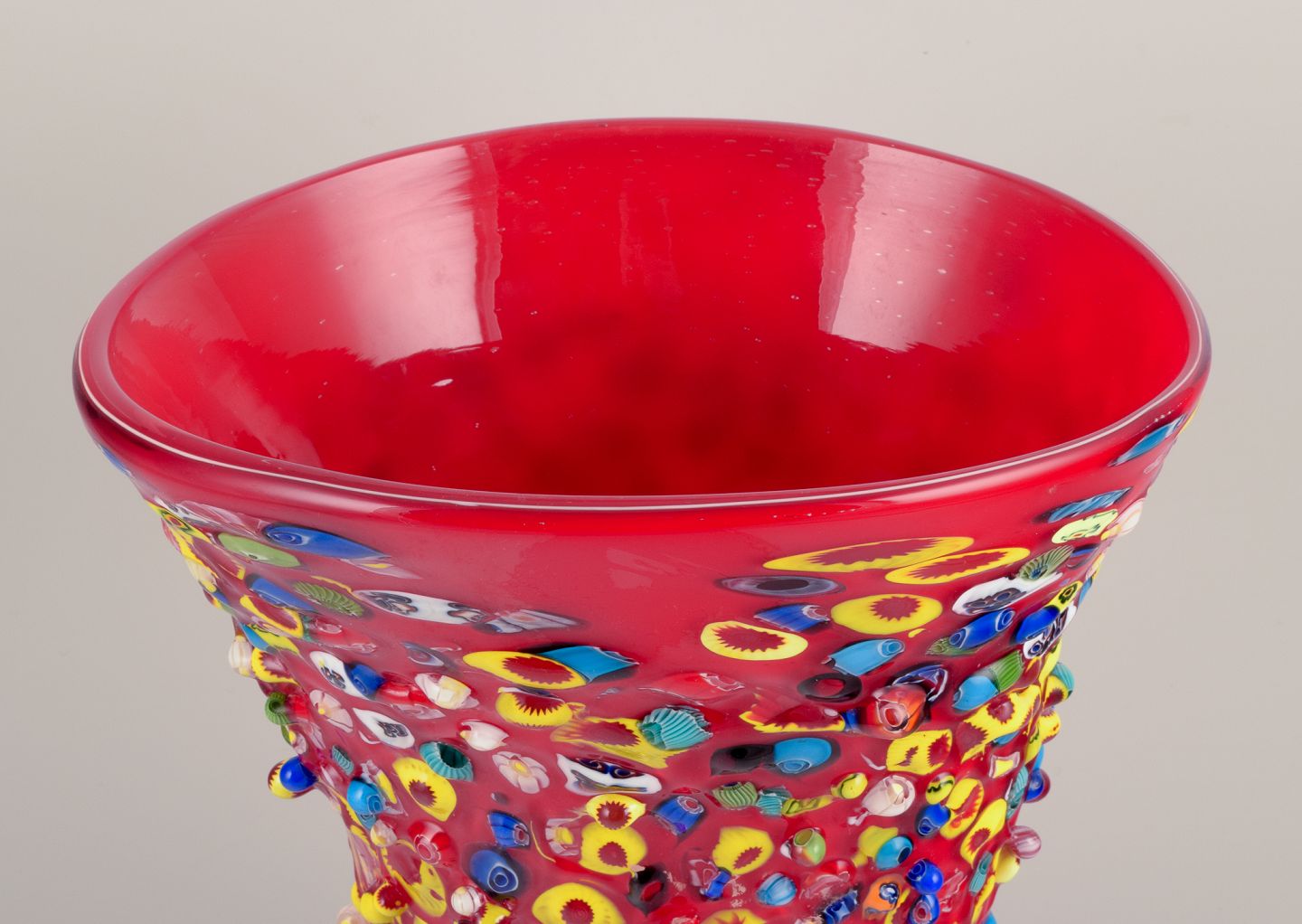 Murano, Italy. Large art glass vase. Red mouth-blown glass. Small figures in various colors. From the 1960s/1970s. Perfect condition. Dimensions: H 32.0 cm x W 28.0 cm.
