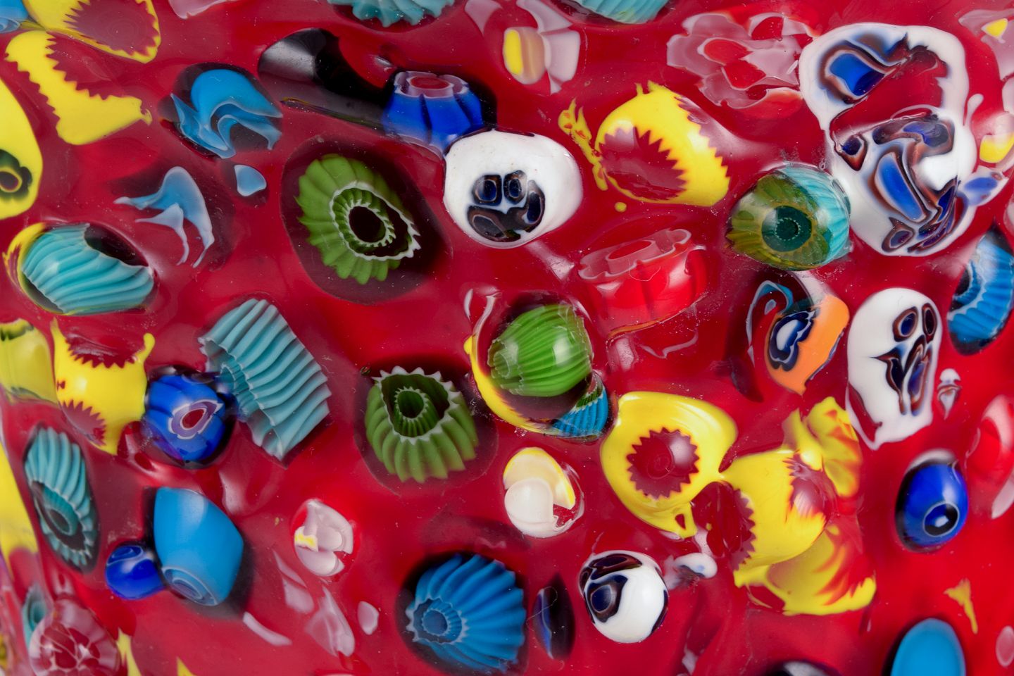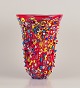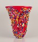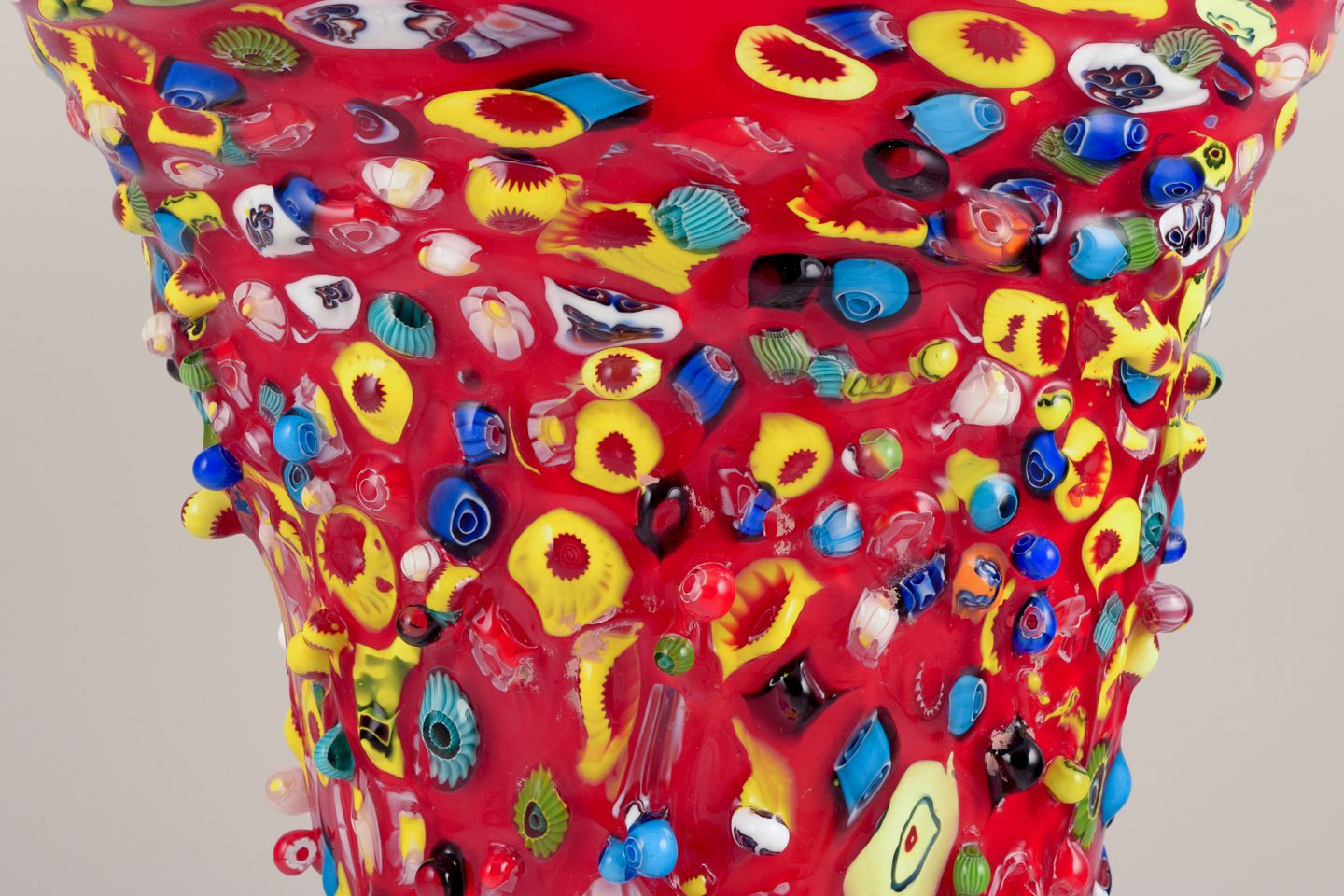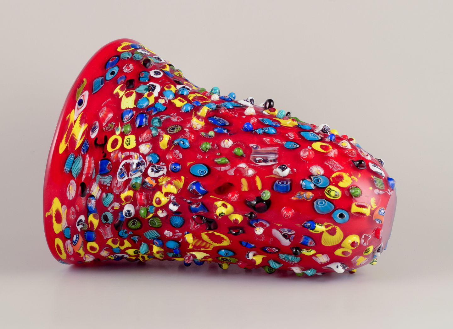Murano, Italy. Large art glass vase. Red mouth-blown glass. Small figures in various colors. From the 1960s/1970s. Perfect condition. Dimensions: H 32.0 cm x W 28.0 cm.