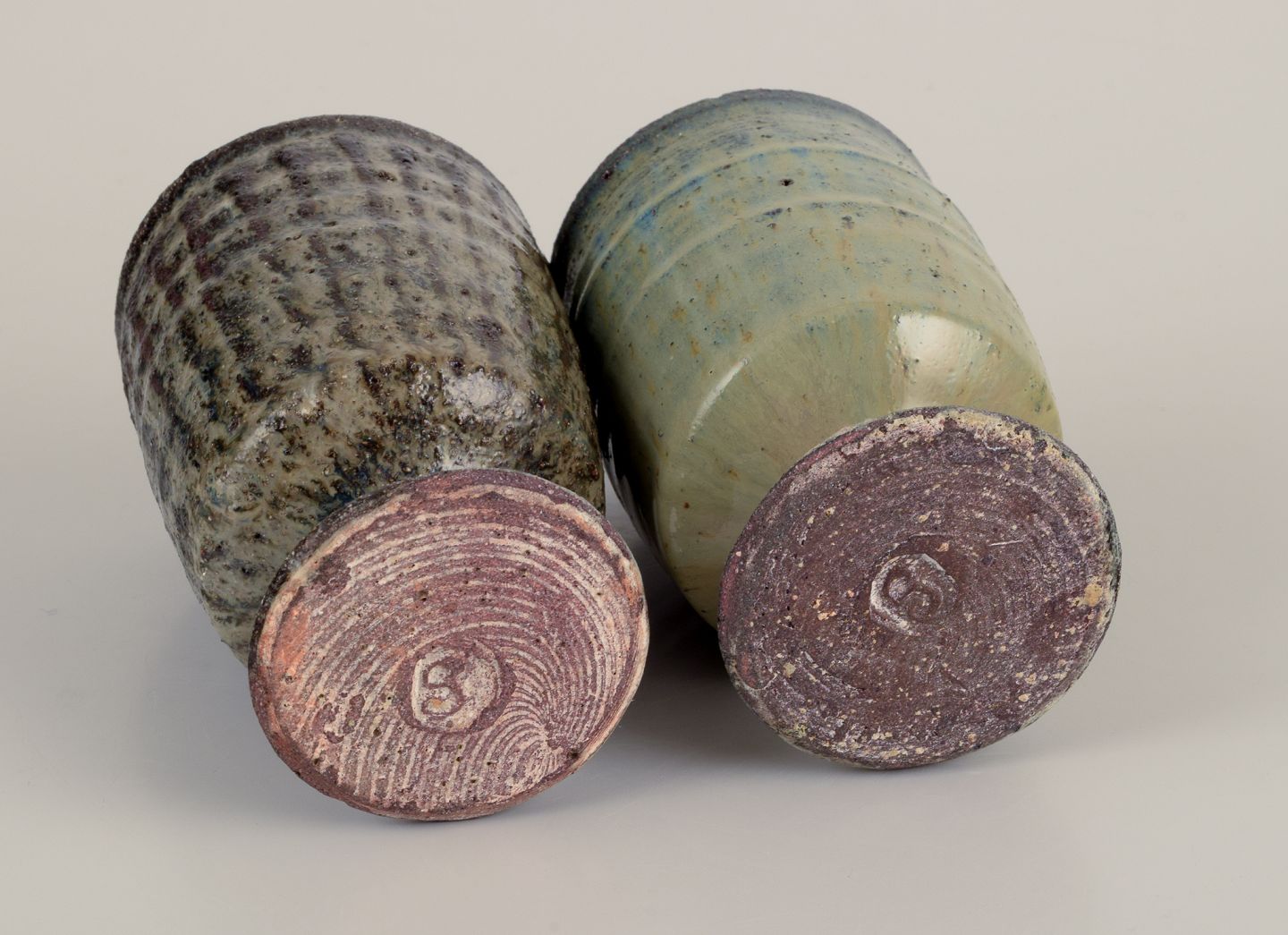 Gutte Eriksen, Danmark. To bægre i keramik, raku teknik, flydende lava glasur i brune toner. Ca. 1960. Stemplet. Perfekt stand. Højeste: H 10,0 cm. x D 6,0 cm.