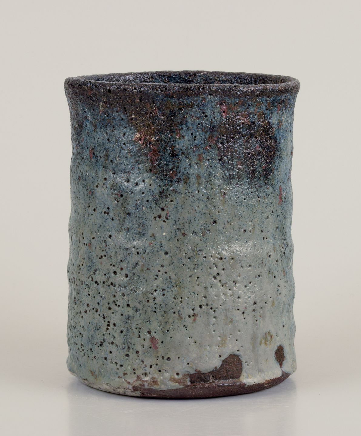 Gutte Eriksen, Danmark. Vase i keramik, raku teknik, flydende lava glasur i blågrå toner. Ca. 1960. Stemplet. Perfekt stand. Mål: 12,8 x 9,0 cm.