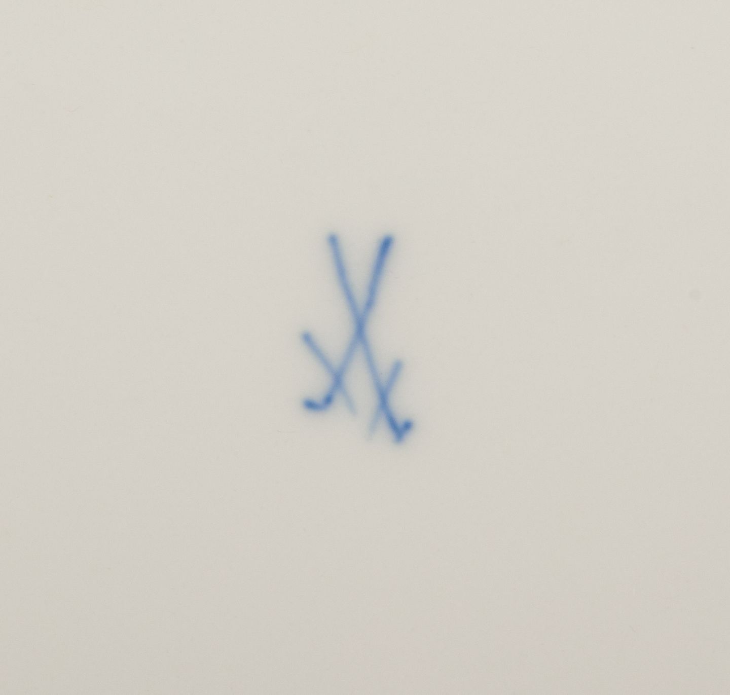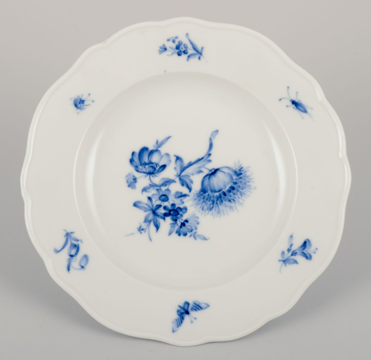Meissen, Tyskland. Et sæt på syv tallerkner i porcelæn. Håndmalet med blomstermotiver og insekter i blåt. 1920/30’erne. Stemplet. Første sortering. I perfekt stand. Mål: D 16,0 cm.