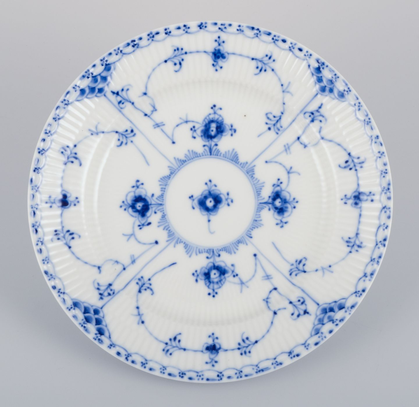 Royal Copenhagen Musselmalet Halvblonde, et sæt på seks frokosttallerkner. Modelnummer: 1/573. Datering: 1968 Stemplet. I perfekt stand. Anden sortering. Mål: D 19,0 cm.