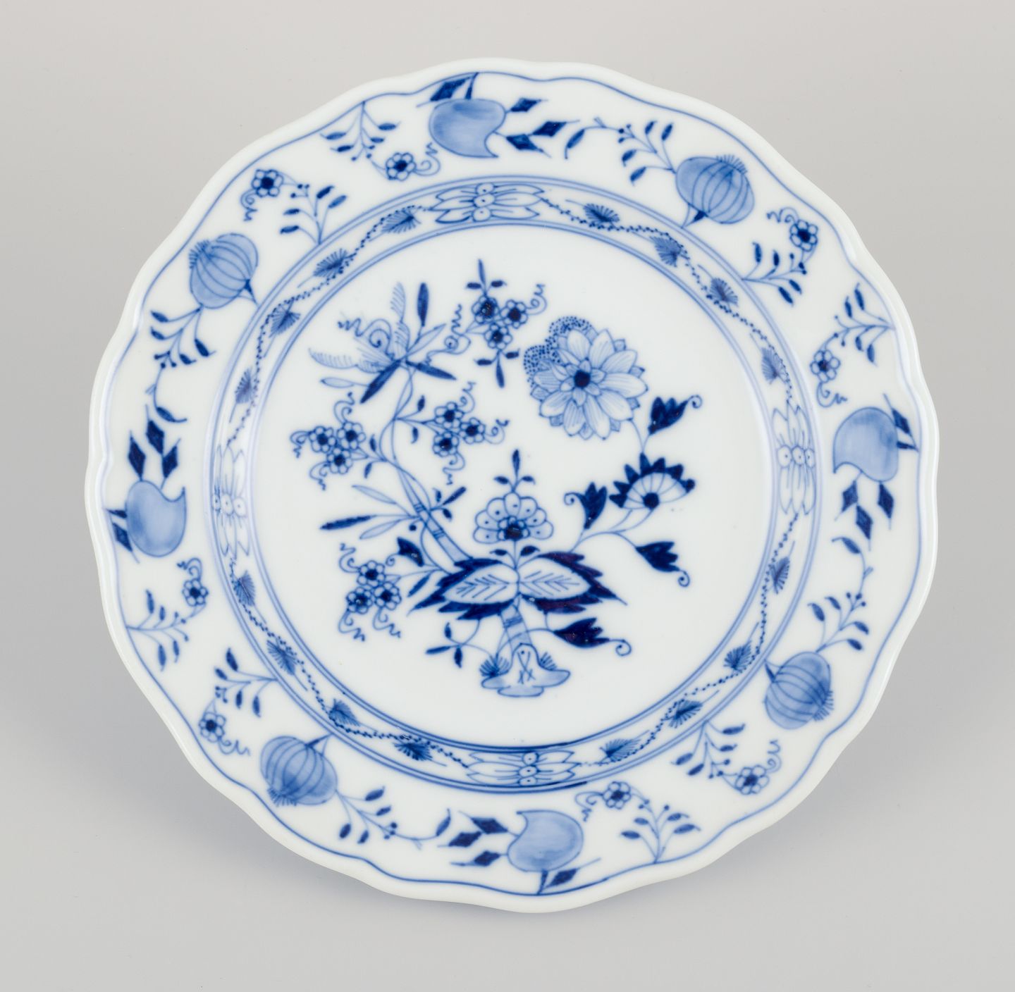Meissen, Tyskland. Løgmønstret. Fem tallerkner. Håndmalet i blåt. Ca. 1900. Stemplet. Perfekt stand. Tredje sortering. Mål: D 19,5 cm. x H 2,5 cm.