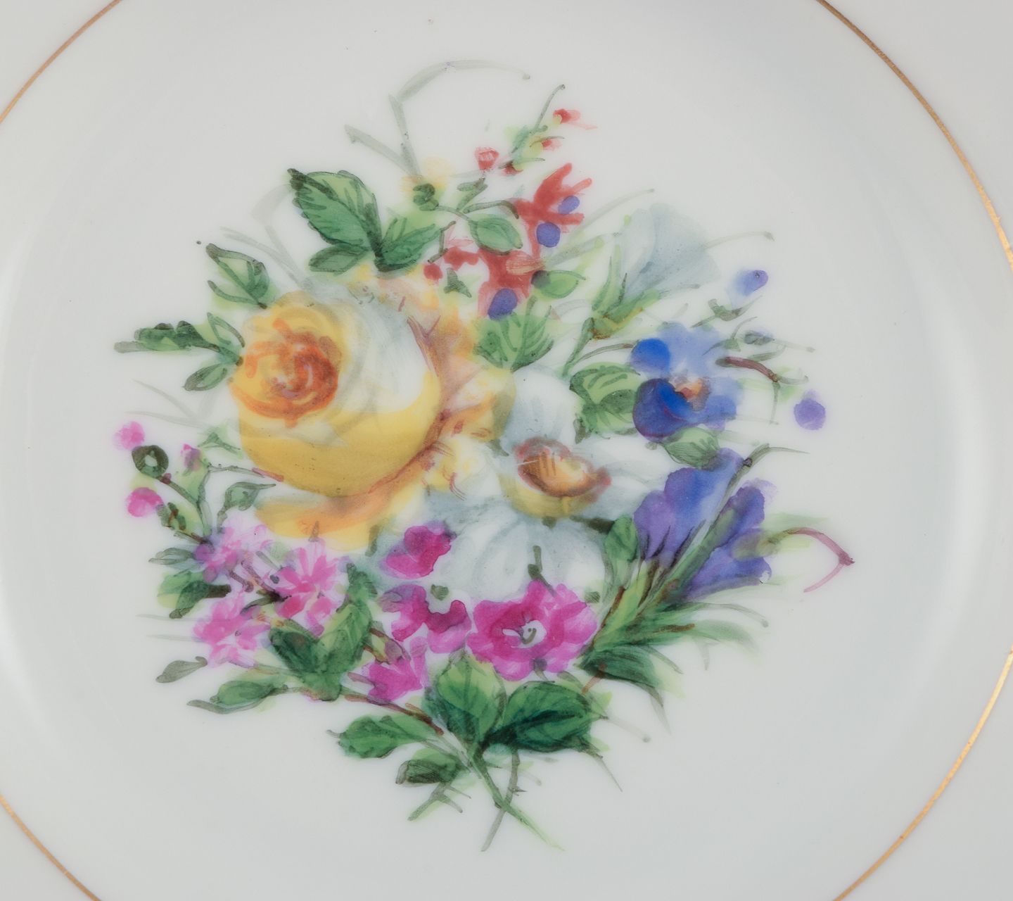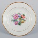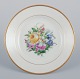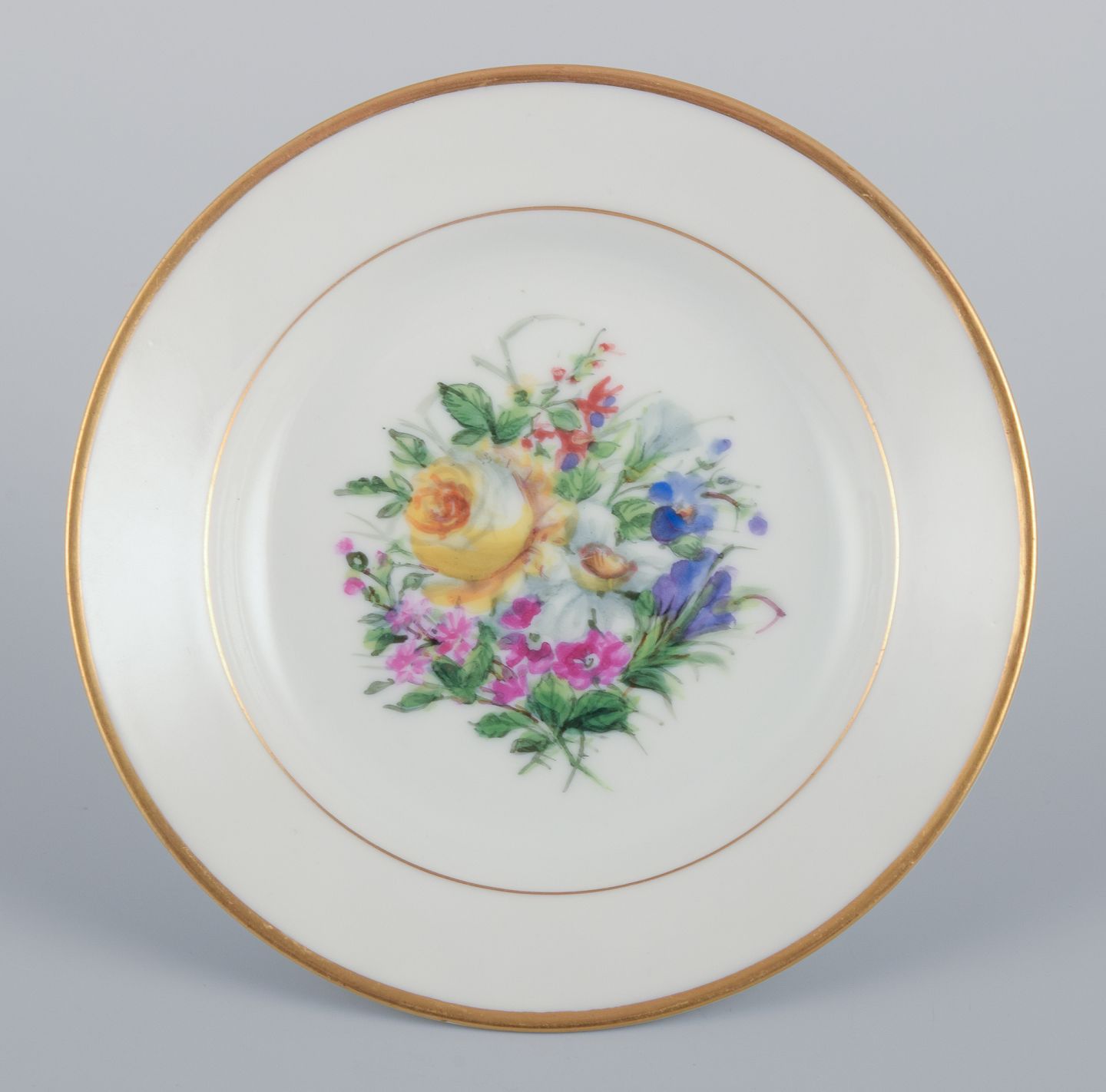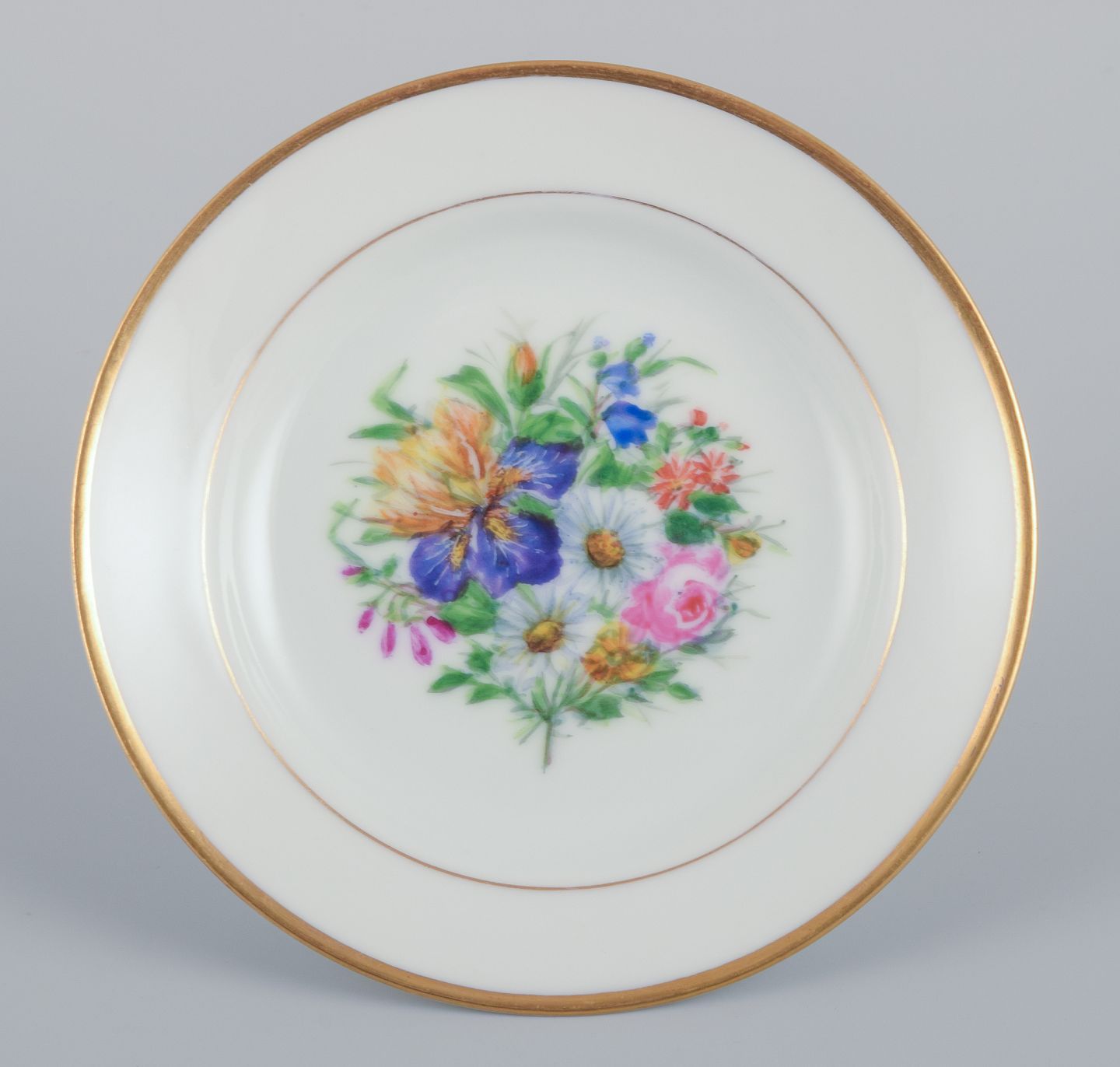 Bing & Grøndahl, et sæt på fire små tallerkner håndmalet med forskellige polykrome blomstermotiver og guldkant. Ca. 1920’erne. Stemplet. Første sortering. Perfekt stand. Mål: D 14,0 cm. x H 2,2 cm.