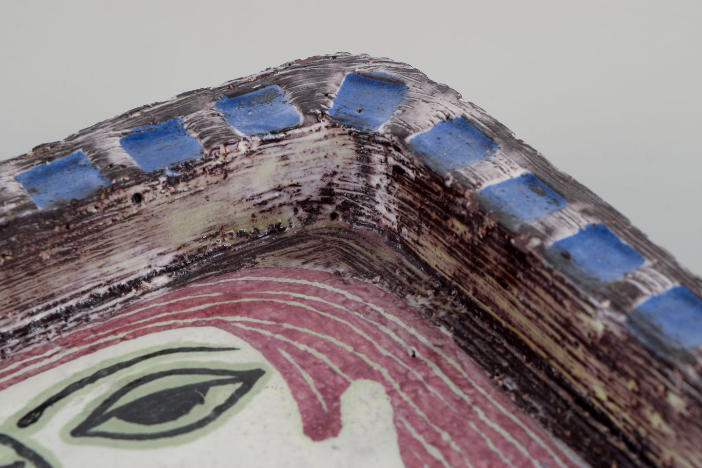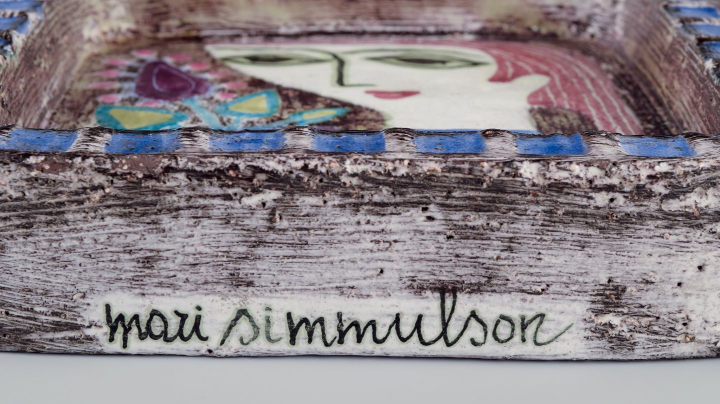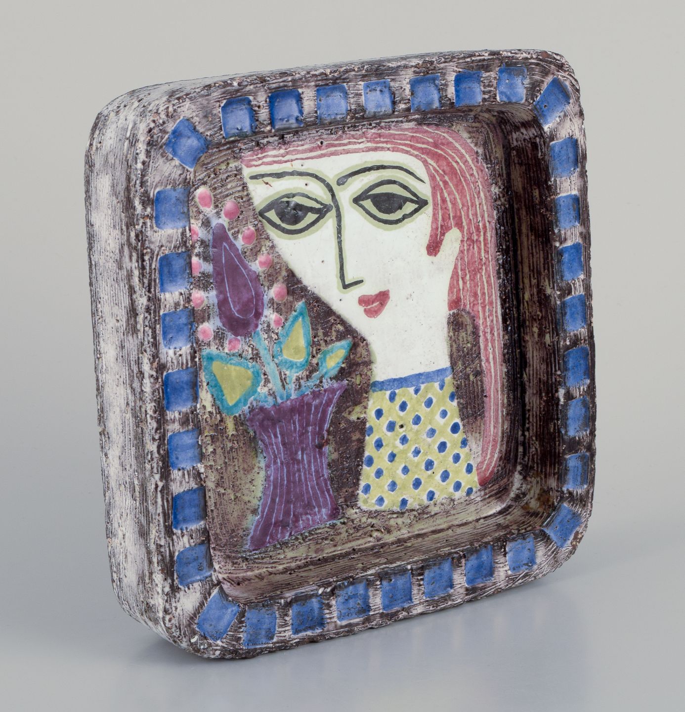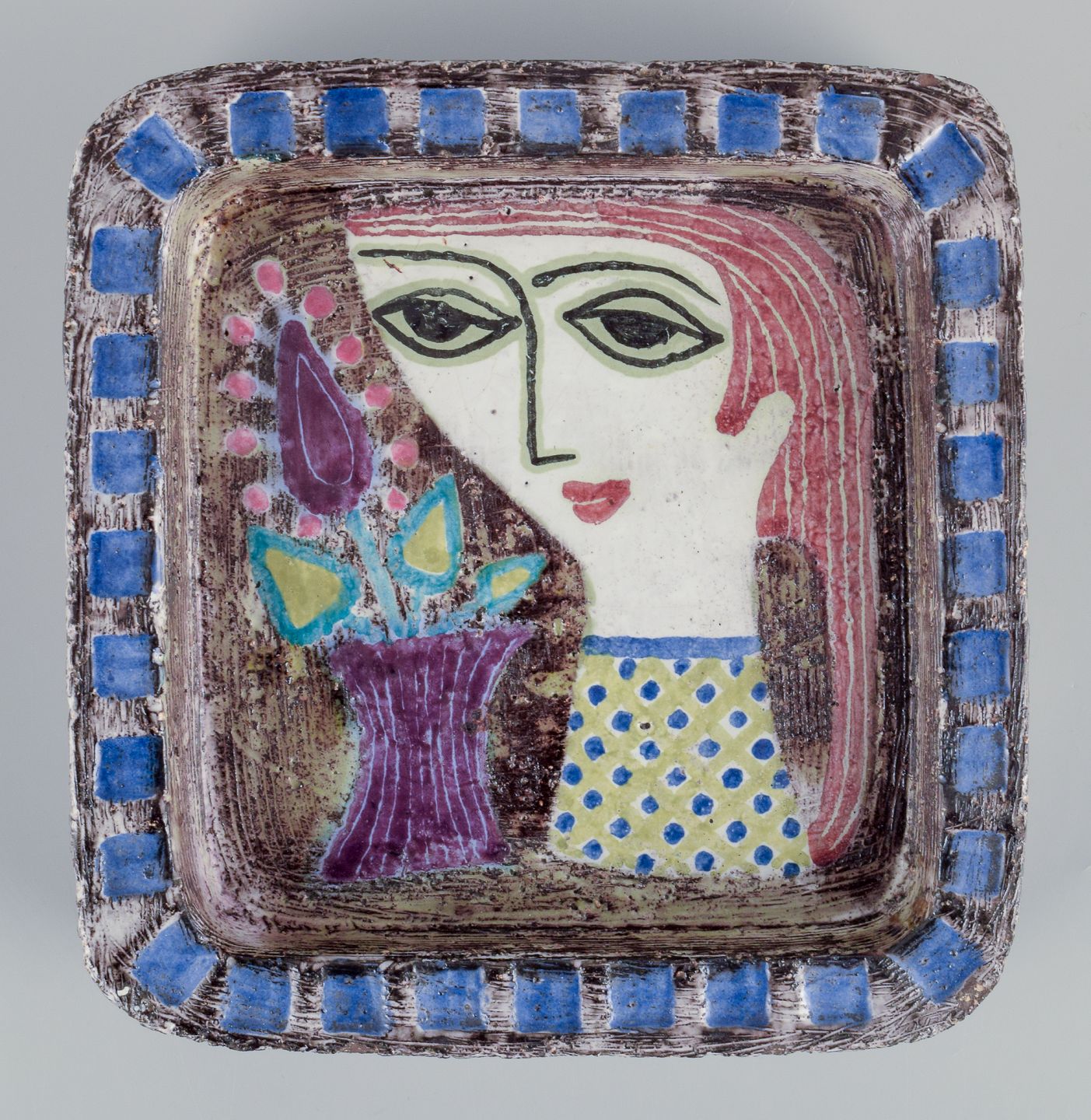 Mari Simmulson (1911-2000) for Upsala Ekeby. Keramikfad med motiv af kvinde og blomster i vase. Polykrom glasur. Ca. 1960. Model 4156. Stemplet. Perfekt stand. Mål: 18,0 cm. x 17,5 cm. x H 4,0 cm.