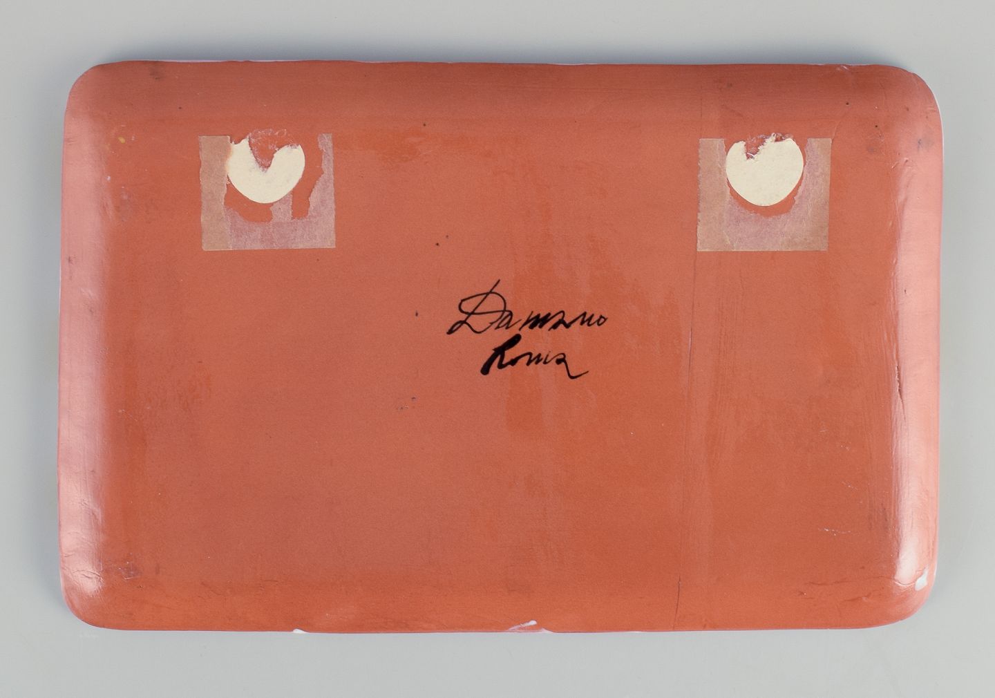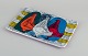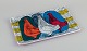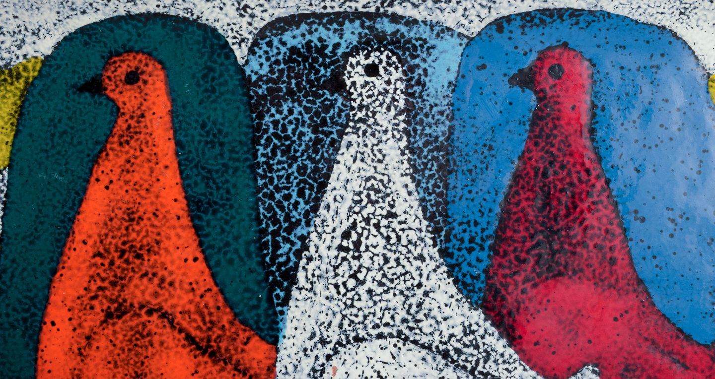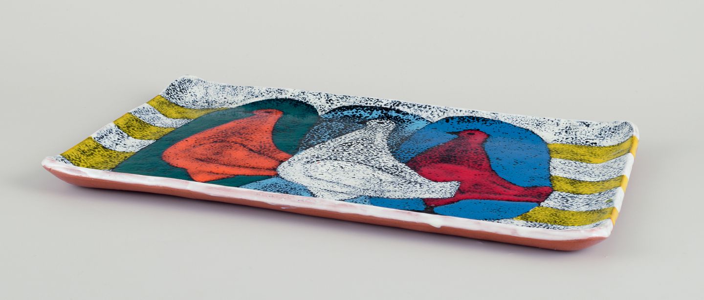 Italiensk studiokeramik, fad. Motiv af tre duer. Håndglaseret. Polykrom glasur. Ca. 1970. Perfekt stand. Signeret. Mål: B 31,5 cm. x D 20,5 cm. x H 2,0 cm.