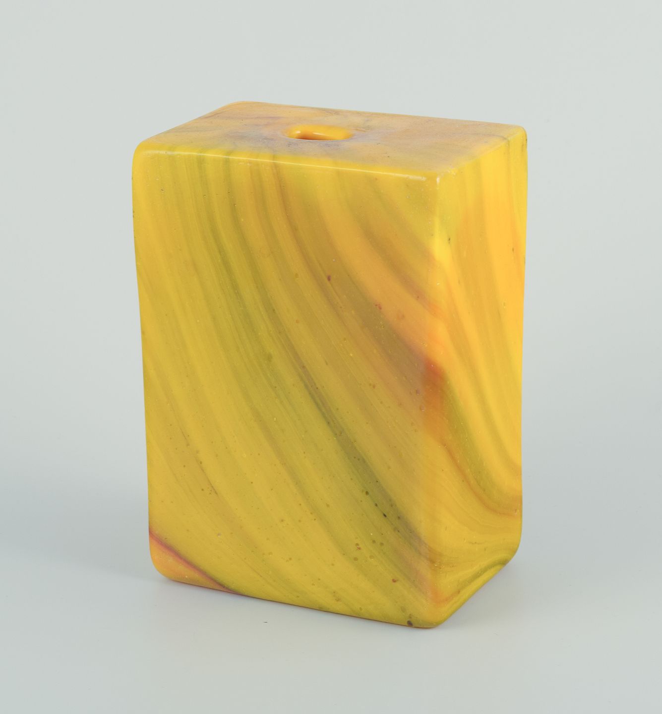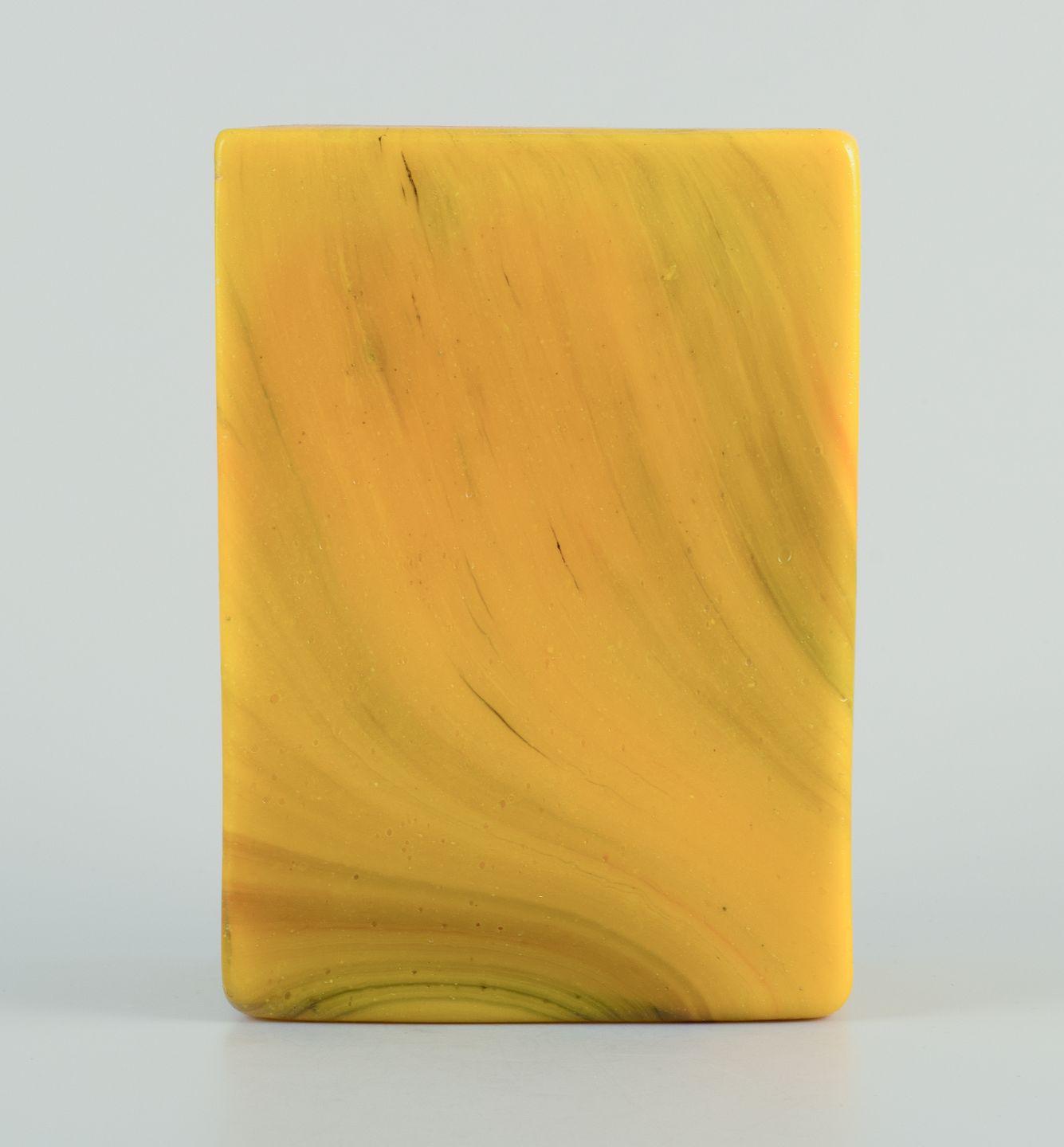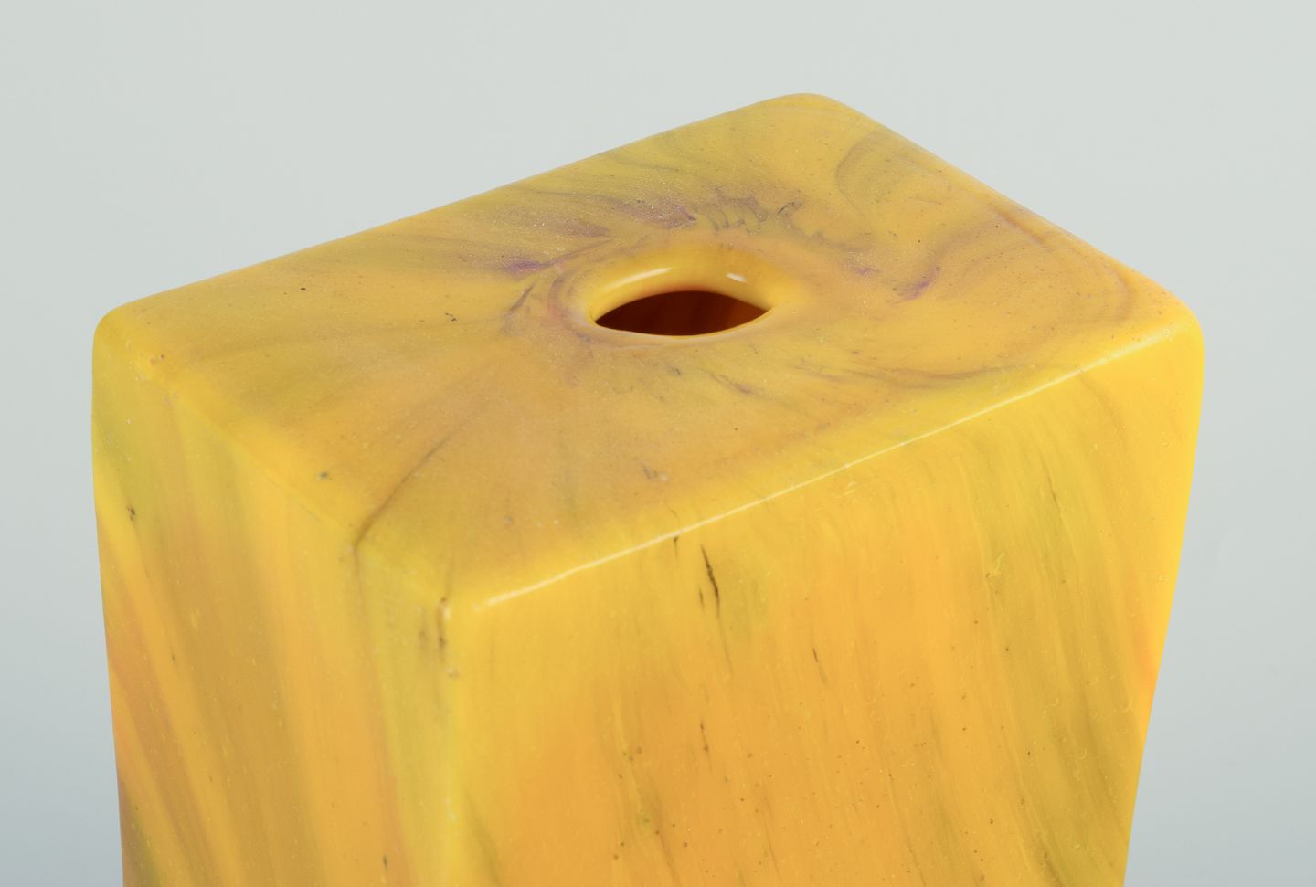 Per Lütken for Holmegaard. Firkantet kunstglasvase, lava-serien. Glas i gule nuancer. Ca. 1960. I flot stand. Usigneret. Mĺl: H 17,0 cm. x B 12,0 cm. x D 8,0 cm. Proveniens: dansk privatsamling.
