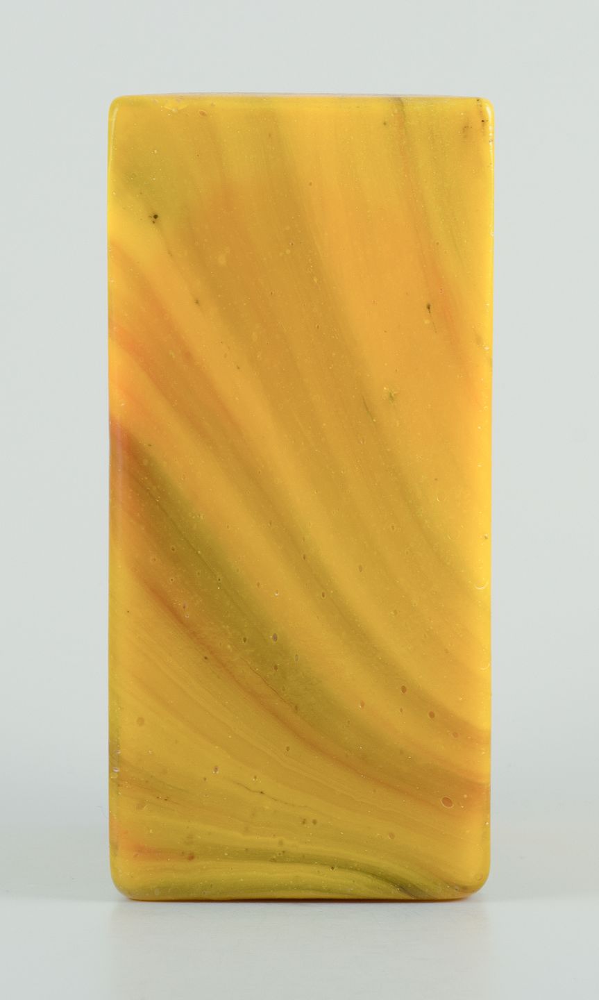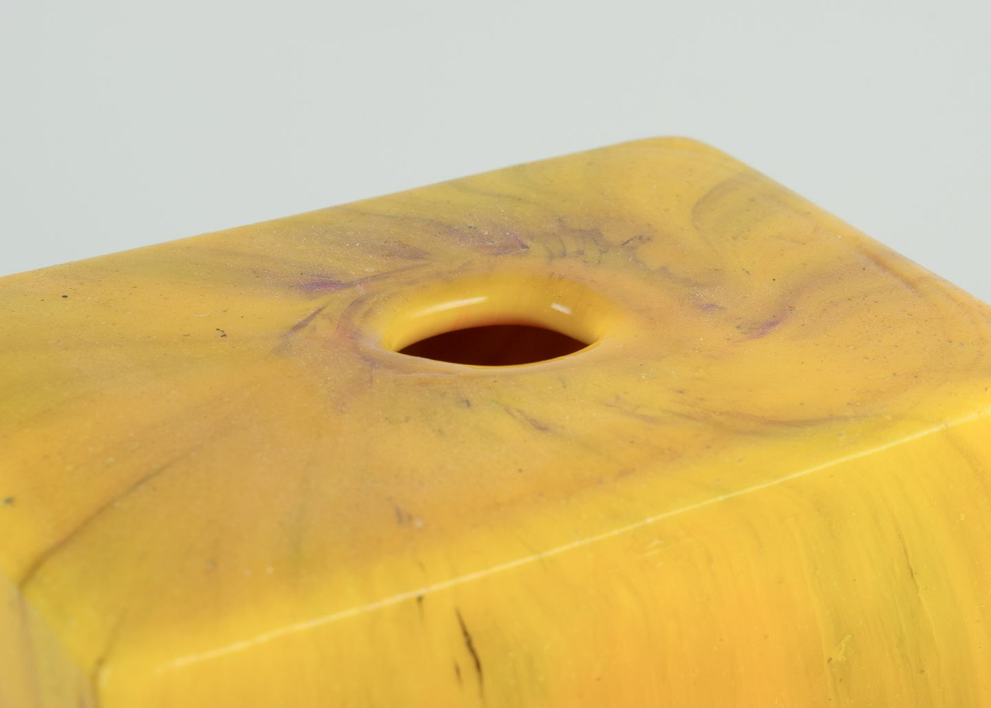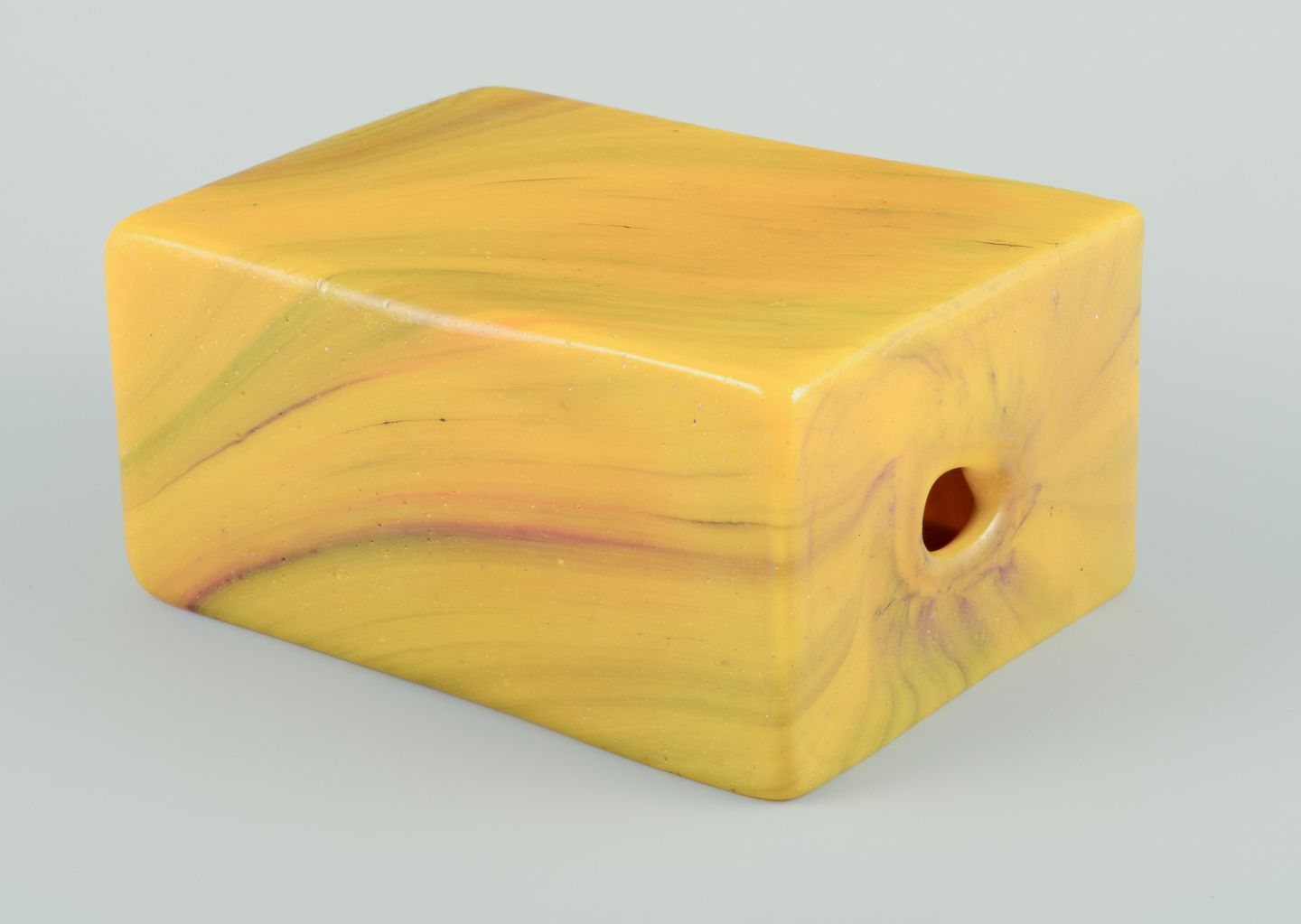 Per Lütken for Holmegaard. Firkantet kunstglasvase, lava-serien. Glas i gule nuancer. Ca. 1960. I flot stand. Usigneret. Mĺl: H 17,0 cm. x B 12,0 cm. x D 8,0 cm. Proveniens: dansk privatsamling.