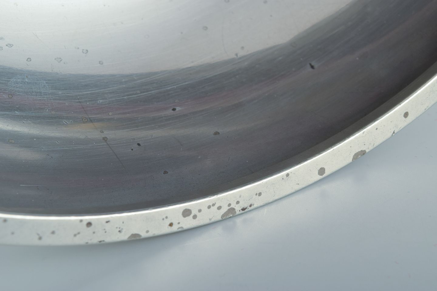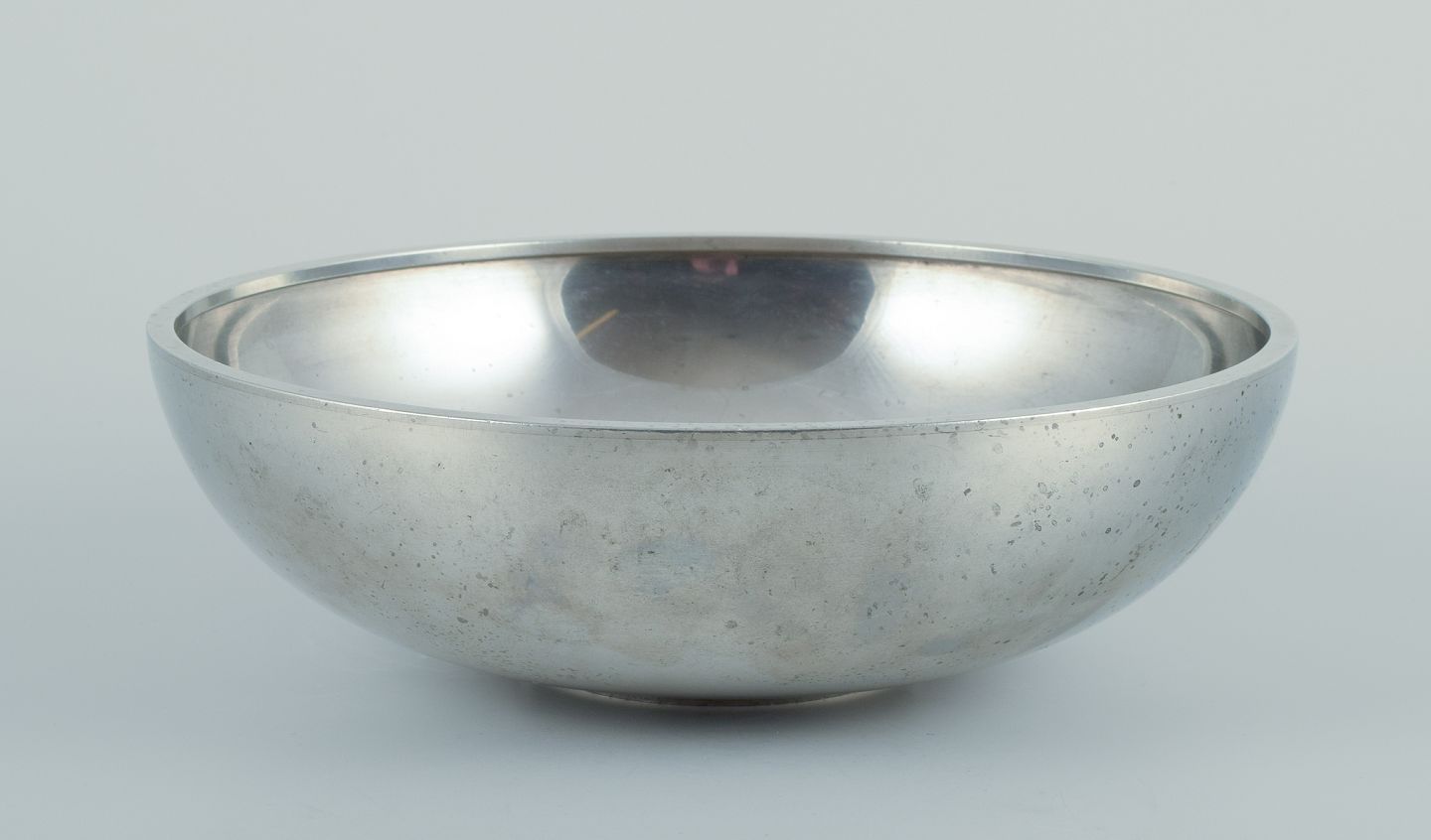 Henning Koppel for Georg Jensen, stor og sjælden skål i tin. Modernistisk design. Stilrent dansk design. 1960'erne. Stemplet. I flot stand med brugspræg. Mål: D 26,0 cm. x H 8,0 cm.