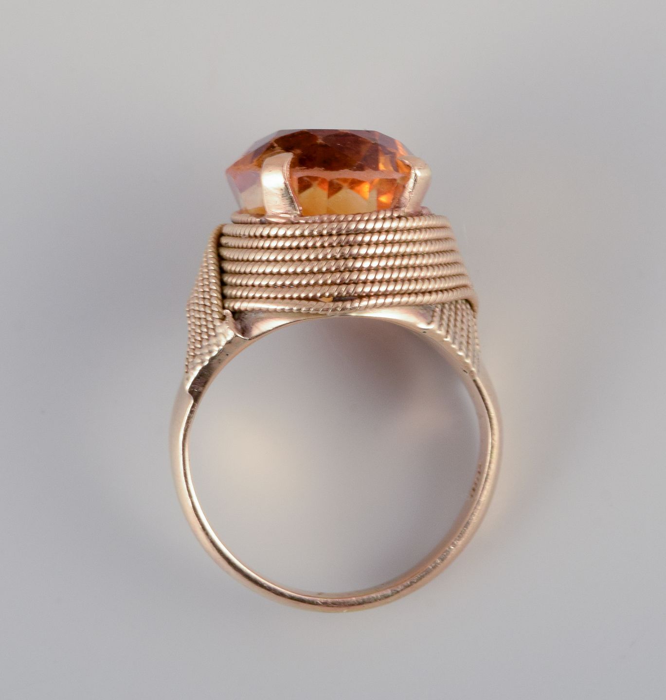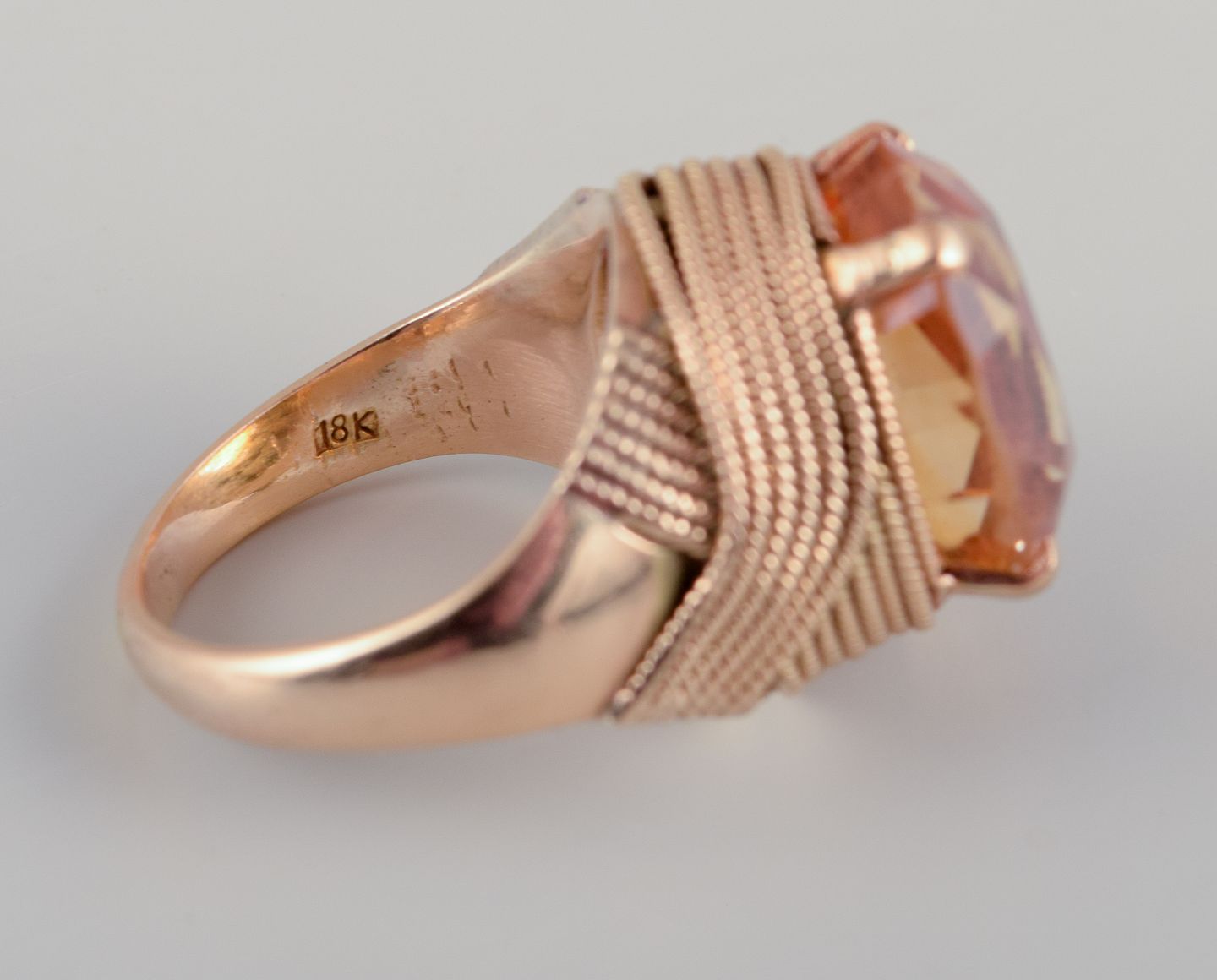Svensk guldsmed. Stor 18 karat cocktailring prydet med facetslebet ravfarvet citrin. Bånddekoration. Midt 1900-tallet. Stemplet 18K Perfekt stand. Vægt: 8.5 gram Mål: 16 mm. / 50 U
