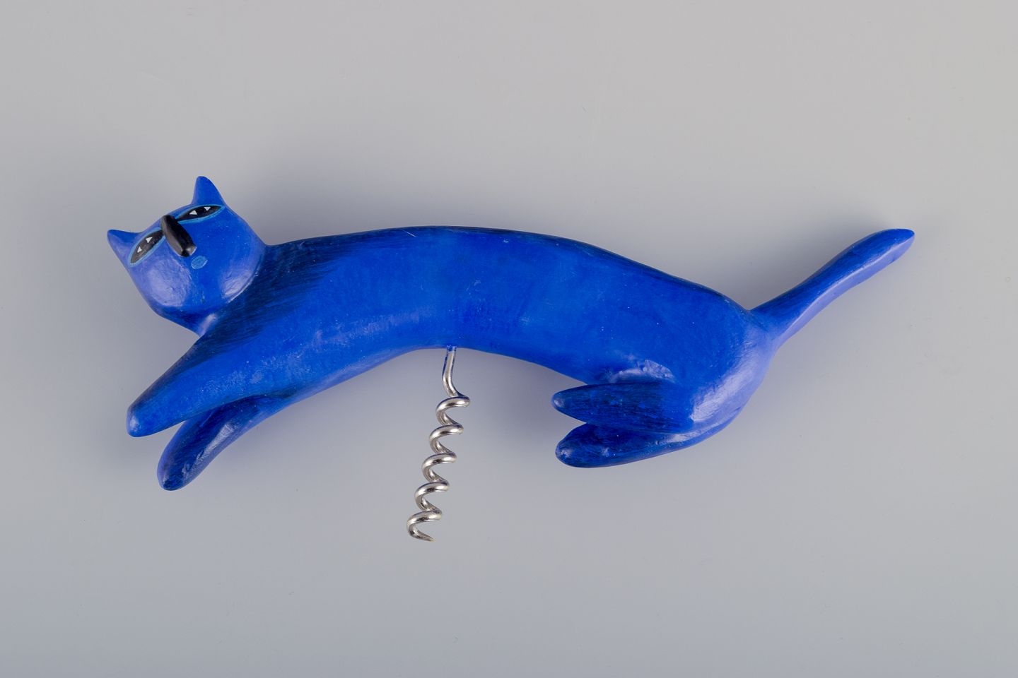 Blå kat (proptrækker) og to røde fugle (monteret på korkpropper).
