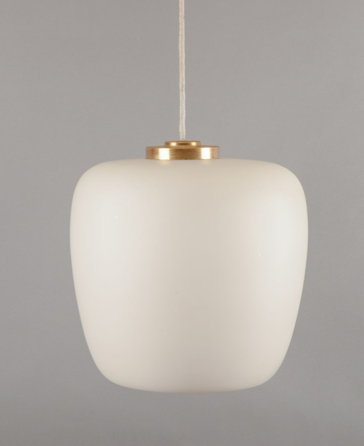 Fog & Mørup pendel i matteret opalglas med montage i messing. Stor model. Midt 1900-tallet. Fremstår i flot stand. Måler: D 31 cm x H 31 cm.