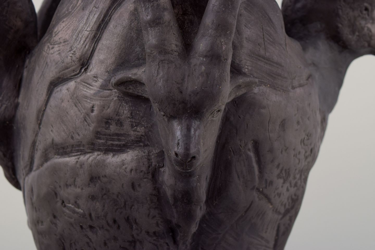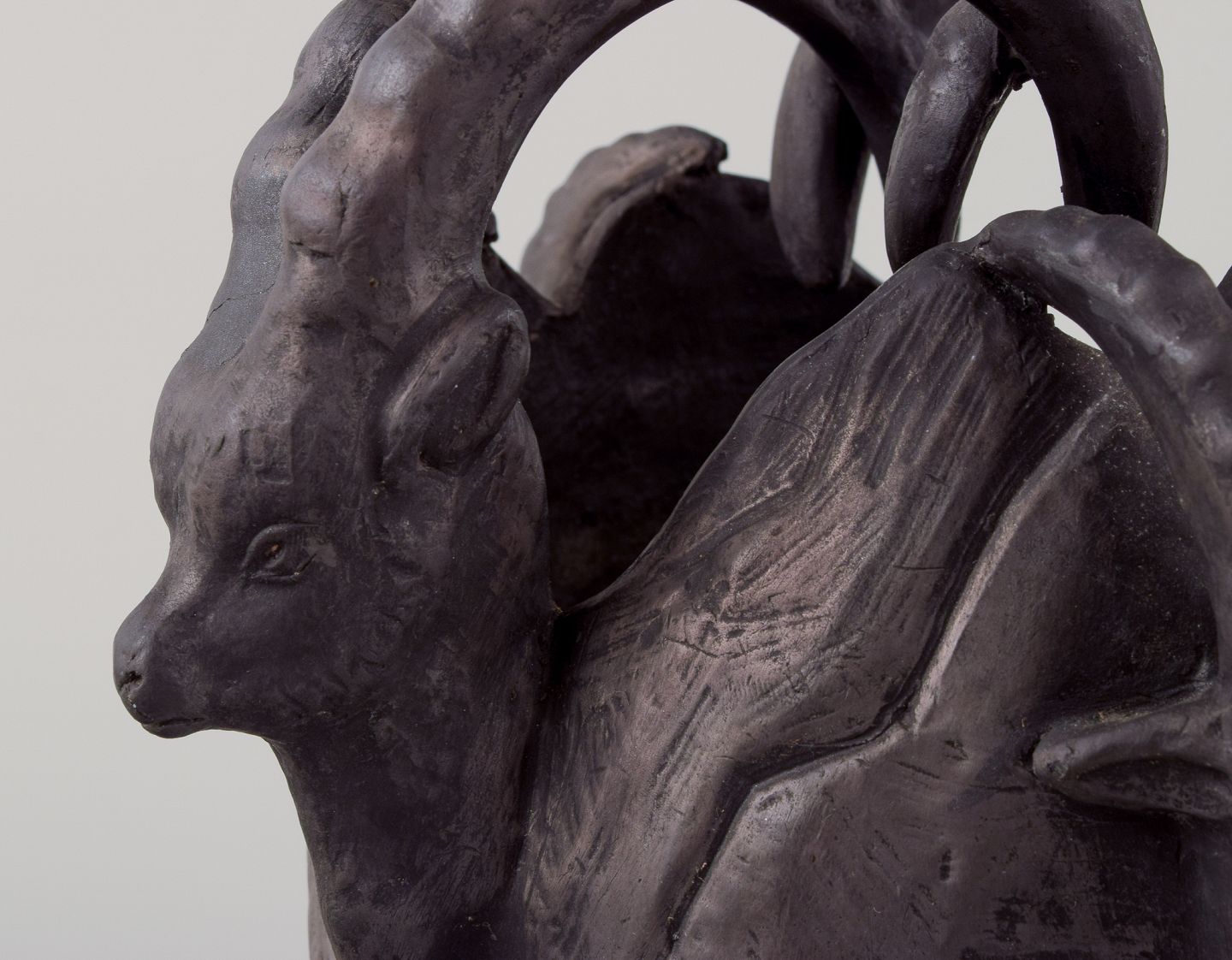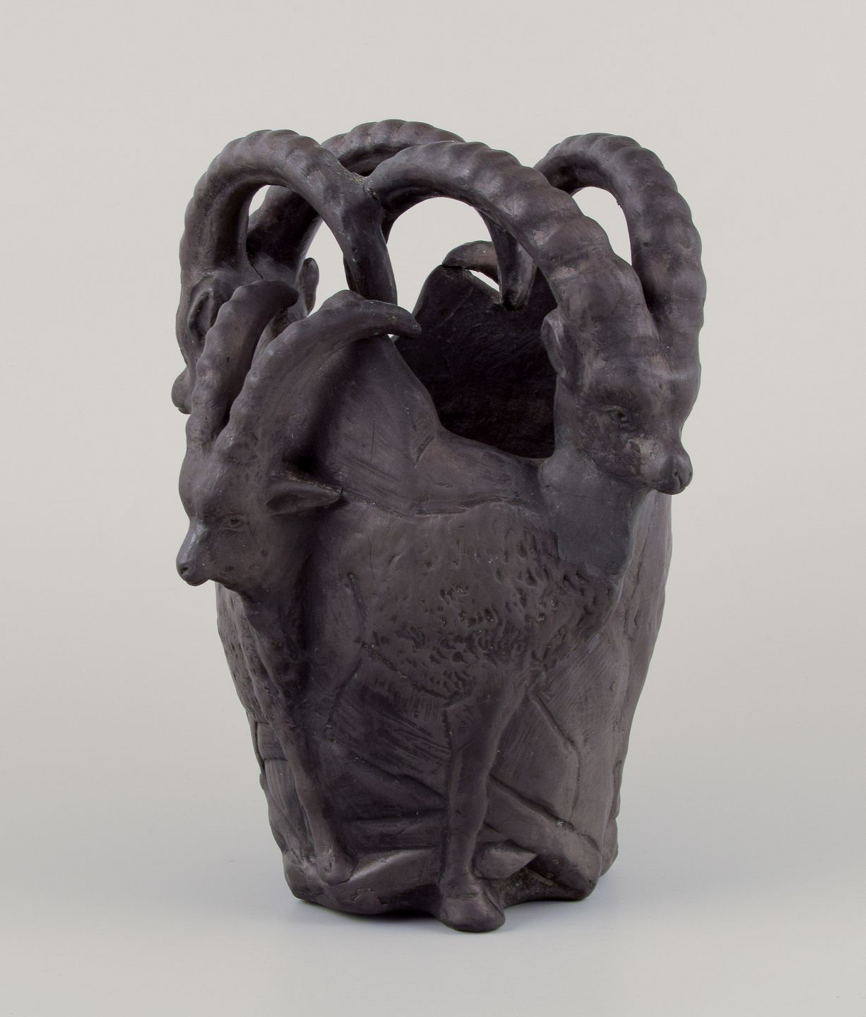 Hjorth, Bornholm. Skønvirke vase i sort terrakotta med motiv af stenbukke. Tidligt 1900-tallet. Stemplet. I flot stand med minimalt brugspræg. Mål: H 23,0 cm. x B 21,0 cm.