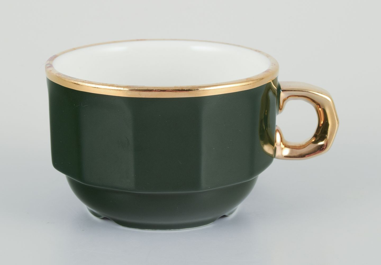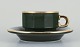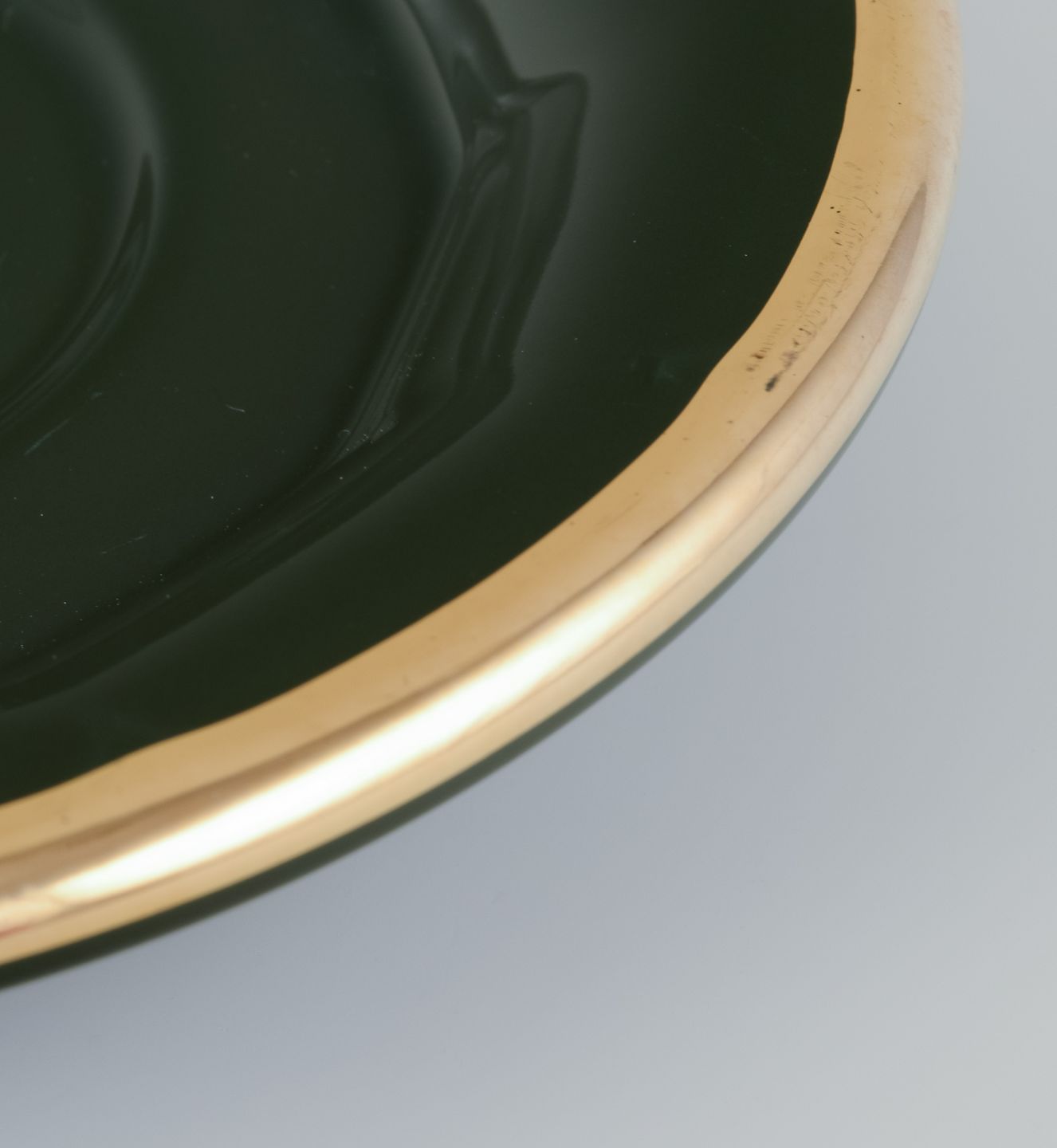 ”Grøn Bistro” porcelæn. Mørkegrøn glasur med gulddekoration.