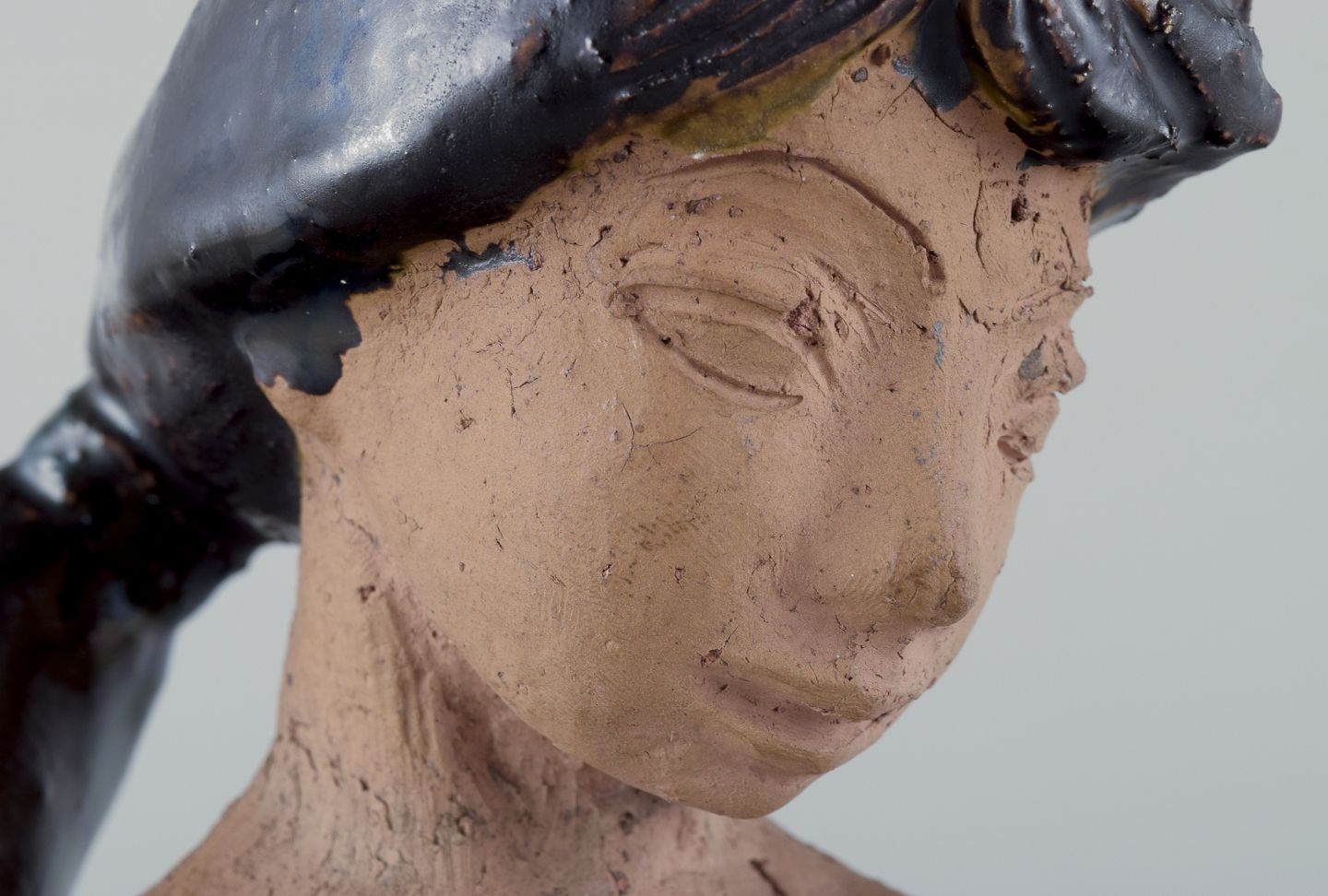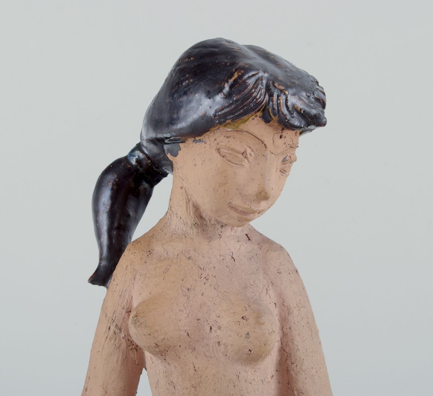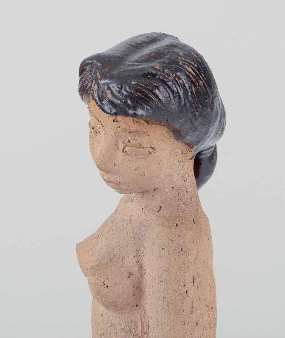 Unique figure of partially glazed earthenware modelled in the shape of a naked woman with a cloth.