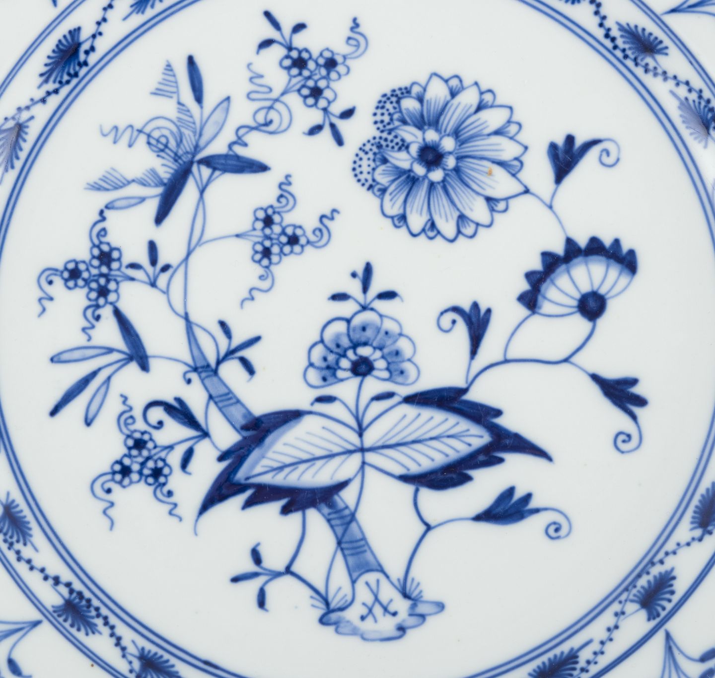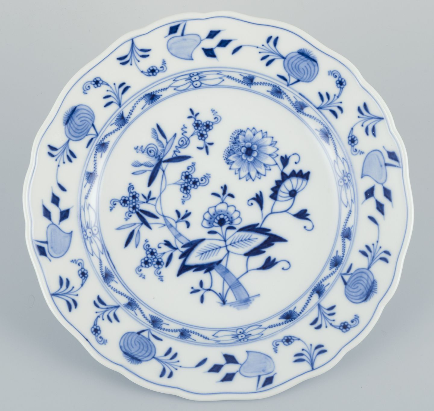 Meissen, Tyskland. Et sæt på fem Løgmønstret middagstallerkner i porcelæn. Håndmalet.